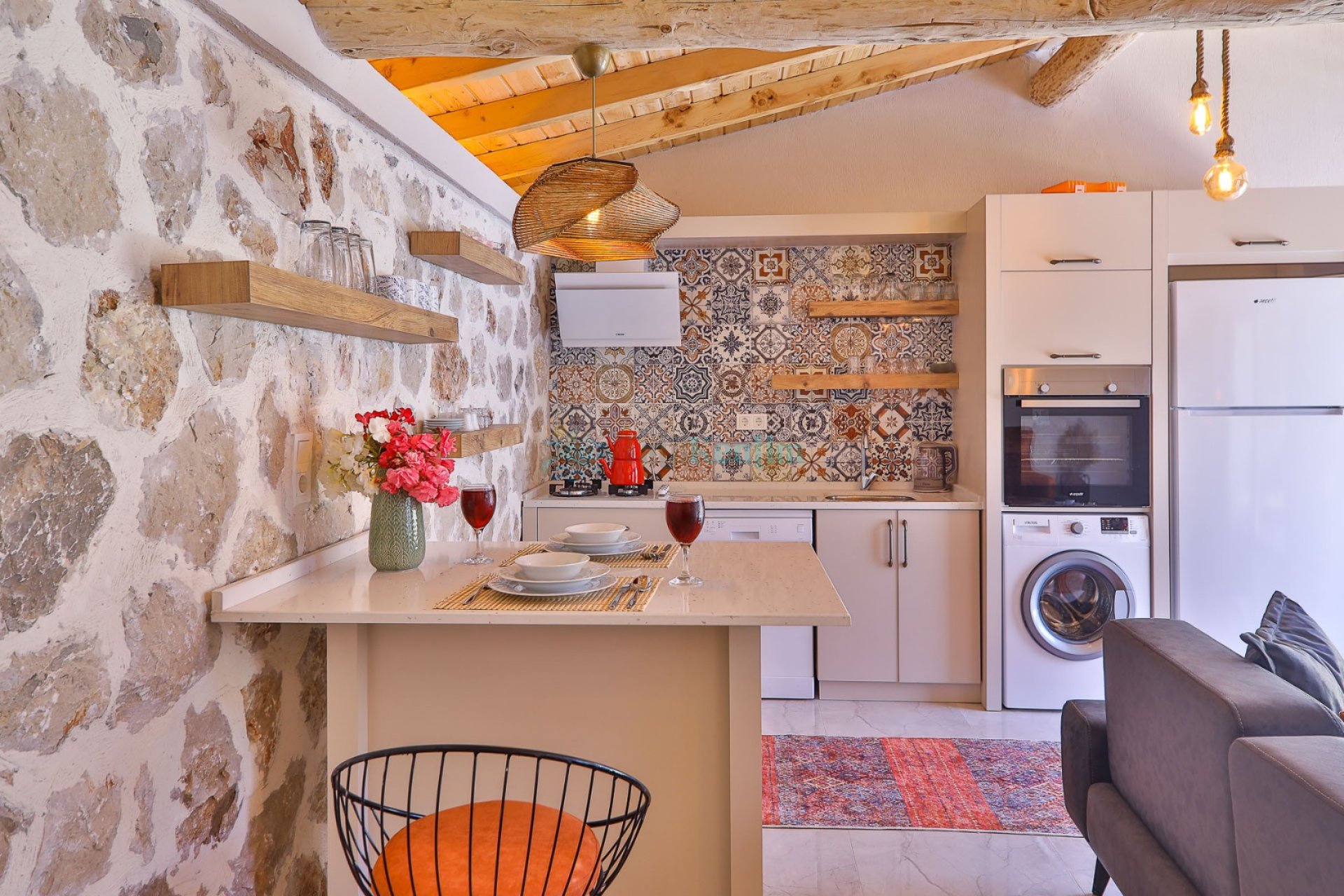 Amerikan mutfak içerisinde, buzdolabı, bulaşık makinası, çamaşır makinası, yemek masası, yemek takımı, ankastre fırın, tost makinası, ankastre ocak, çaydanlık, su ısıtıcısı, tava, tencere takımı ve gerekli olan tüm mutfak gereçleri yer almaktadır.