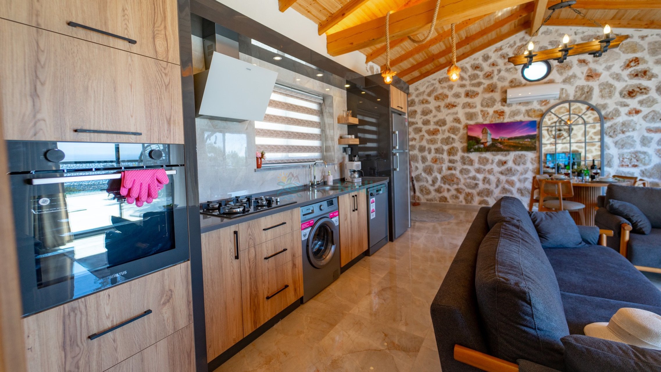 Amerikan mutfak içerisinde, buzdolabı, bulaşık makinası, çamaşır makinası, yemek masası, yemek takımı, ankastre fırın, tost makinası, ankastre ocak, çaydanlık, su ısıtıcısı, tava, tencere takımı ve gerekli olan tüm mutfak gereçleri yer almaktadır.