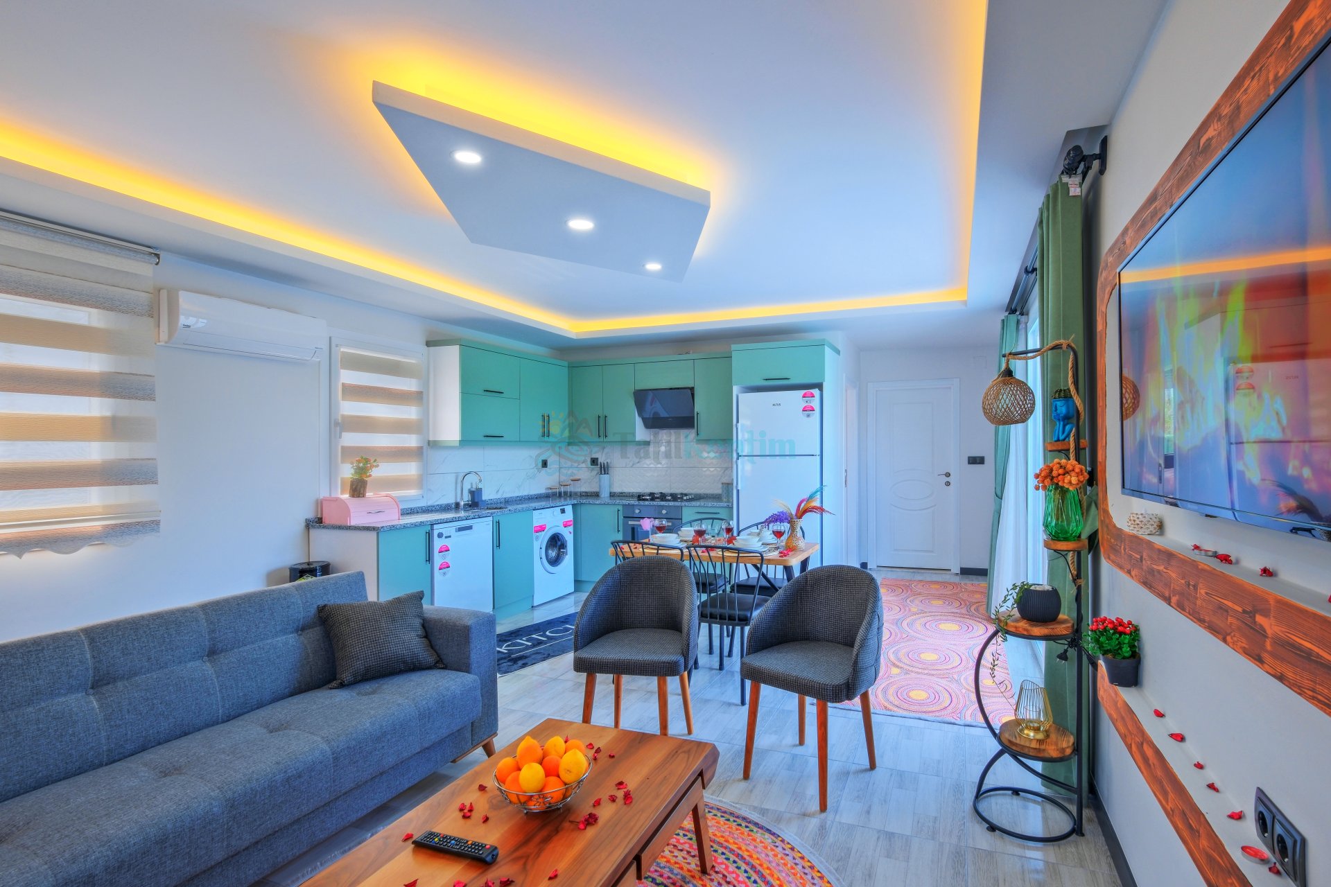 Açık mutfaklı salon, oturma grubu, 4 kişilik yemek masası, Lcd tv, uydu alıcısı ve klima bulunmaktadır. Salonda havuz ve bahçeye açılan kapısı mevcuttur.