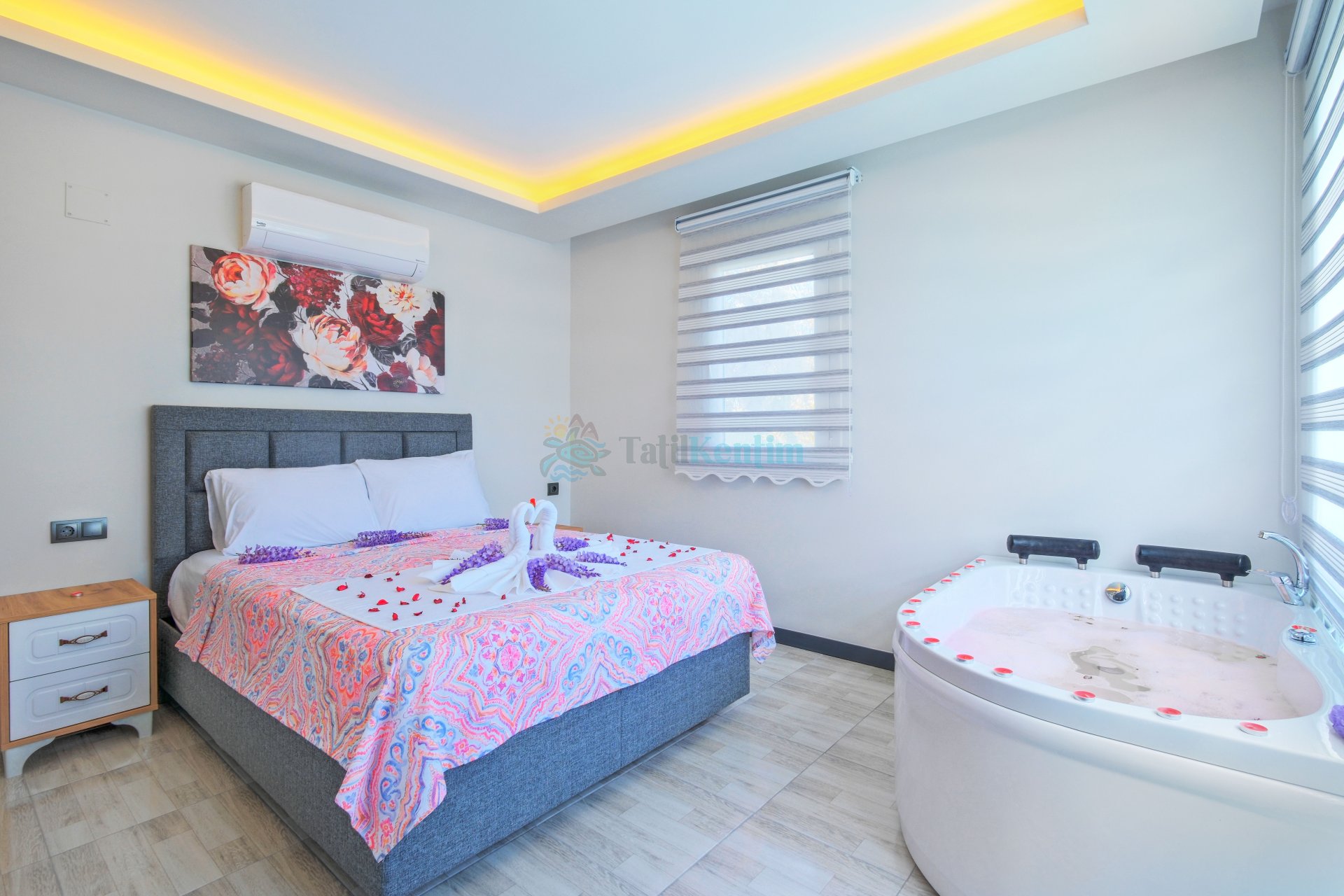 Yatak odası içerisinde, 1 adet çift kişilik yatak, jakuzi, klima, elbise dolabı, ebeveyn banyo, komodin, makyaj masası ve havuza çıkış kapısı bulunmaktadır.