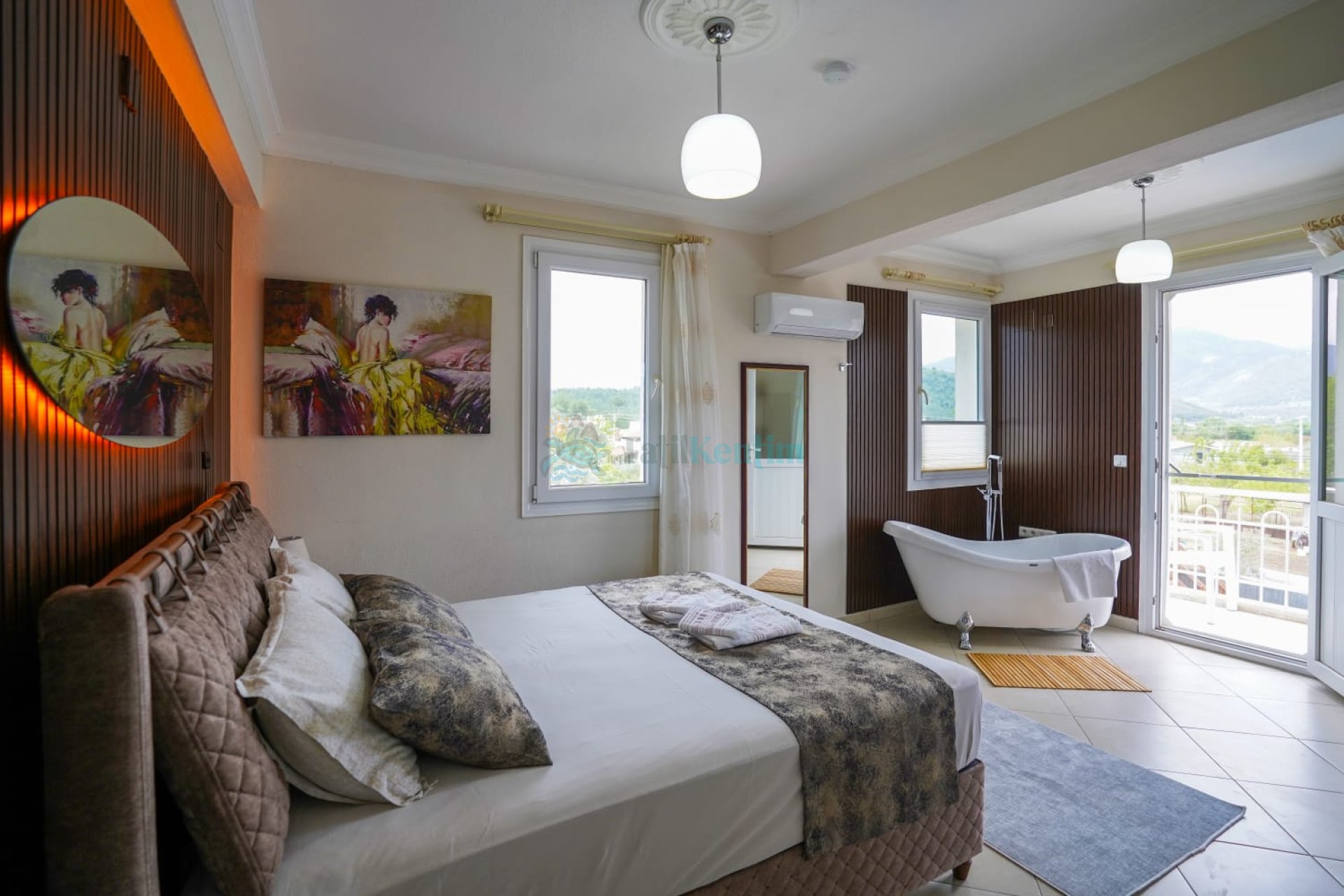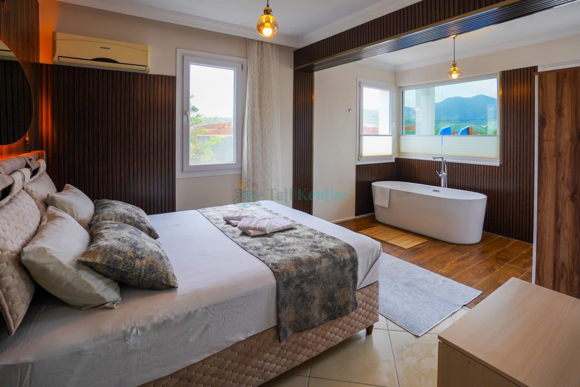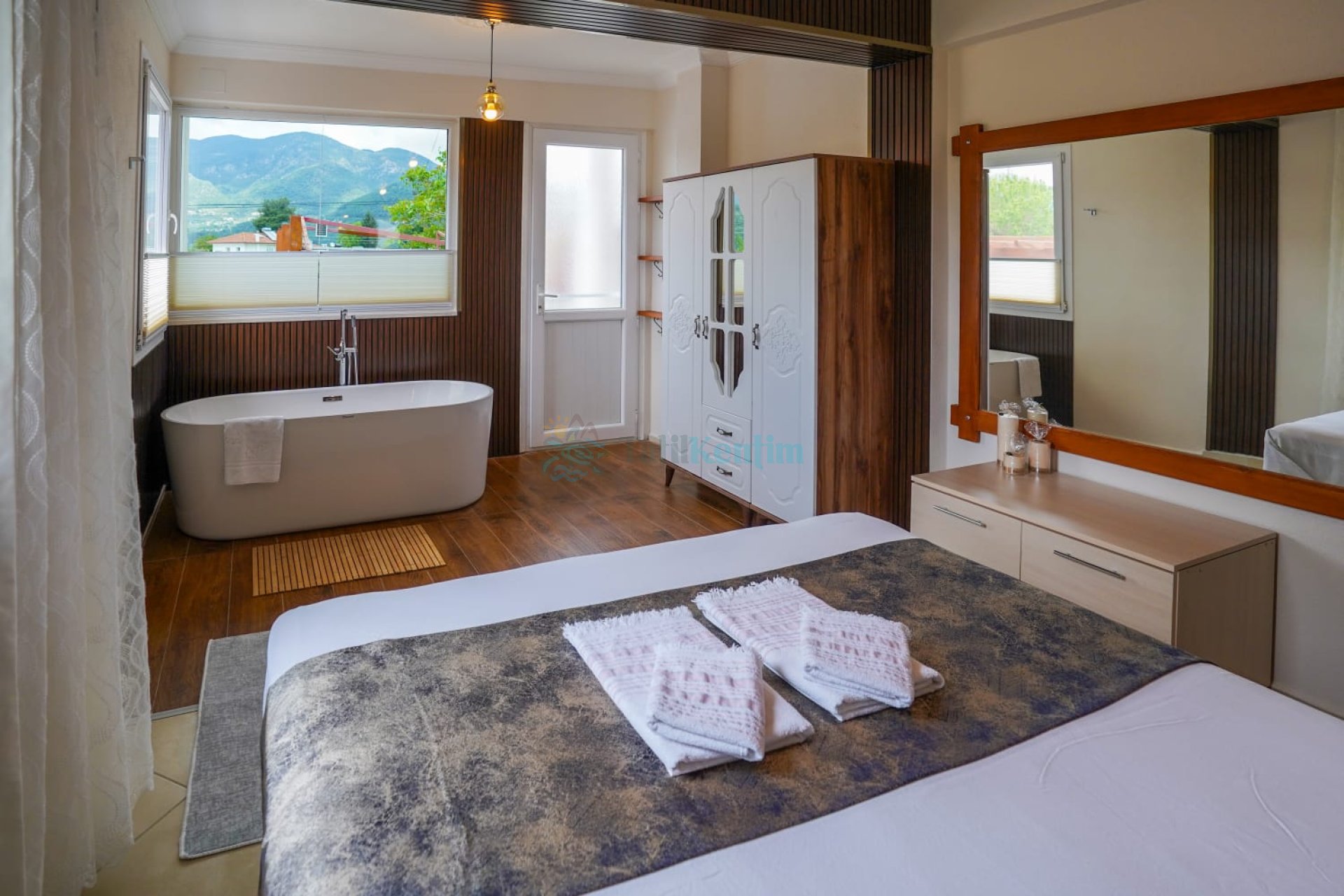 Kiralık villanın bu yatak odası içerisinde, 1 adet çift kişilik yatak, klima, elbise dolabı, komodin, makyaj masası, banyo ve tuvalet bulunmaktadır.