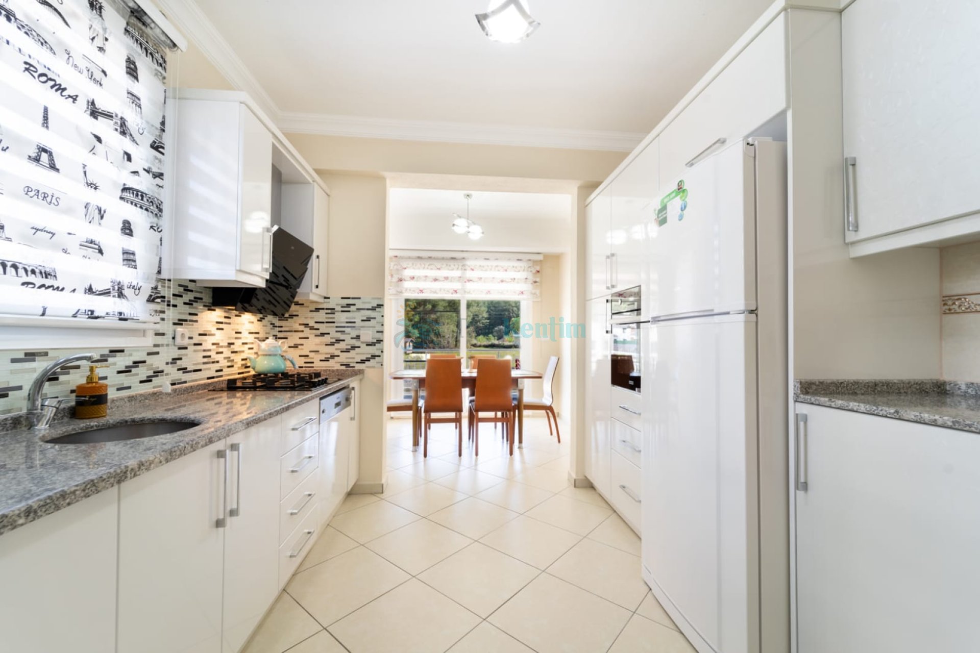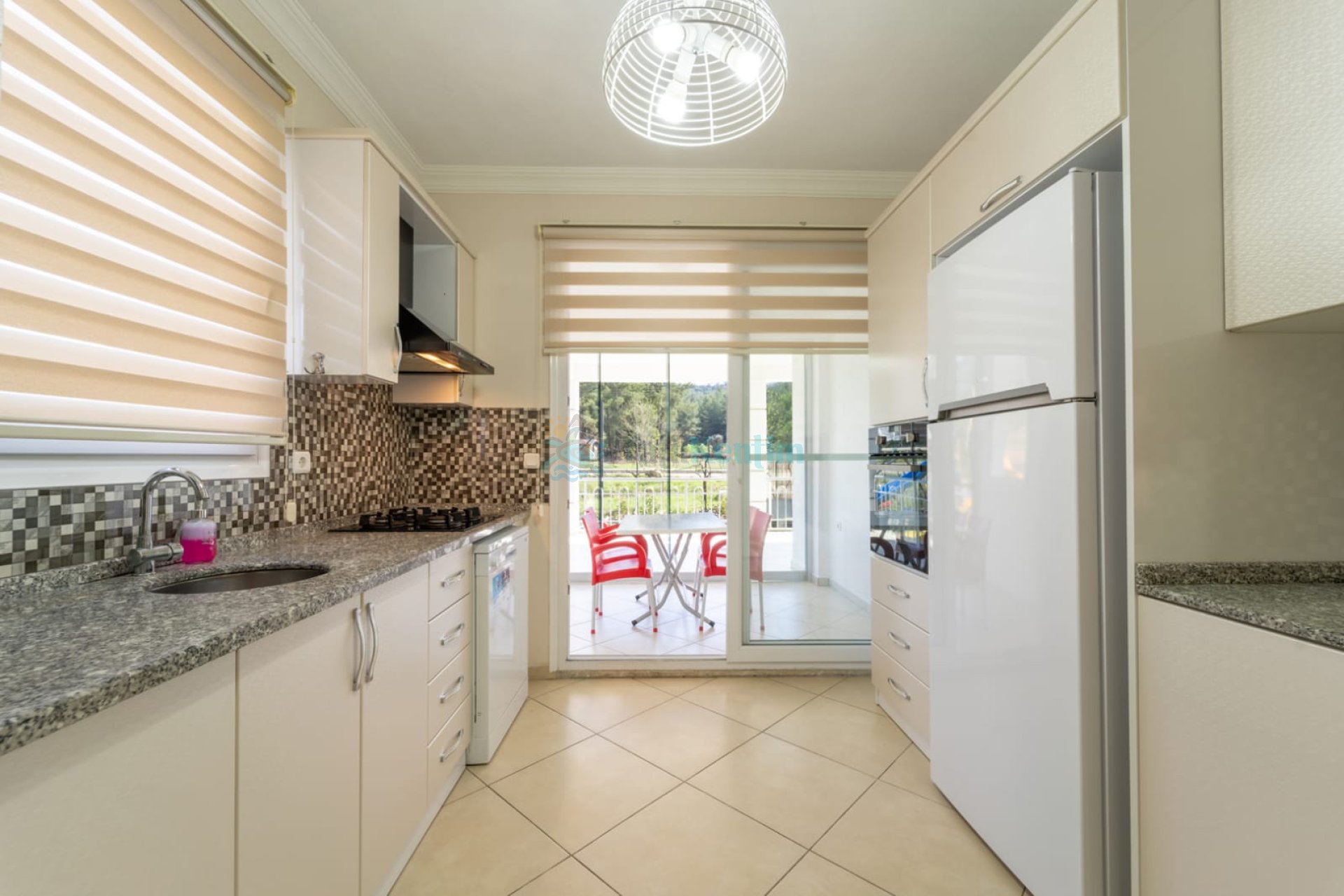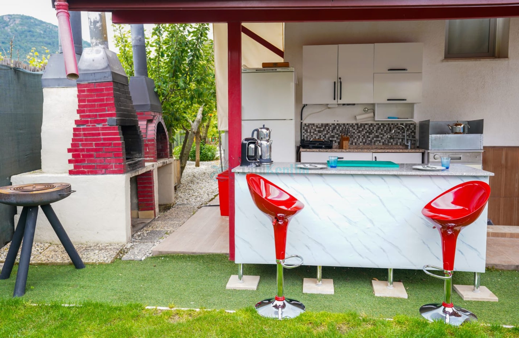 Yazlığımızın Amerikan mutfağı içerisinde, buzdolabı, bulaşık makinası, çamaşır makinası, yemek masası, yemek takımı, ankastre fırın, tost makinası, ankastre ocak, çaydanlık, su ısıtıcısı, tava, tencere takımı ve gerekli olan tüm mutfak gereçleri yer almaktadır.