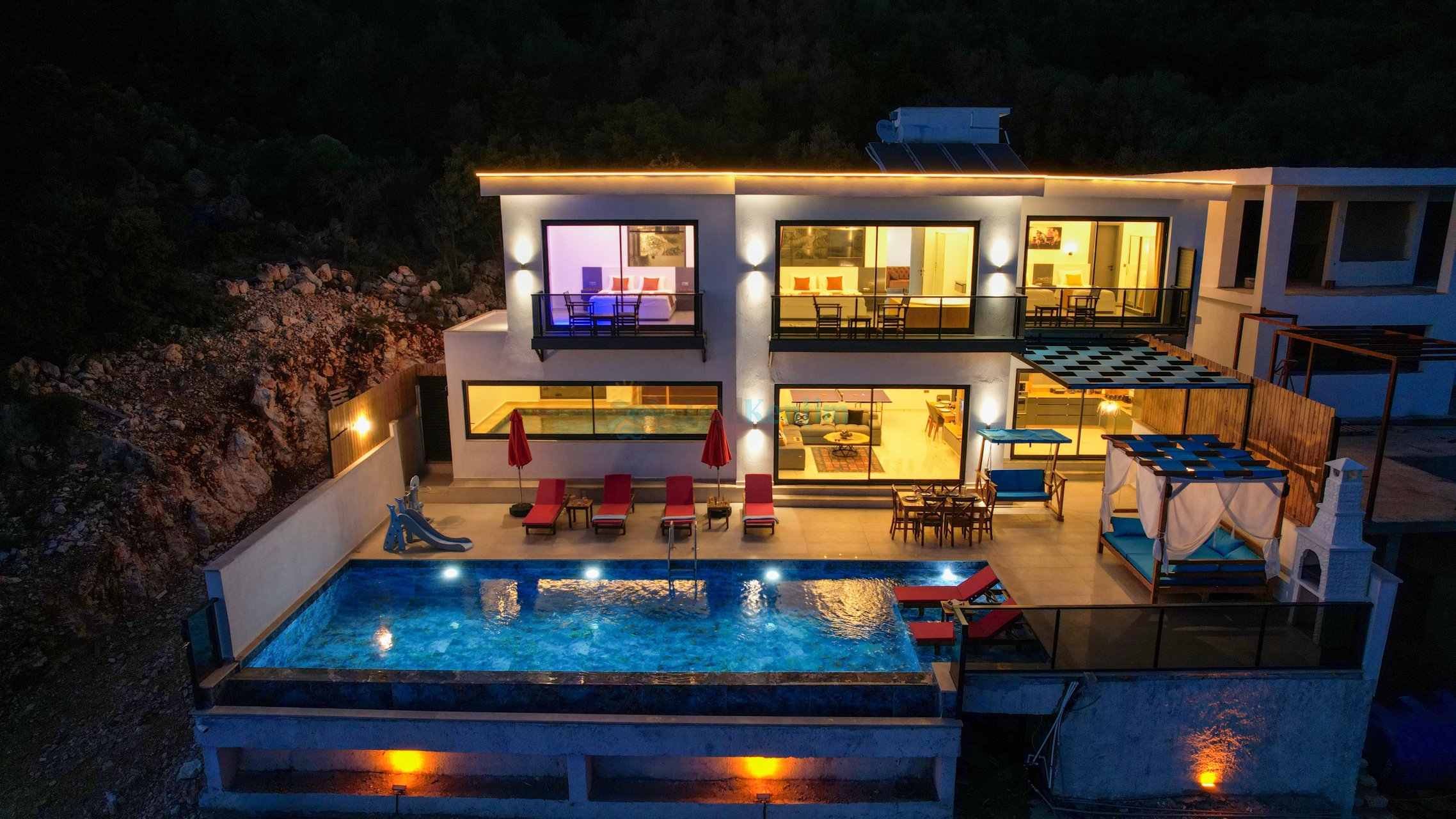 Villa Gökçe Kaş Kalkan Ordu mevkiinde konumlanmış, 6 kişilik konaklama kapasitesine sahip olan villamız, 3 yatak odası ve 3 banyosu ile aileler ve arkadaş grupları için ideal bir seçenektir. Villa Gökçe' nin geniş ve bakımlı bahçesinde keyifli vakit geçirmeniz için her detay düşünülmüştür; Özel yüzme havuzu, mini çocuk oyun parkı, açık hava yemek masası, konforlu oturma grubu, salıncak bulunmaktadır. 2 katlı modern mimariye sahip villamızın iç tasarımı konfor ön planda tutularak hazırlanmıştır. Villa İçerisinde; Sauna, Hamam, Kapalı yüzme havuzu, Masa Tenisi, 1 yatak odasında özel Jakuzi bulmaktadır.