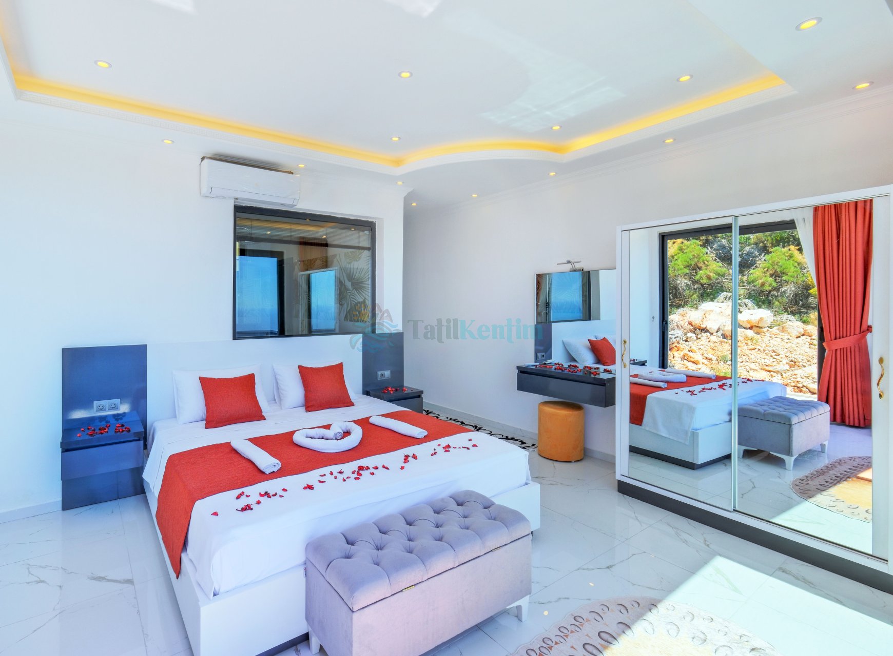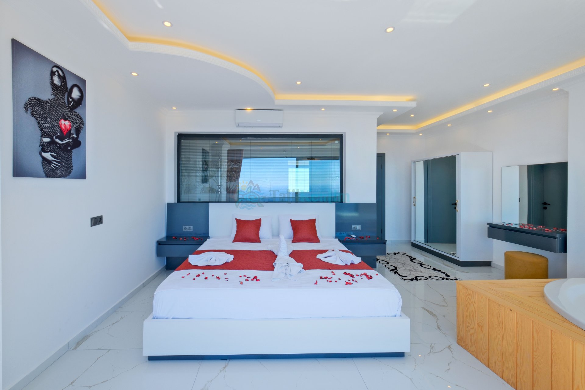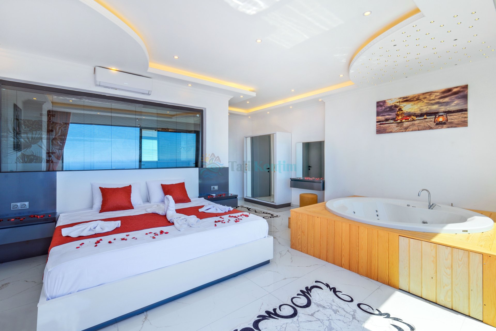 1.Yatak Odası: 1 Adet çift kişilik yatak, komodin, jakuzi, elbise dolabı, klima, makyaj masası, banyo ve tuvalet bulunmaktadır.
