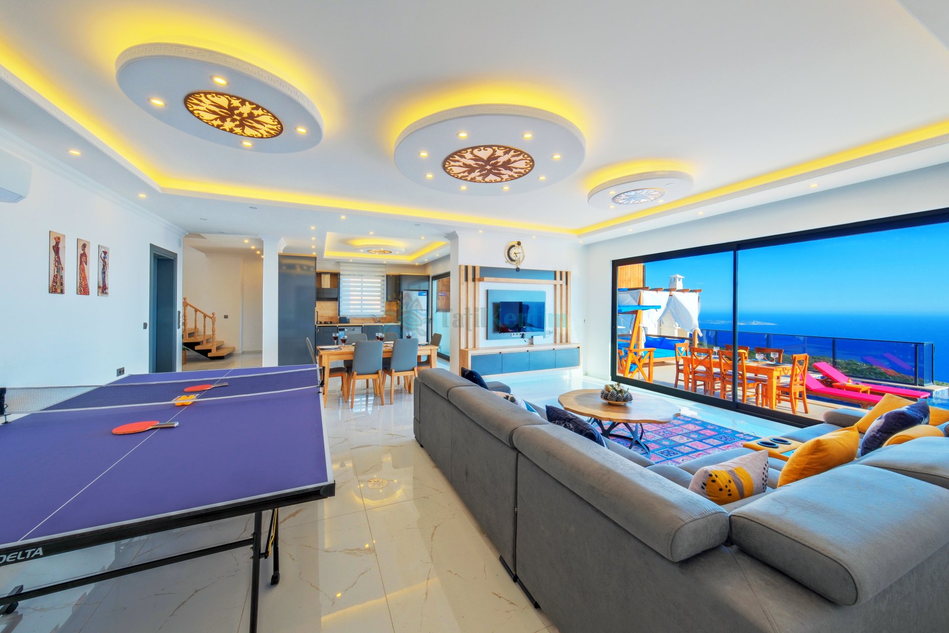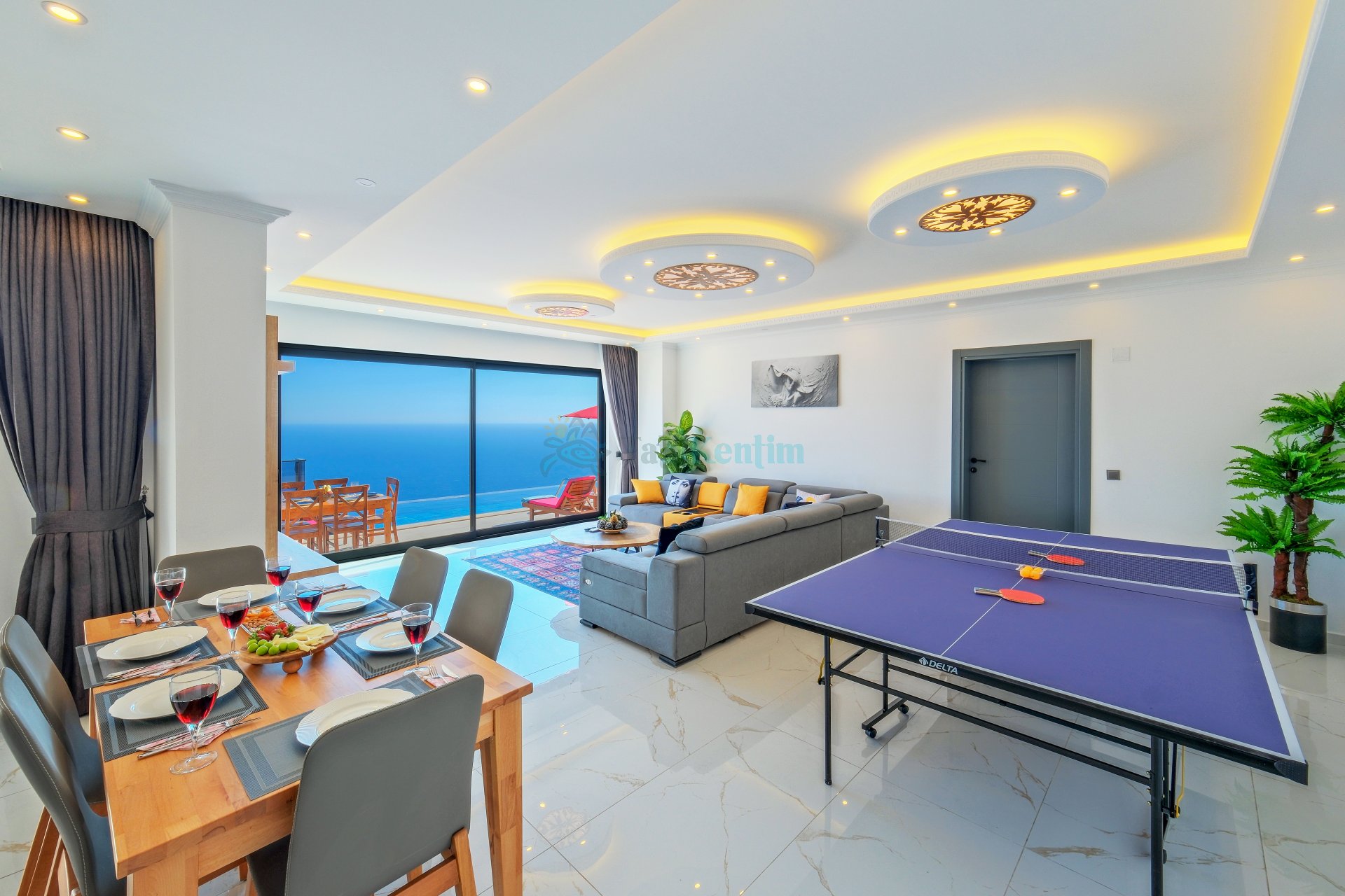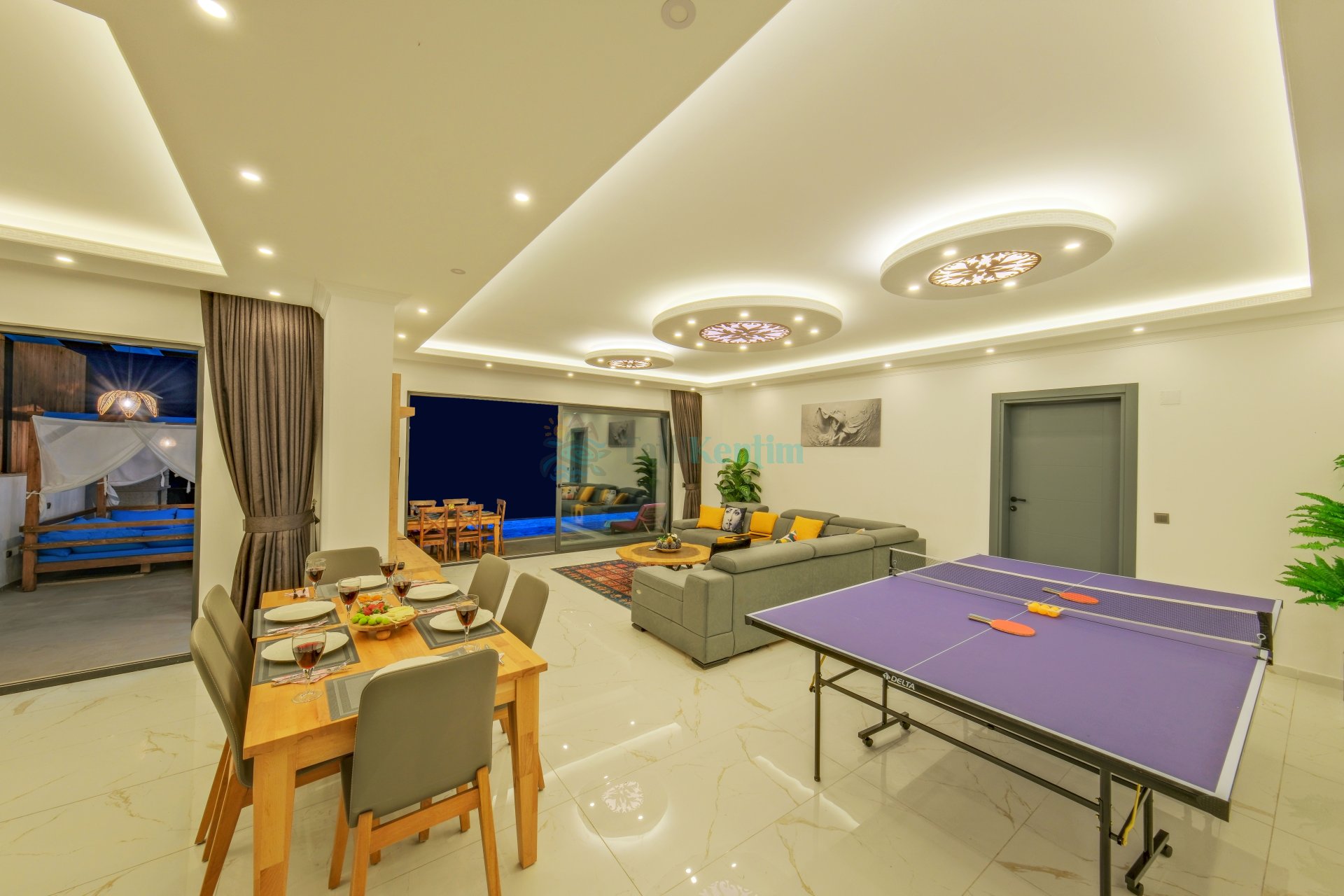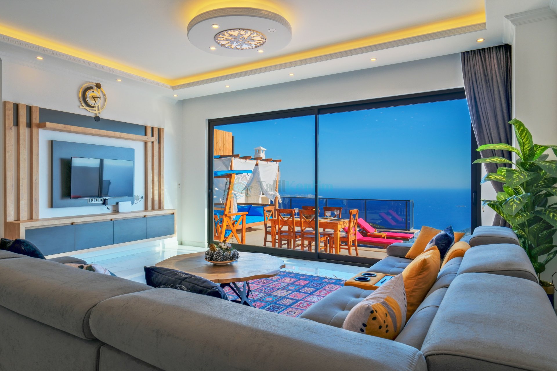 Salon: Oturma grubu, televizyon, klima ve havuz terasına çıkış bulunmaktadır.