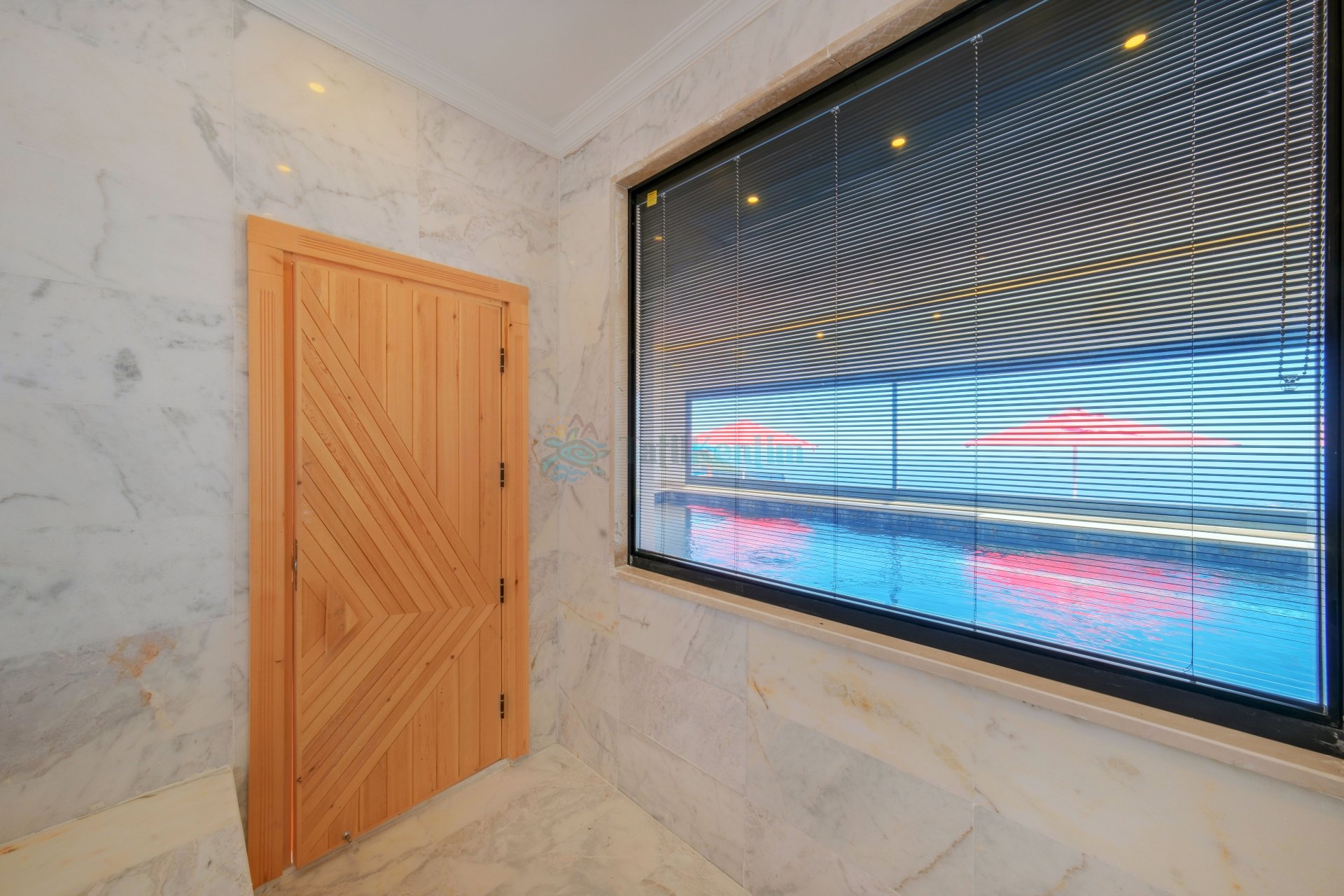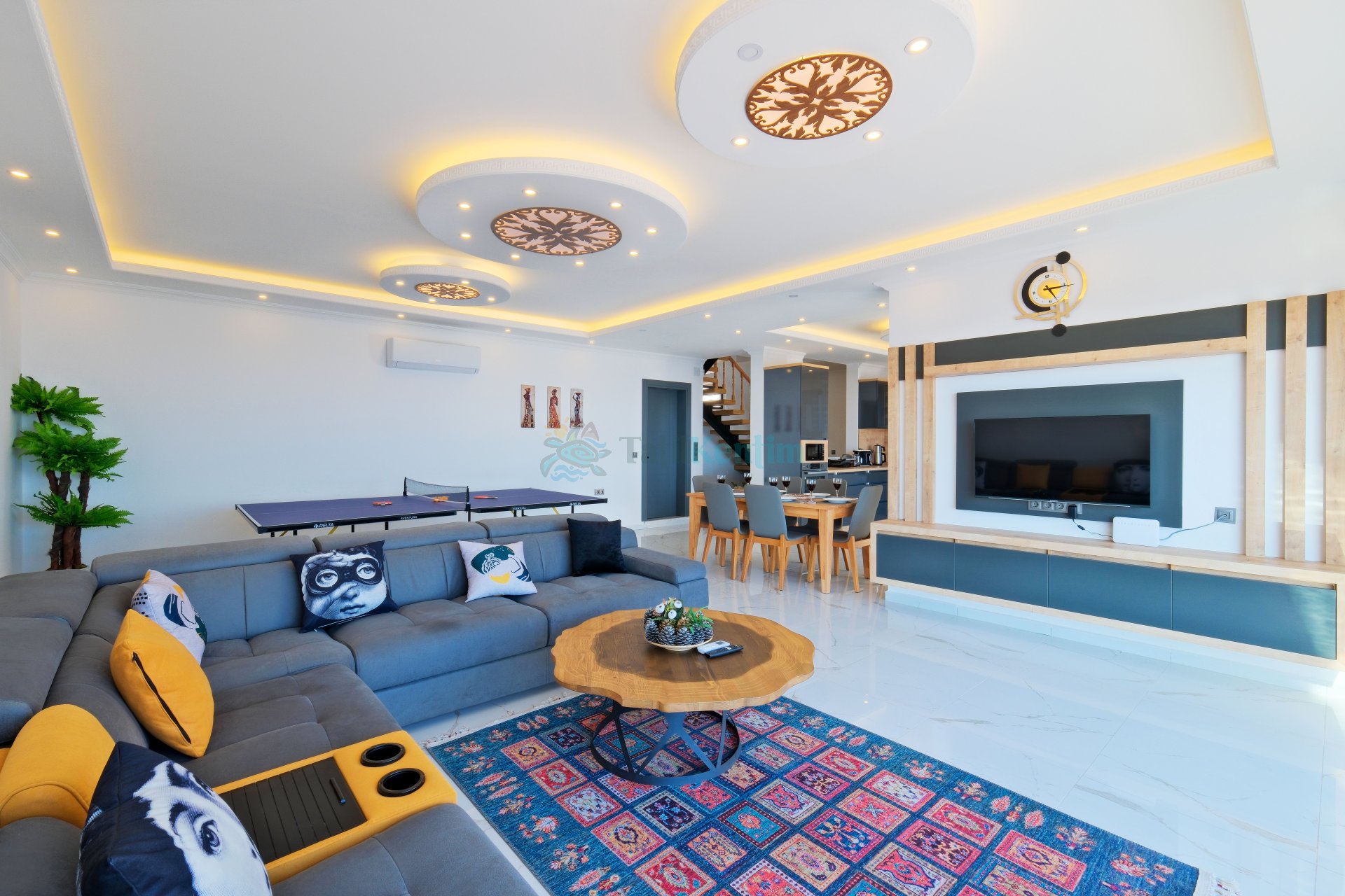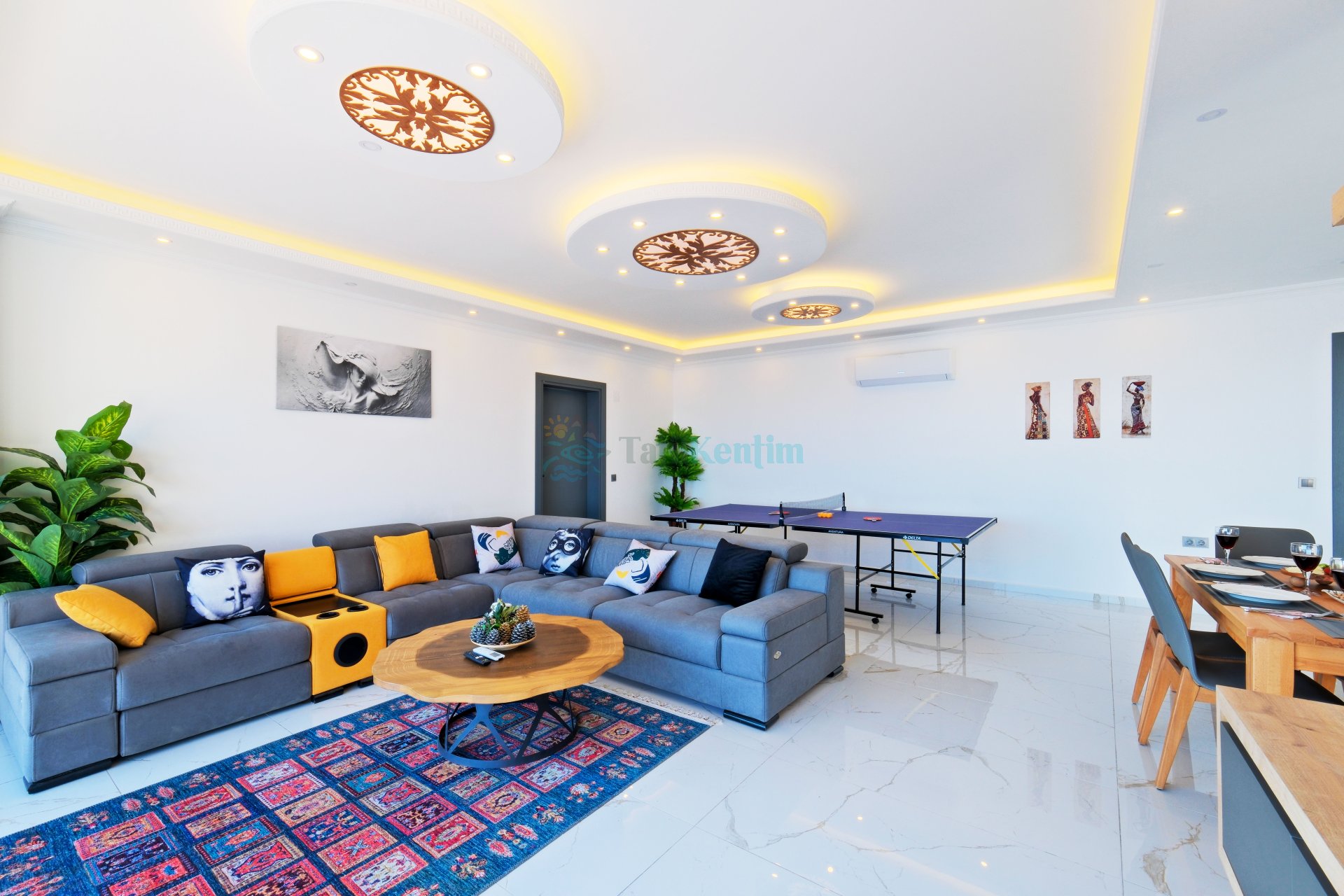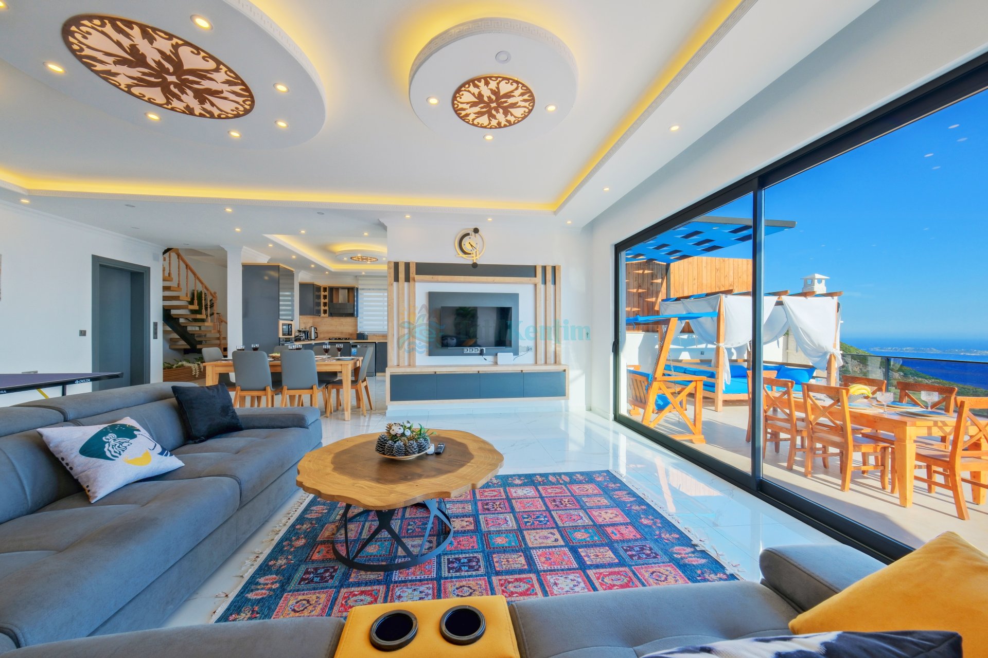 Salon: Oturma grubu, televizyon, klima ve havuz terasına çıkış bulunmaktadır.