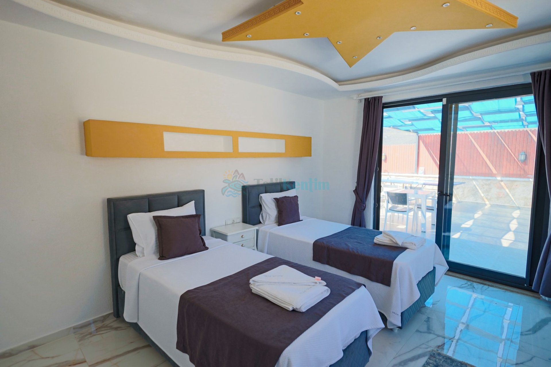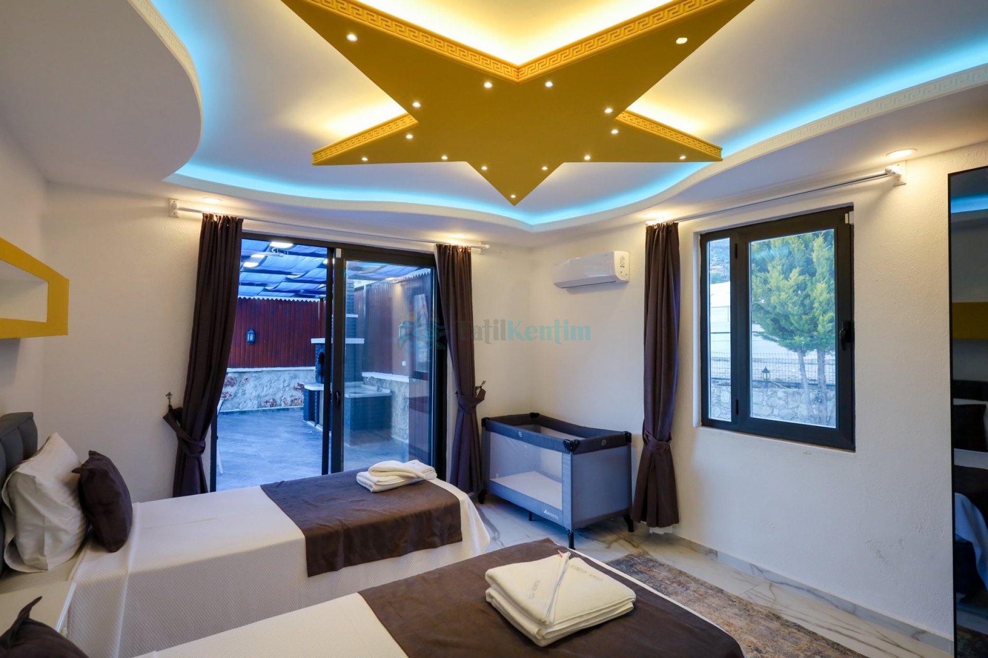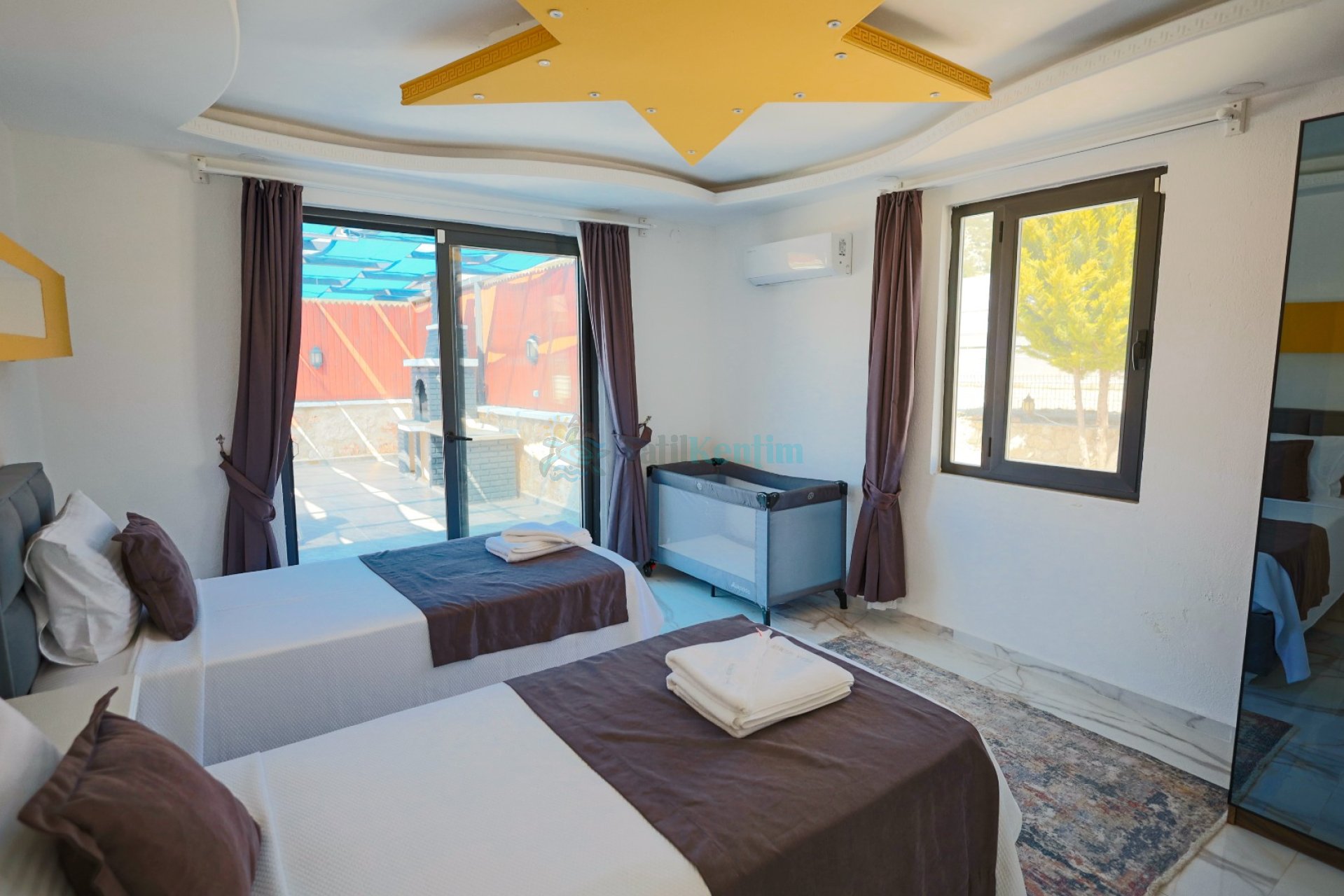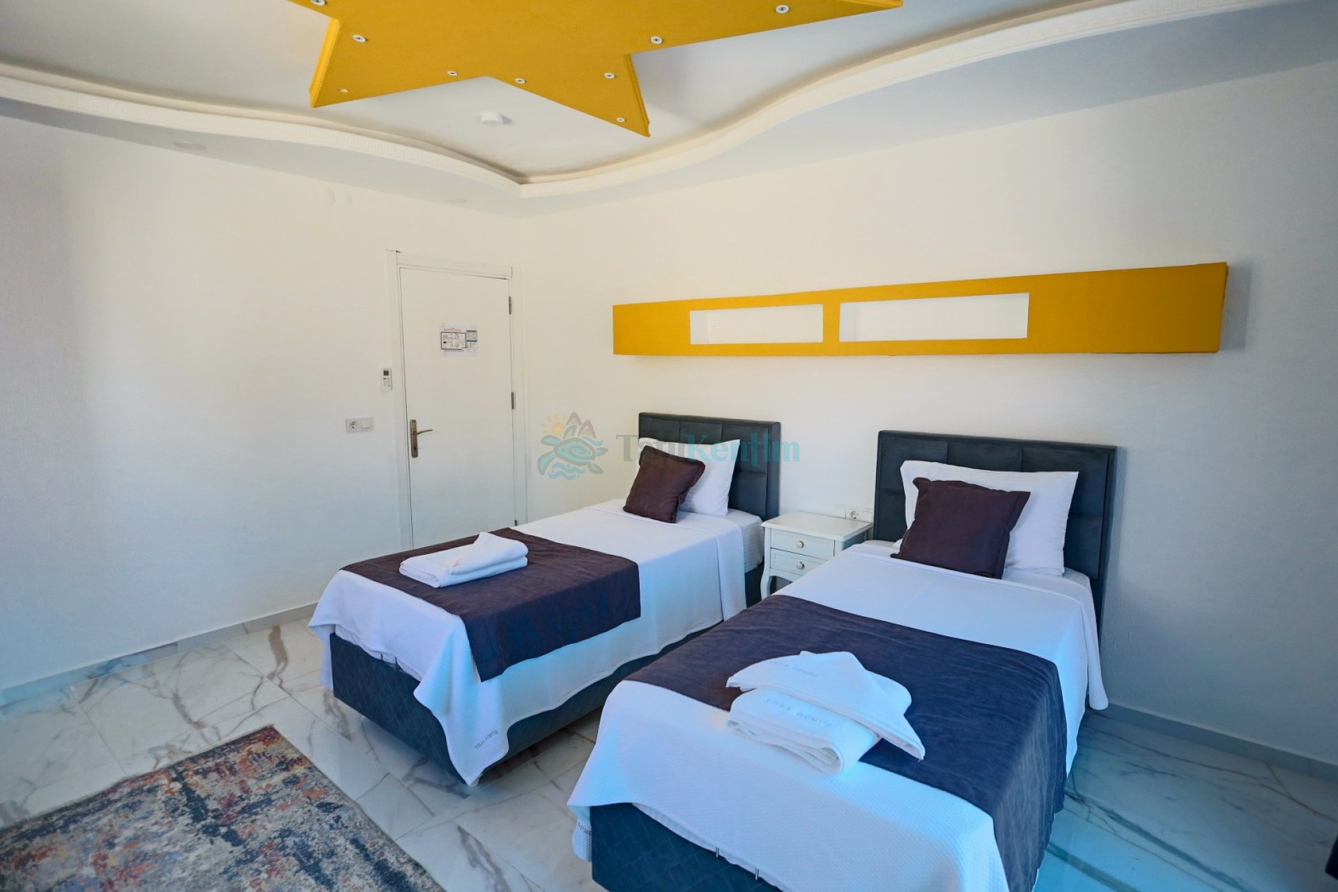 3.Yatak Odası: 2 Adet tek kişilik yatak, komodin, elbise dolabı, klima, bebek yatağı, banyo ve tuvalet bulunmaktadır.