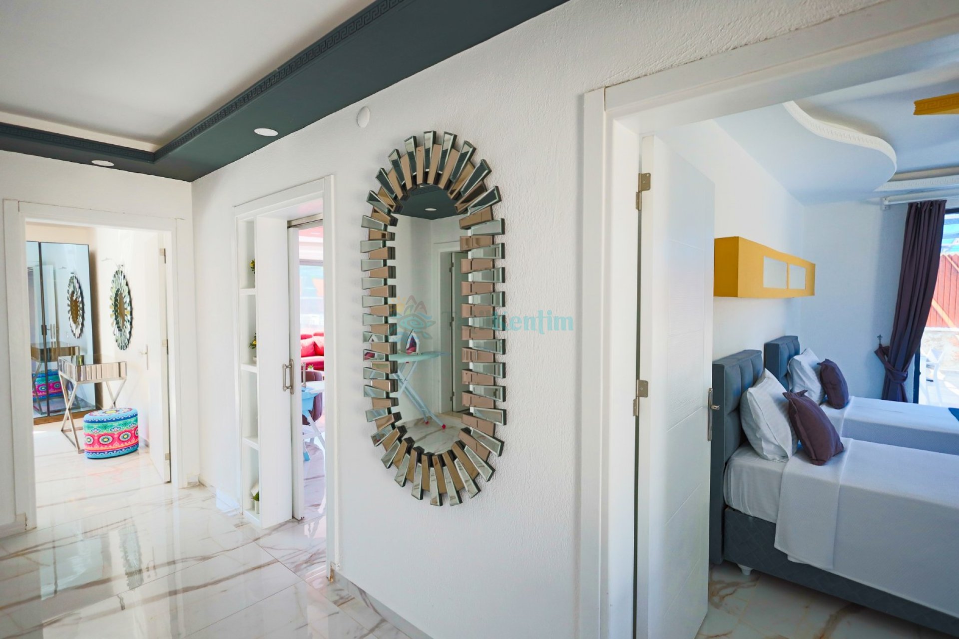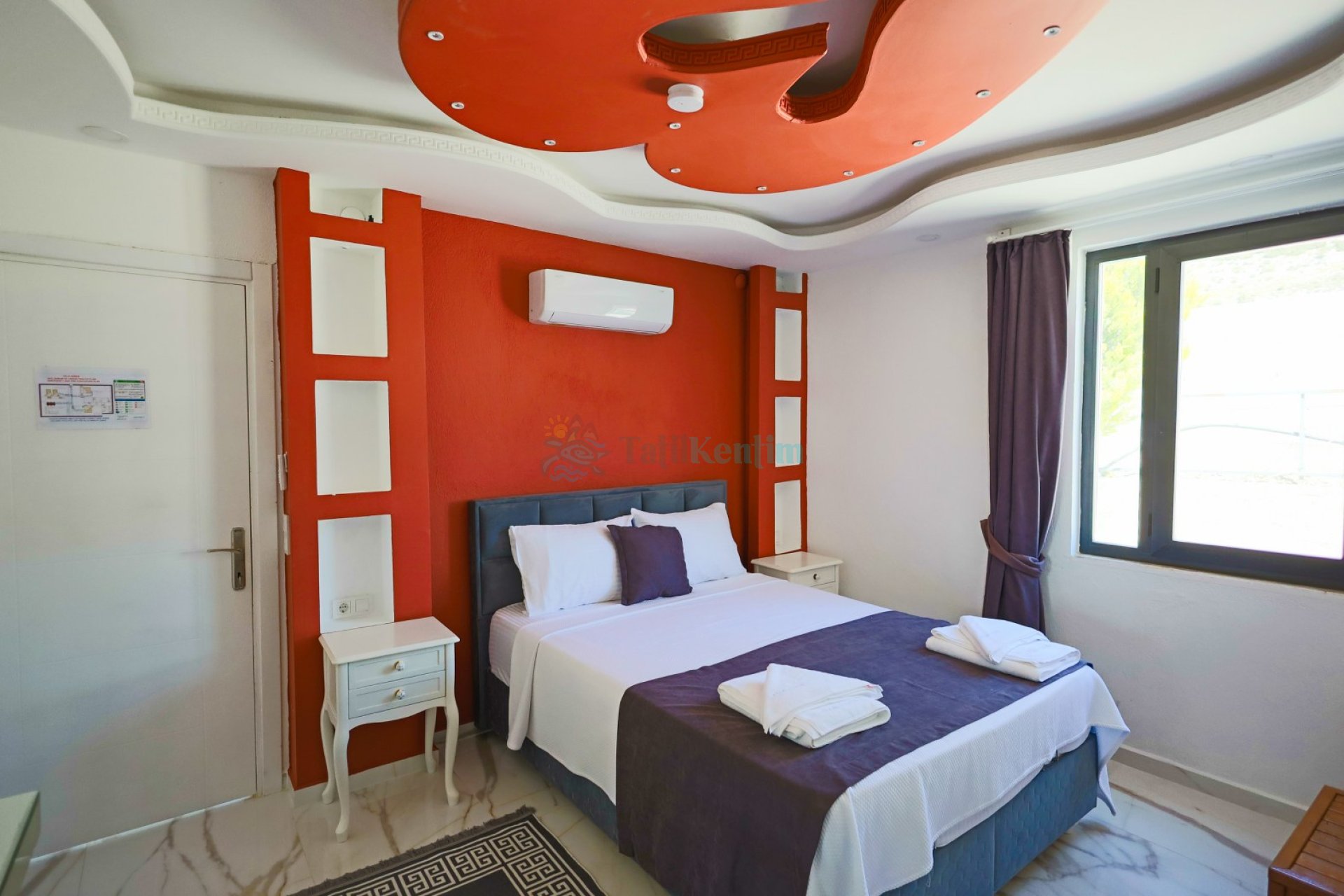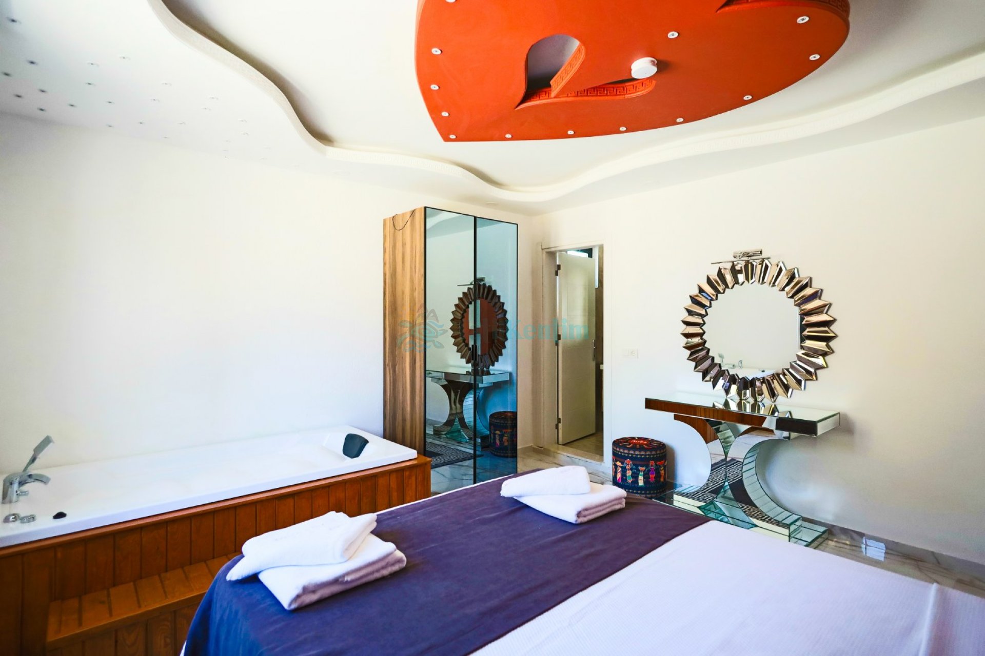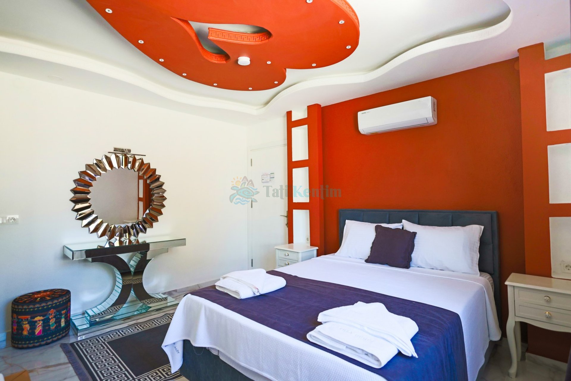 1.Yatak Odası: 1 Adet çift kişilik yatak, komodin, makyaj masası, klima, jakuzi, elbise dolabı, banyo ve tuvalet bulunmaktadır.