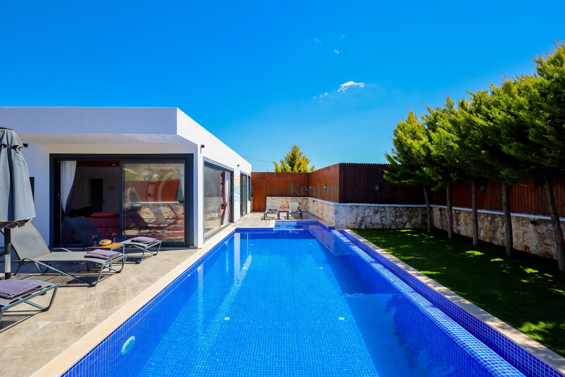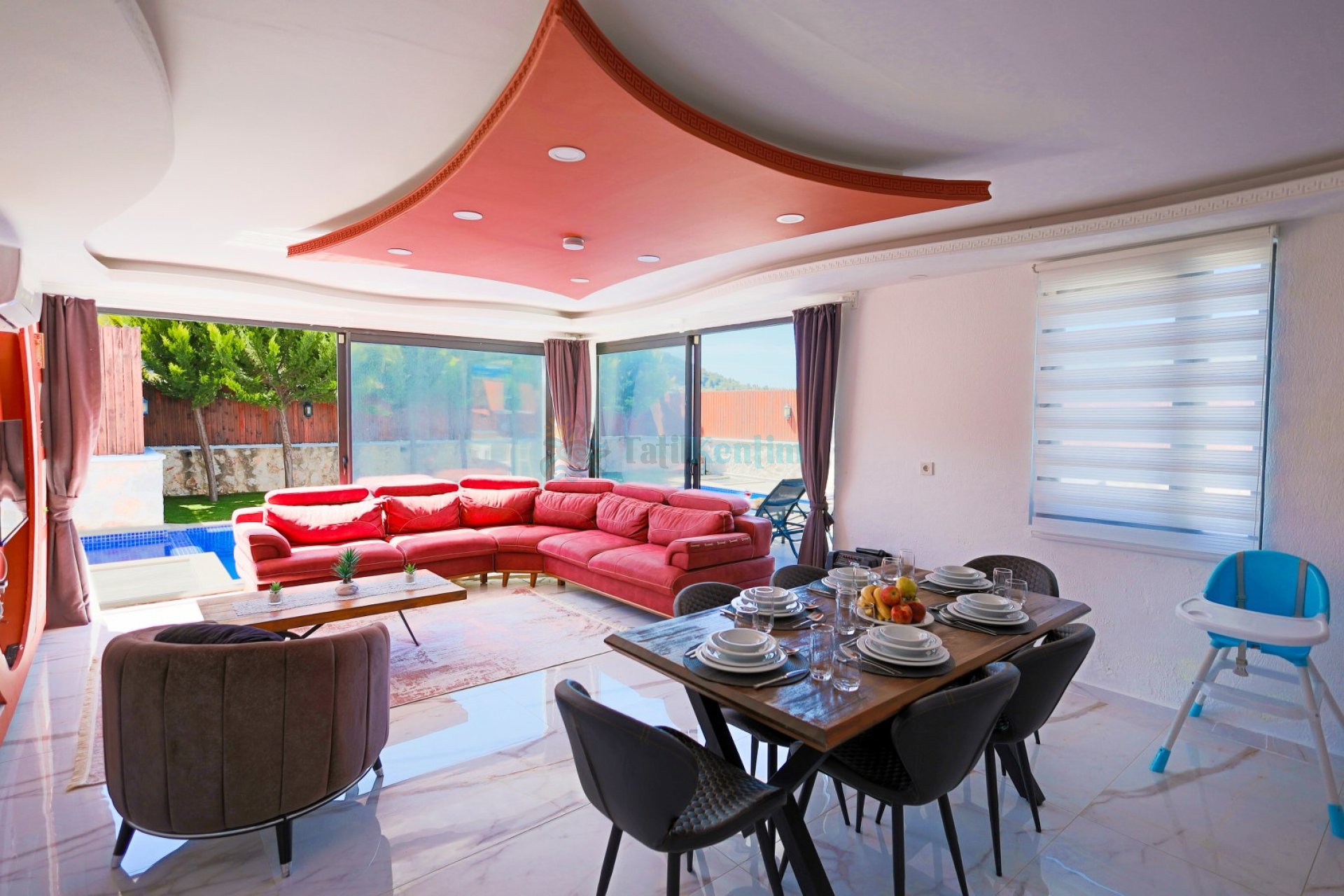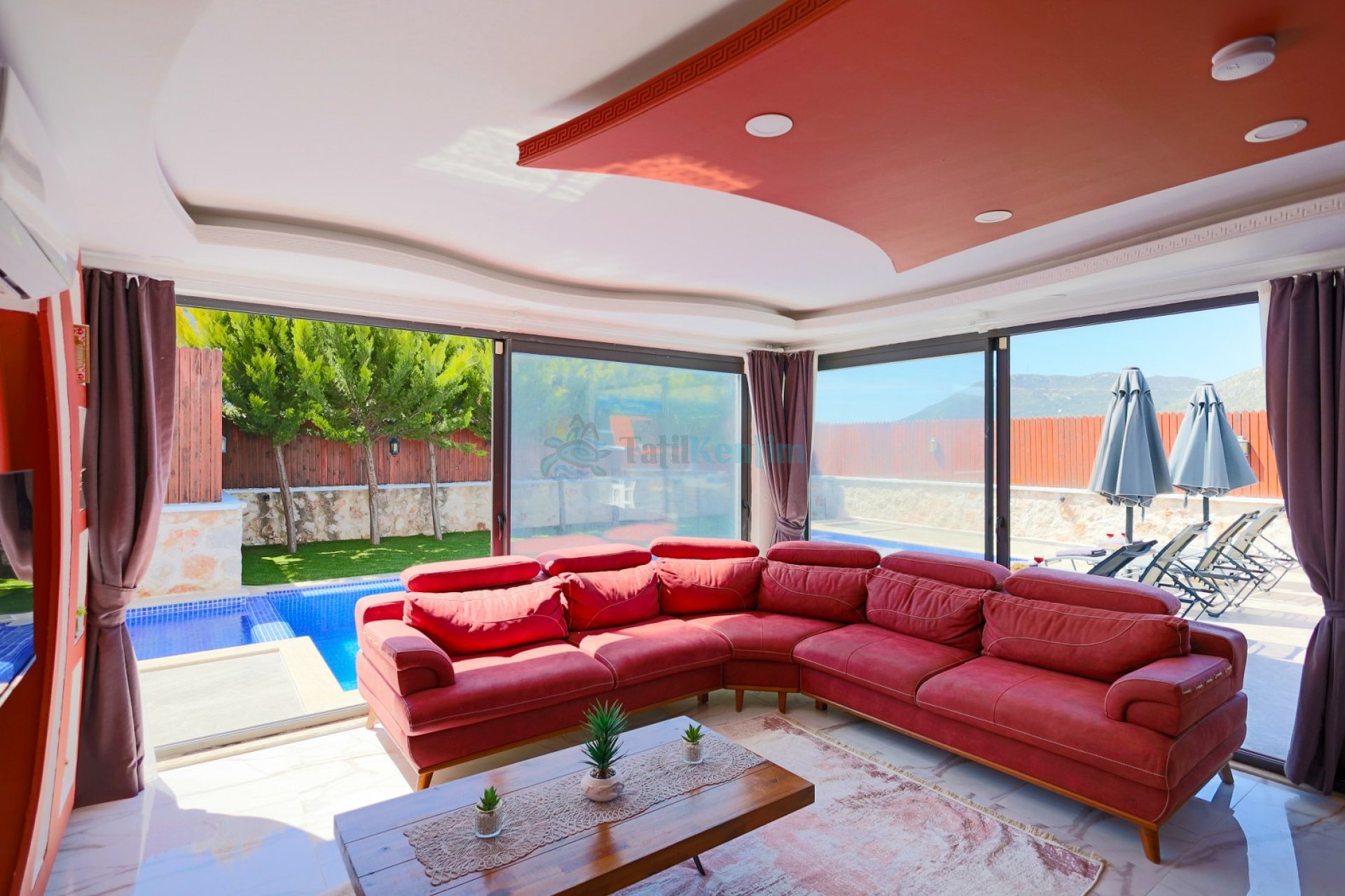 Salon: Oturma grubu, televizyon, klima ve havuz terasına çıkış bulunmaktadır.