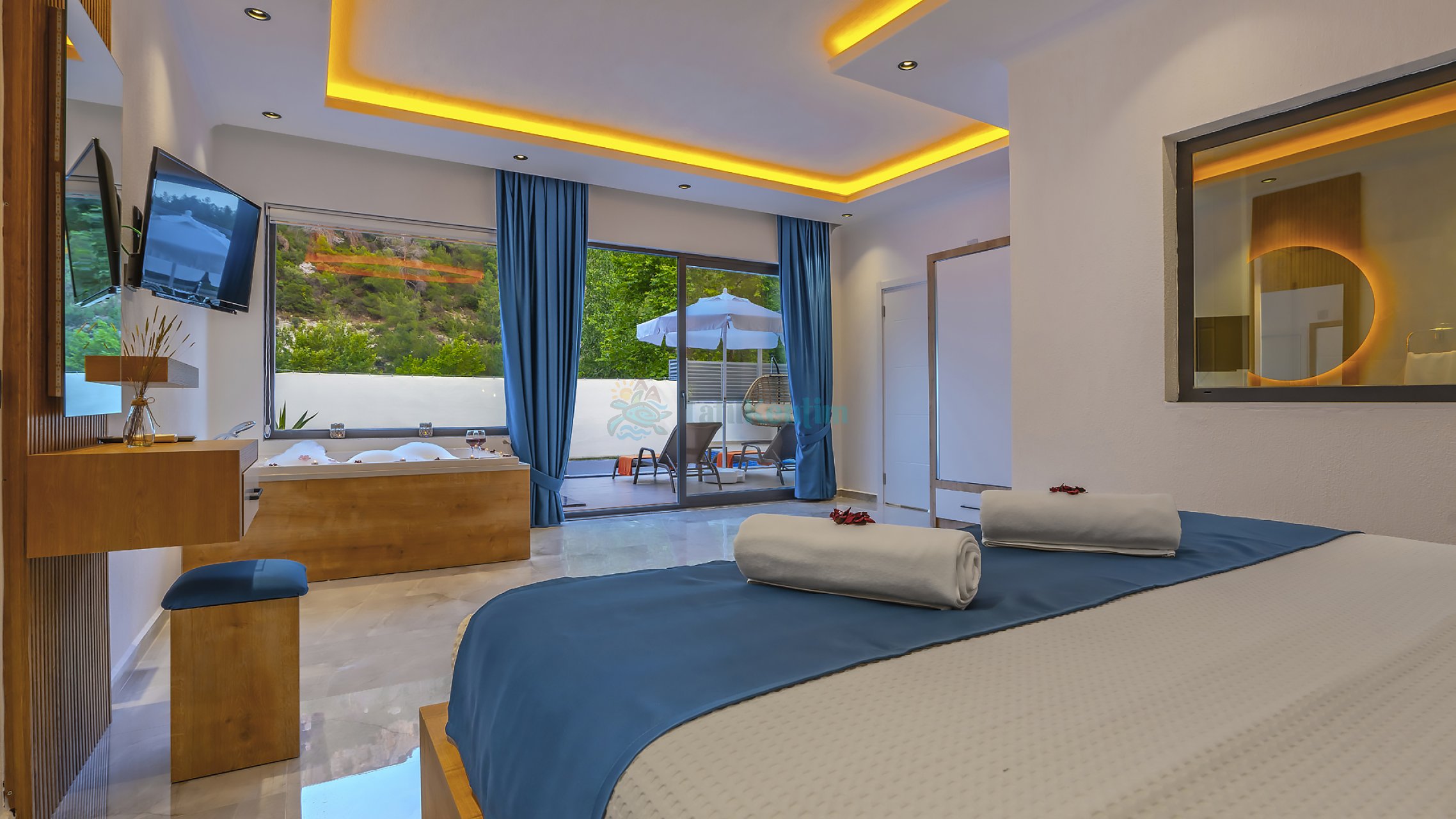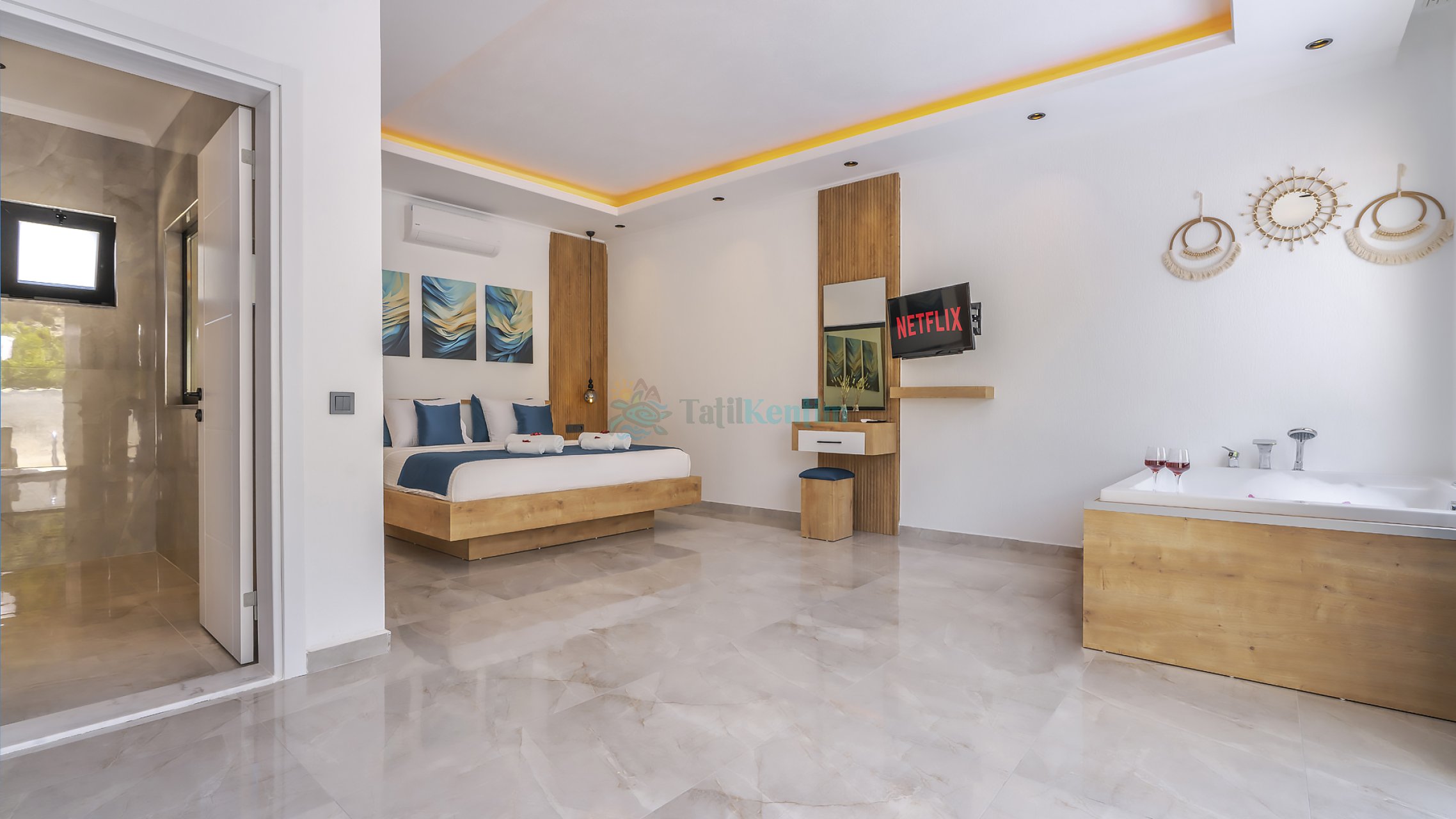 Tatil villamıza ait bu yatak odası içerisinde, 1 adet çift kişilik yatak, klima, TV, elbise dolabı, komodin, makyaj masası, jakuzi, banyo ve tuvalet bulunmaktadır.