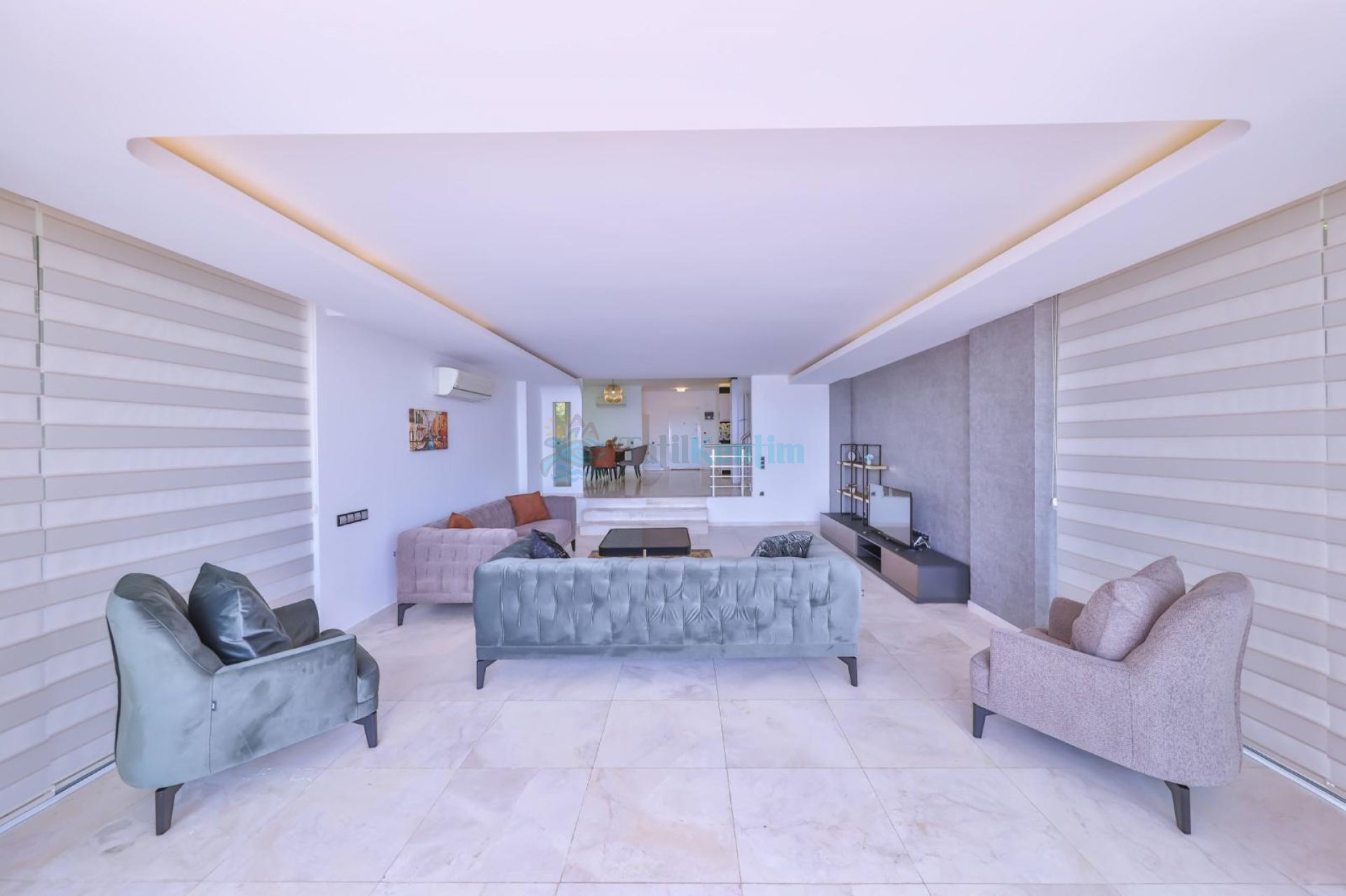 Salon: Oturma grubu, televizyon, klima ve havuz terasına çıkış bulunmaktadır.