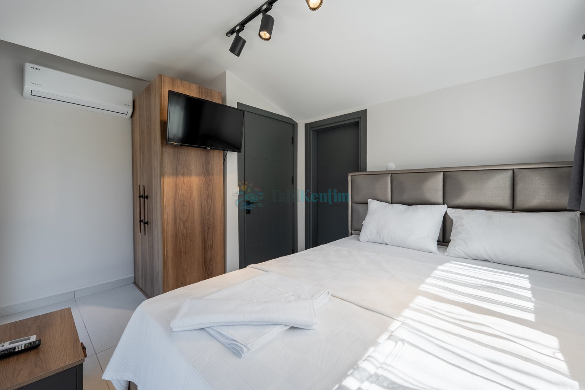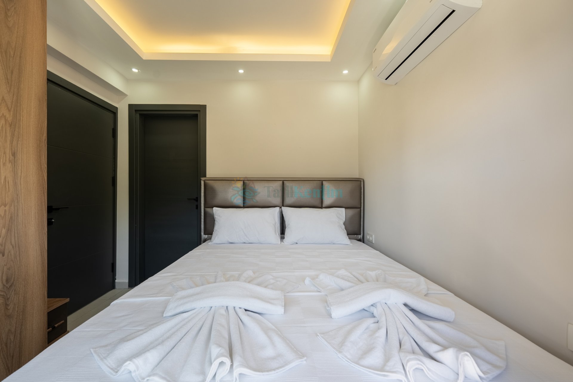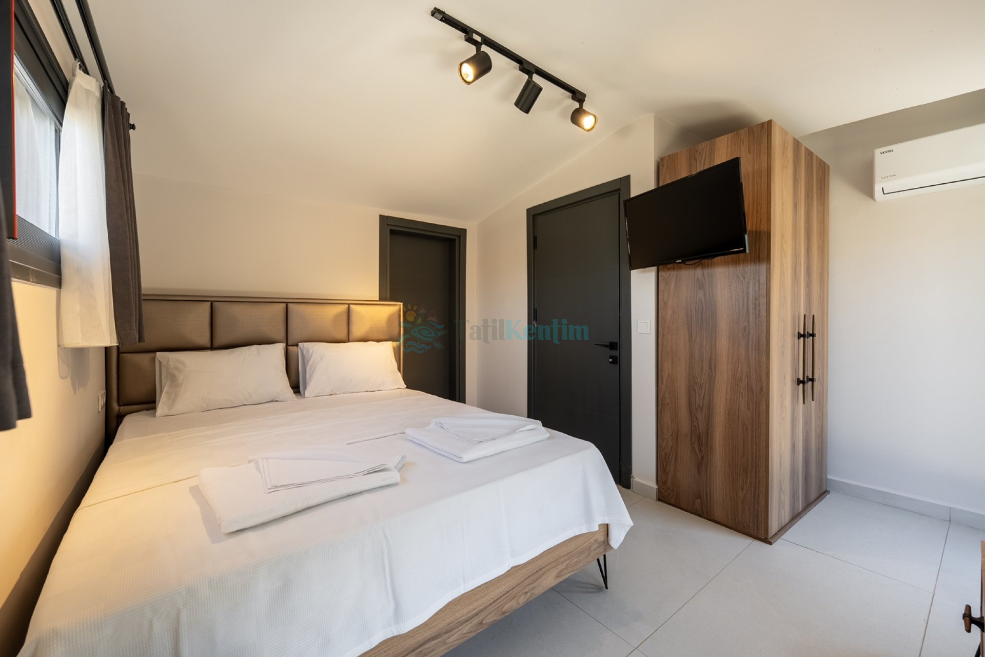 Kiralık villanın bu yatak odası içerisinde, 1 adet çift kişilik yatak, klima, elbise dolabı, komodin, makyaj masası, banyo ve tuvalet bulunmaktadır.
