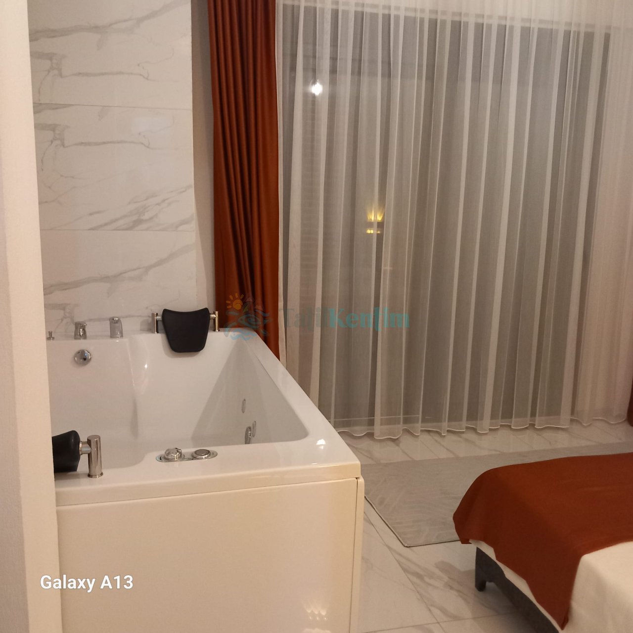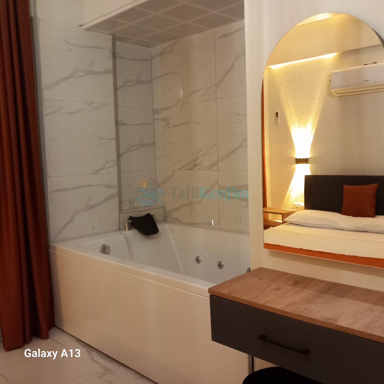 Kiralık villanın bu yatak odası içerisinde, 1 adet çift kişilik yatak, klima, elbise dolabı, komodin, jakuzi, makyaj masası, banyo ve tuvalet bulunmaktadır.