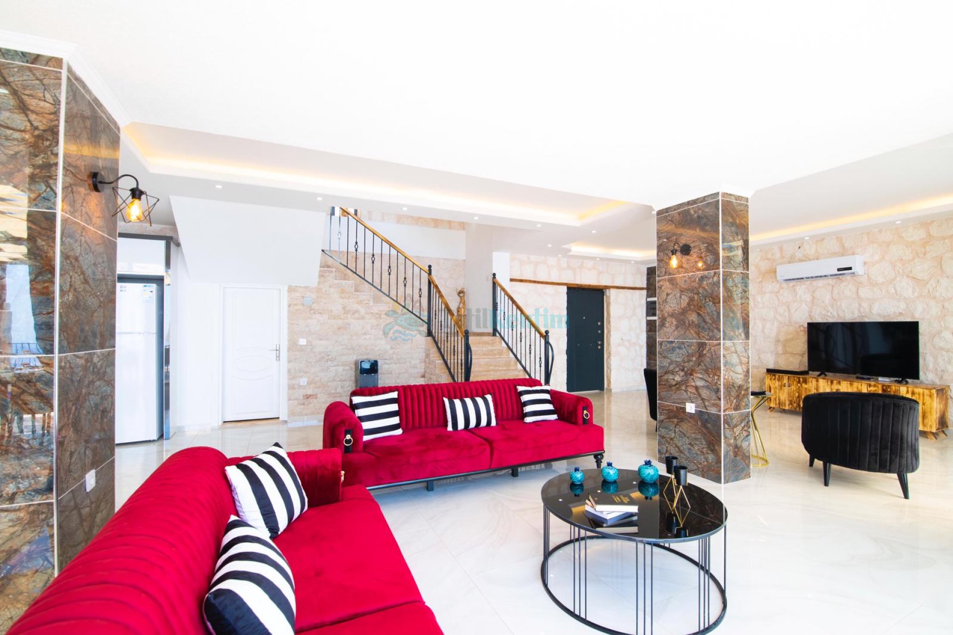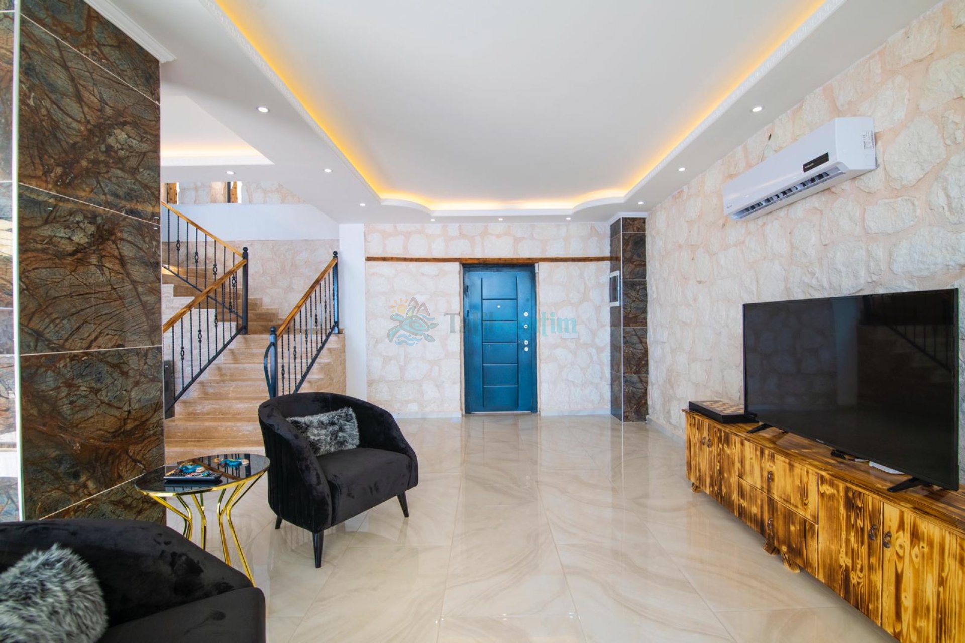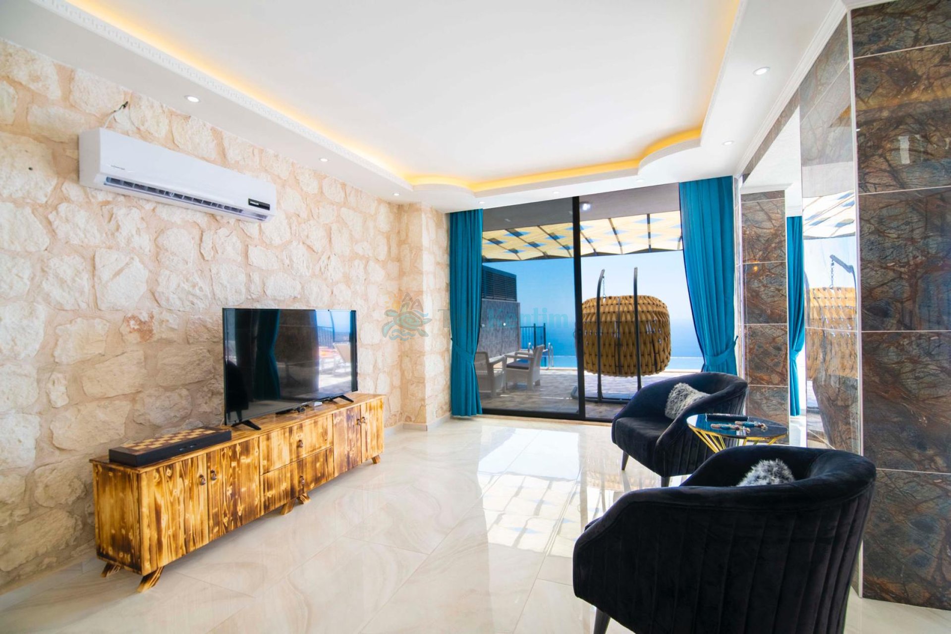 Villamızın salonu içerisinde, koltuk takımı, orta sehpa, TV, TV ünitesi, klima, uydu alıcısı yer almaktadır.