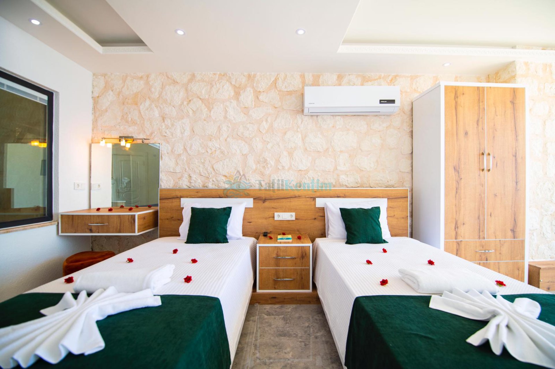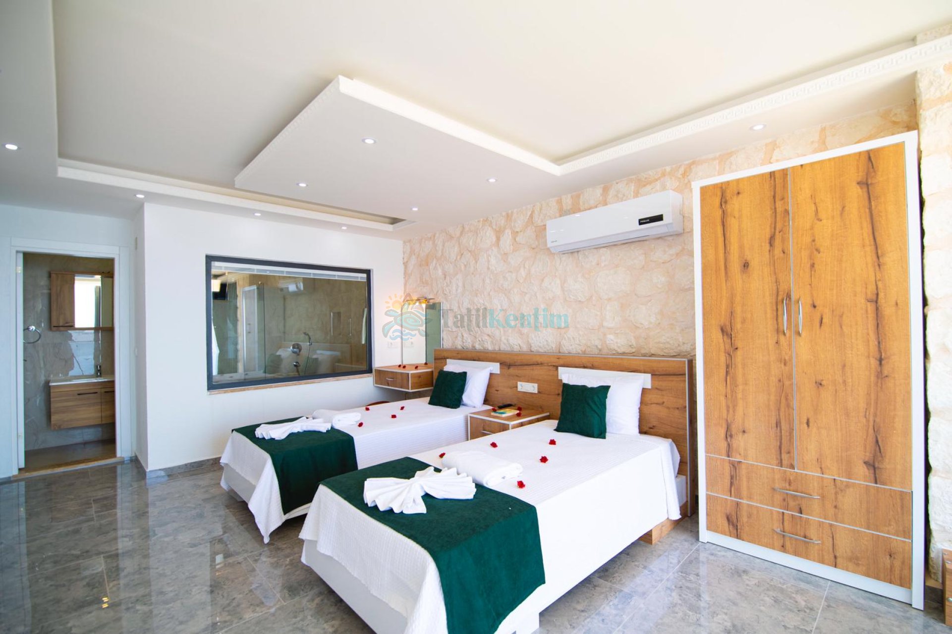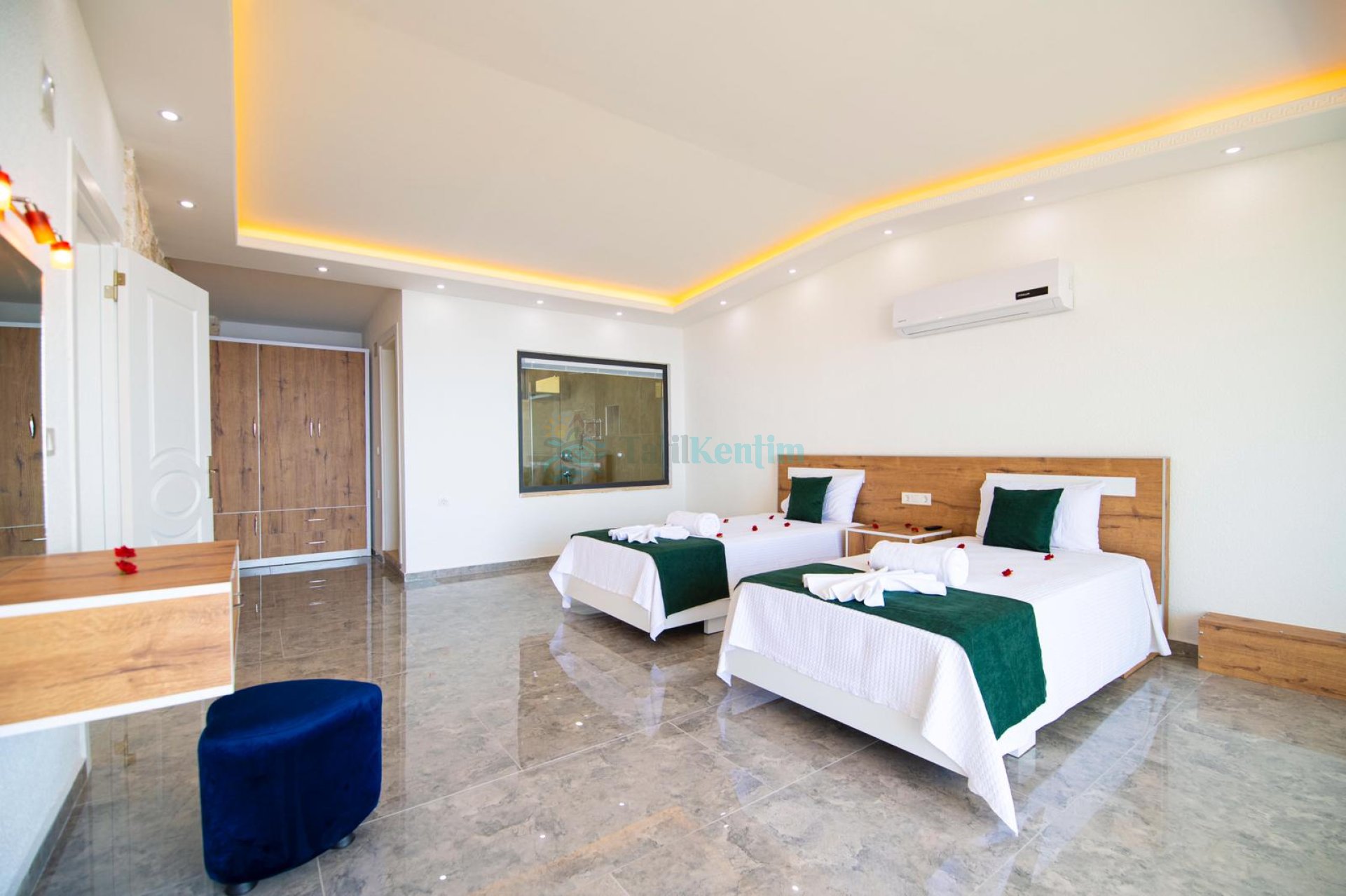 Kiralık villanın bu yatak odası içerisinde, 2 adet tek kişilik yatak, klima, elbise dolabı, komodin, makyaj masası, banyo ve tuvalet bulunmaktadır.