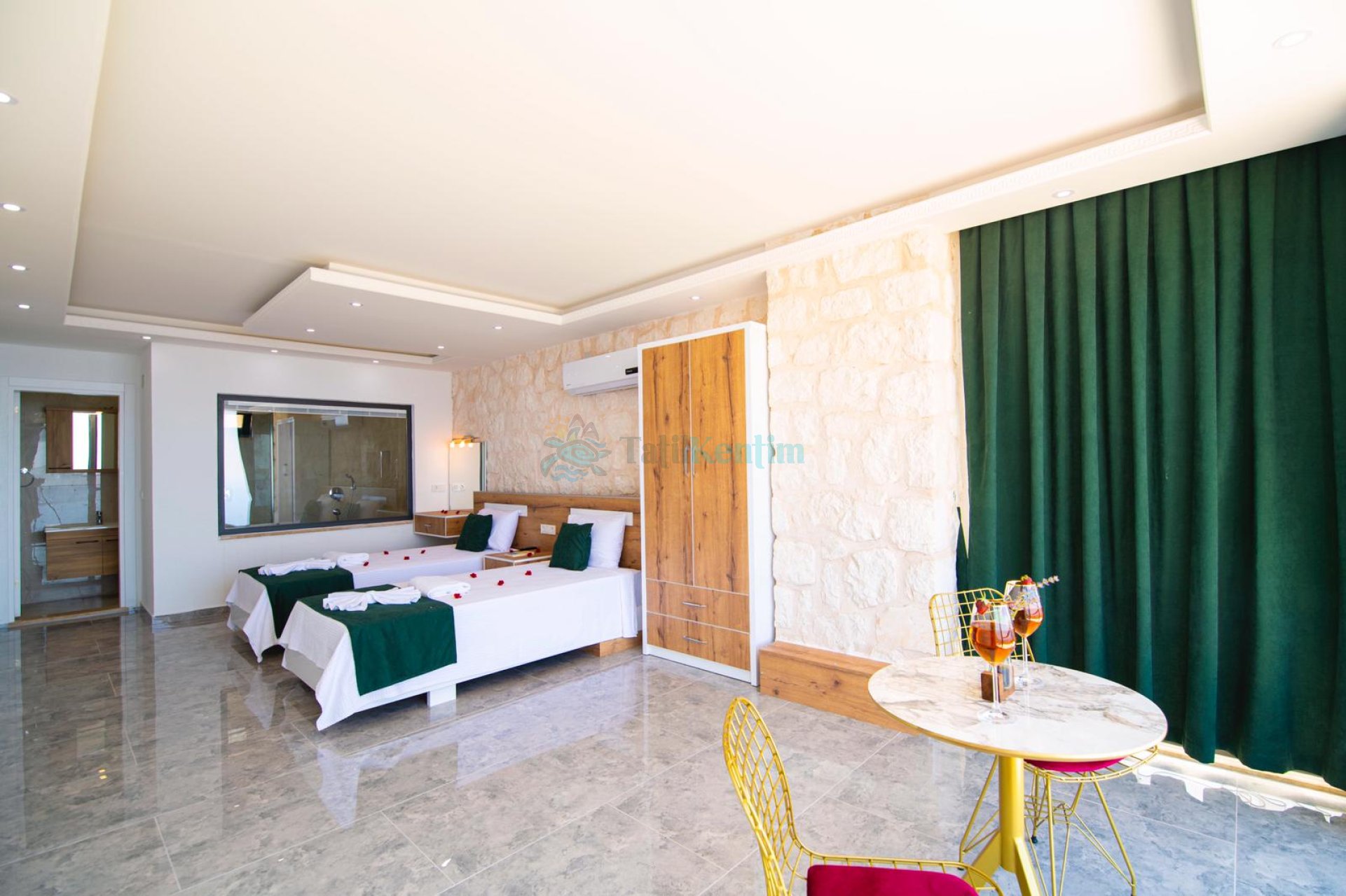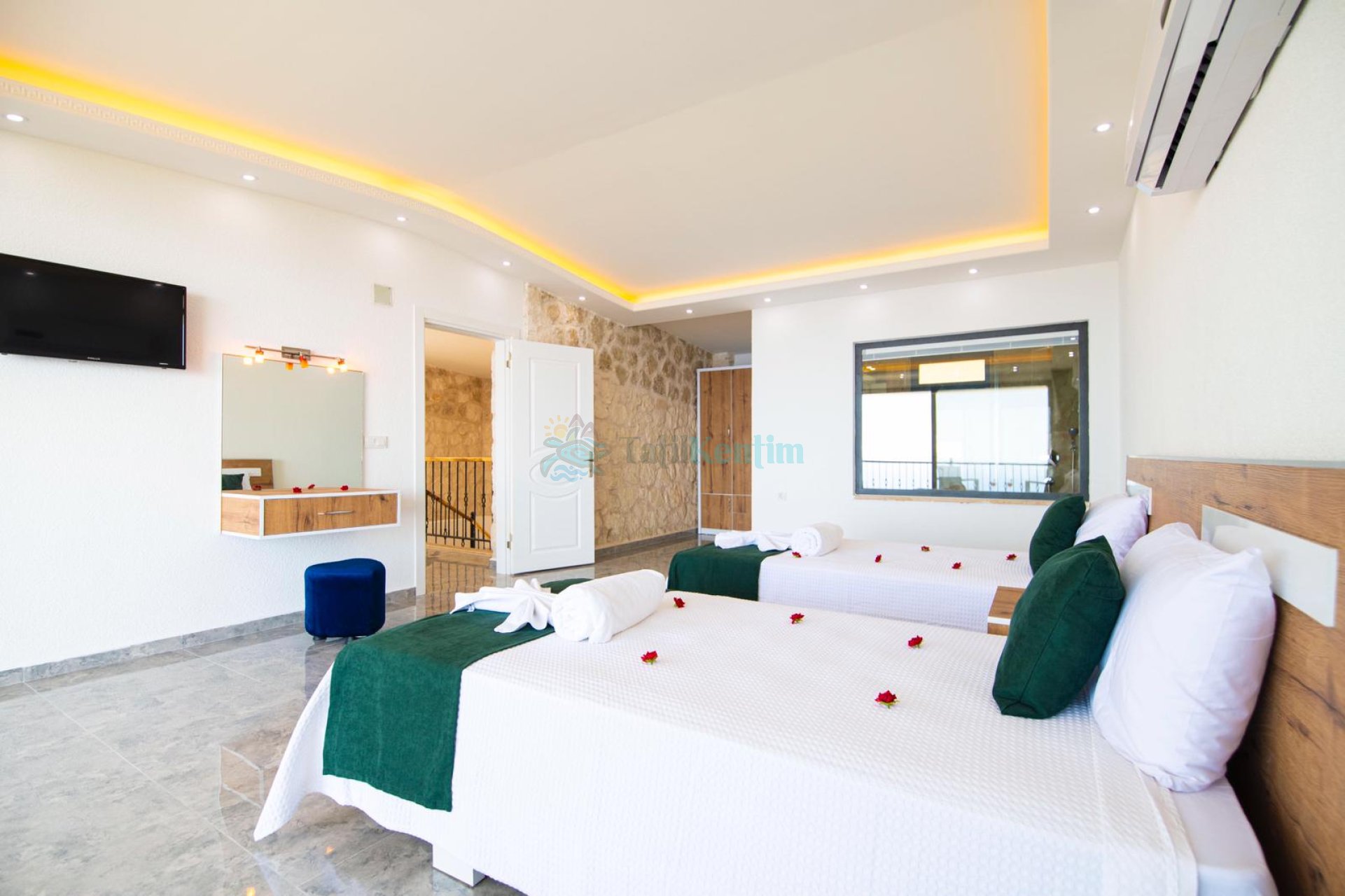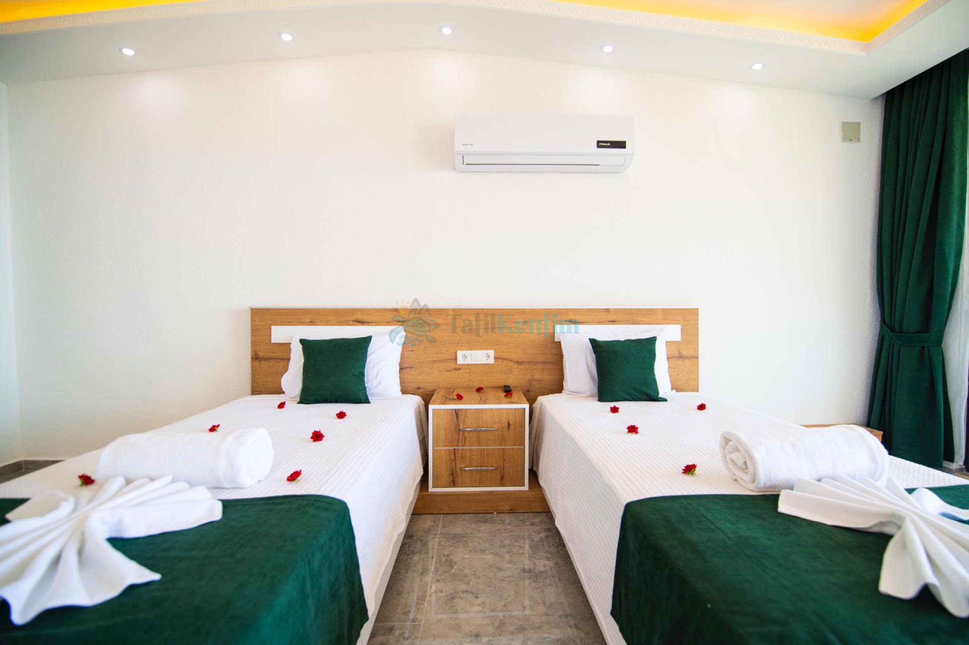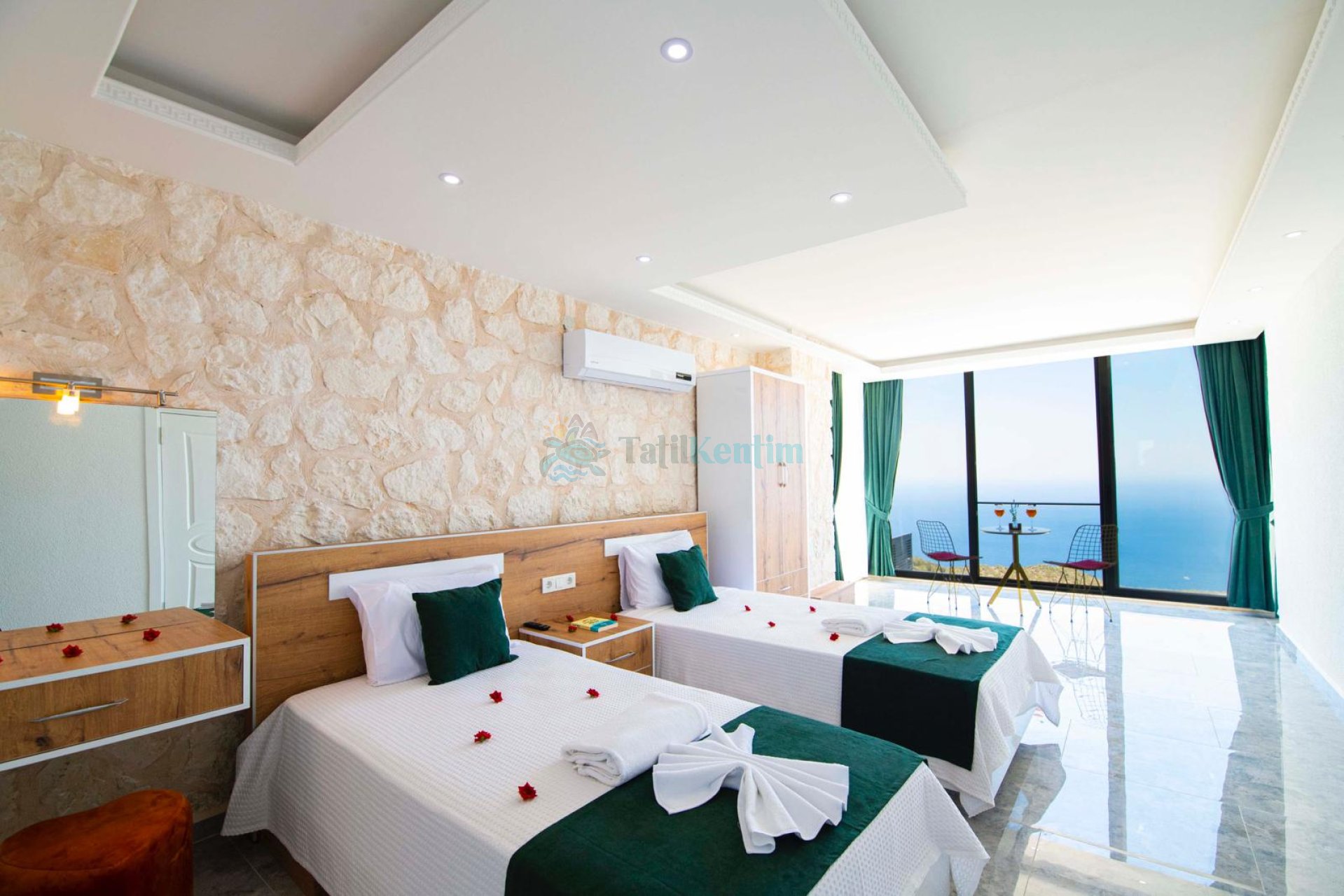 Kiralık villanın bu yatak odası içerisinde, 2 adet tek kişilik yatak, klima, elbise dolabı, komodin, makyaj masası, banyo ve tuvalet bulunmaktadır.