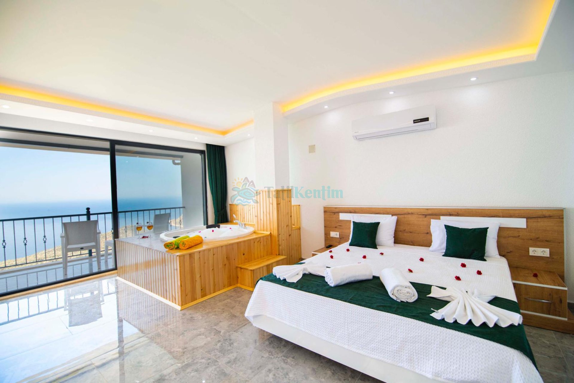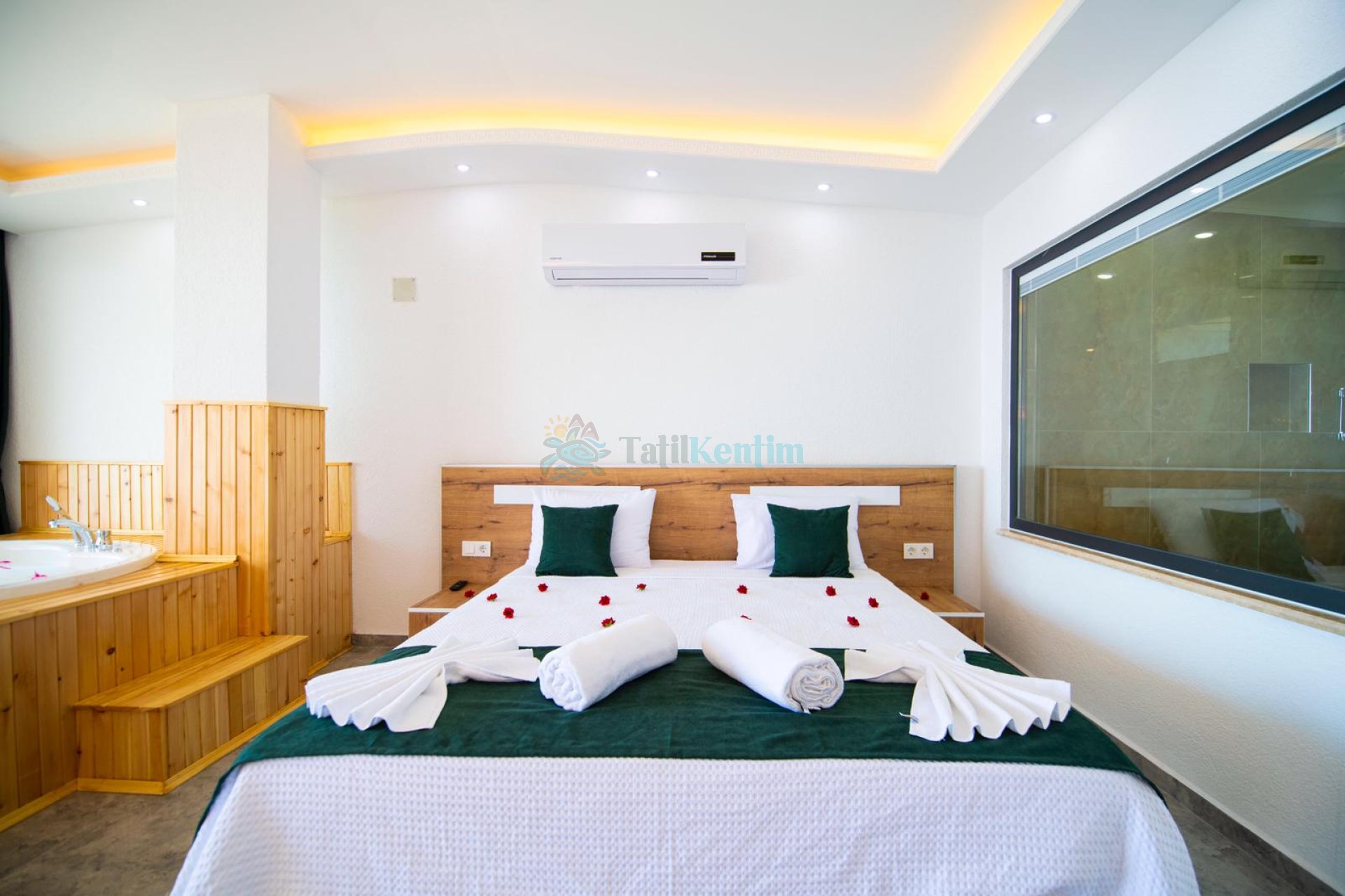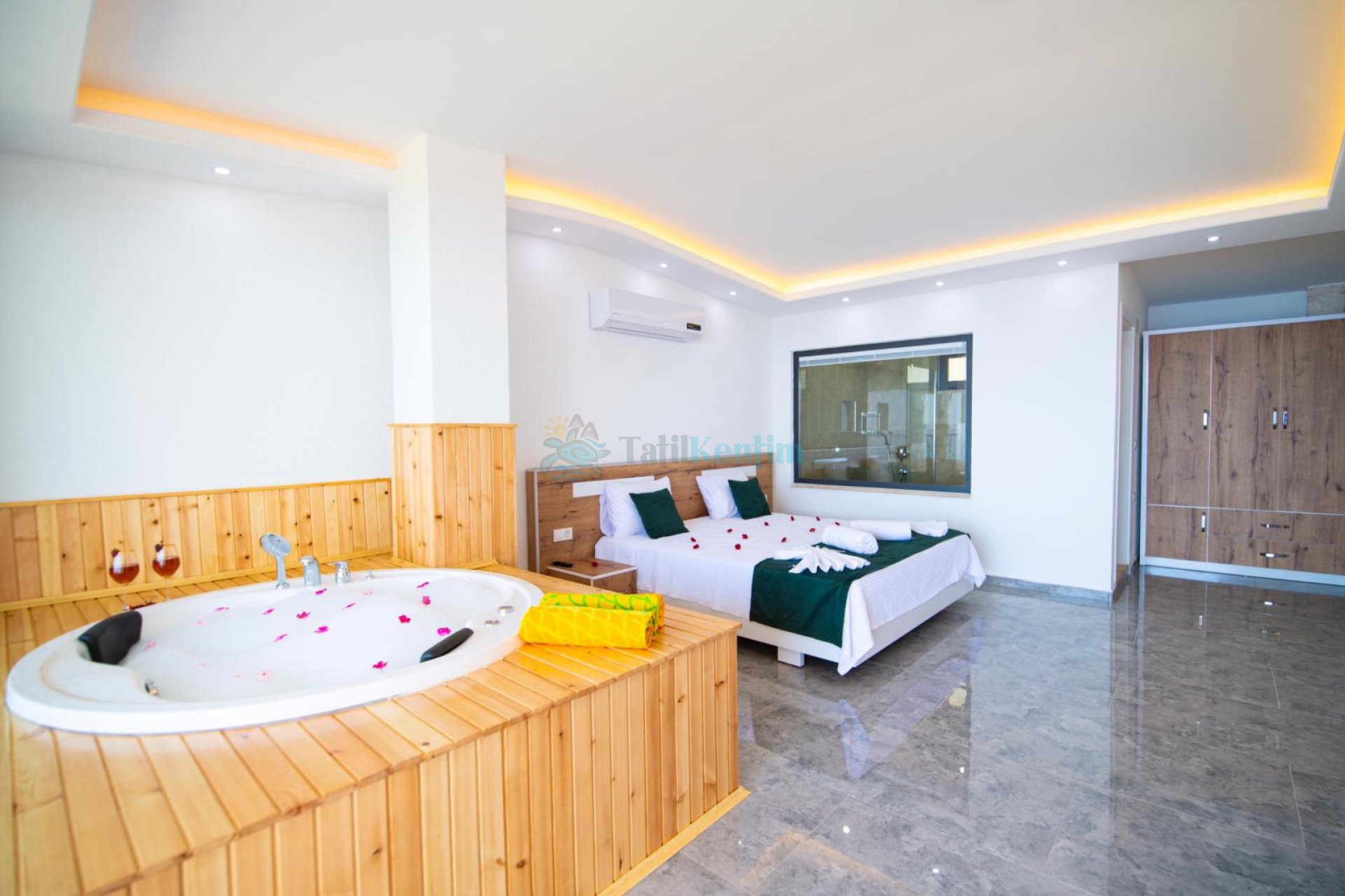Tatil villamıza ait bu yatak odası içerisinde, 1 adet çift kişilik yatak, klima, elbise dolabı, komodin, makyaj masası, jakuzi, banyo ve tuvalet alanları bulunmaktadır.