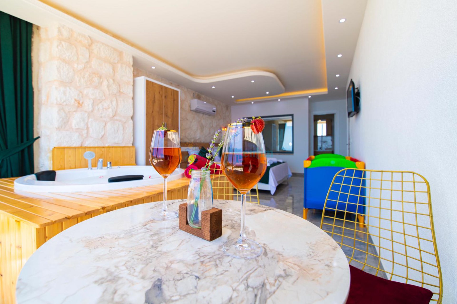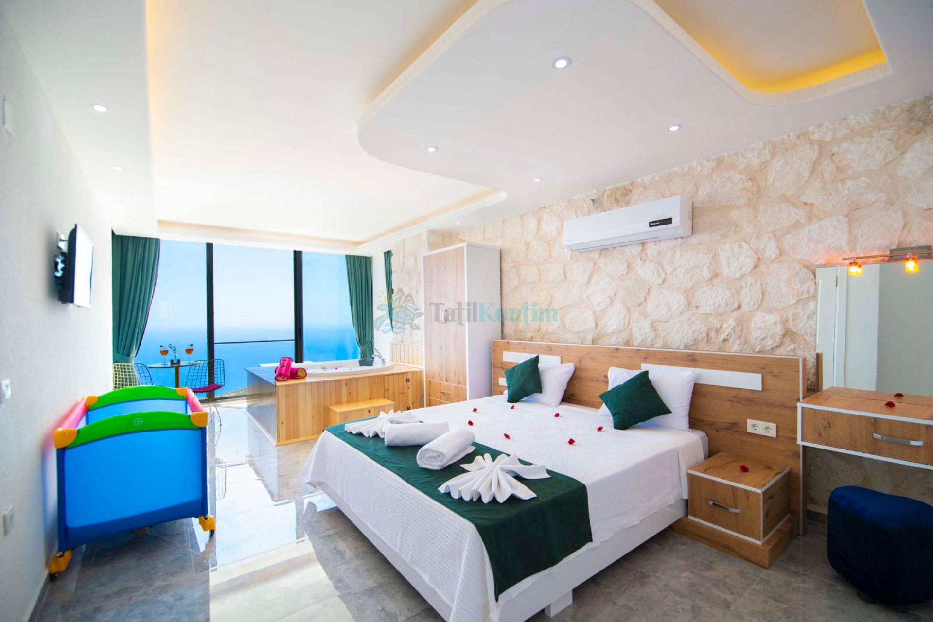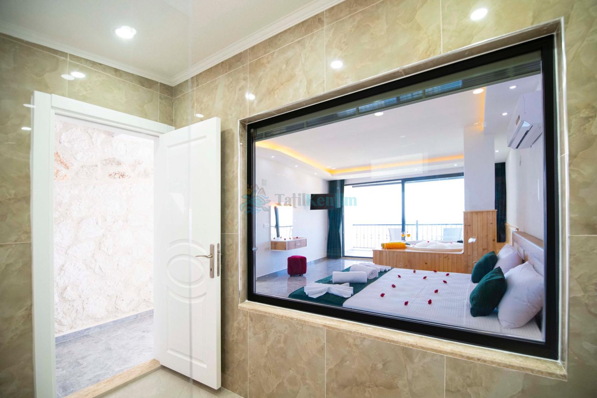 Tatil villamıza ait bu yatak odası içerisinde, 1 adet çift kişilik yatak, klima, elbise dolabı, komodin, makyaj masası, jakuzi, banyo ve tuvalet alanları bulunmaktadır.