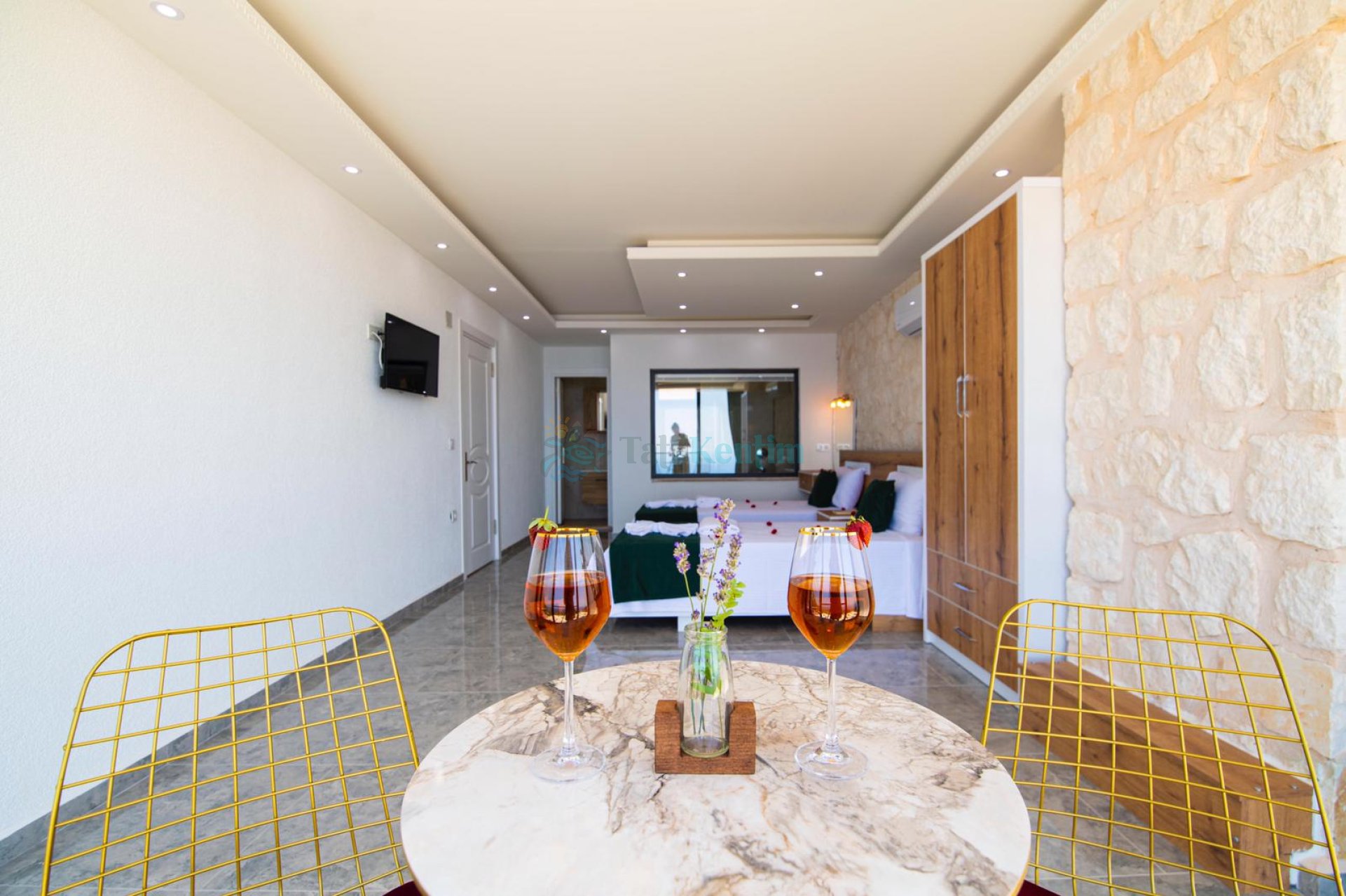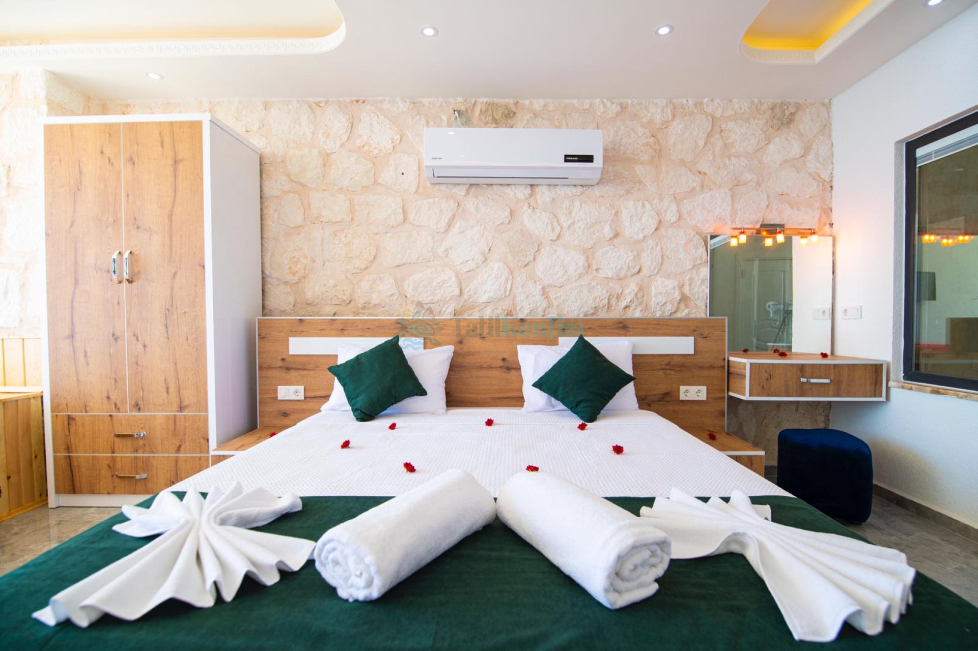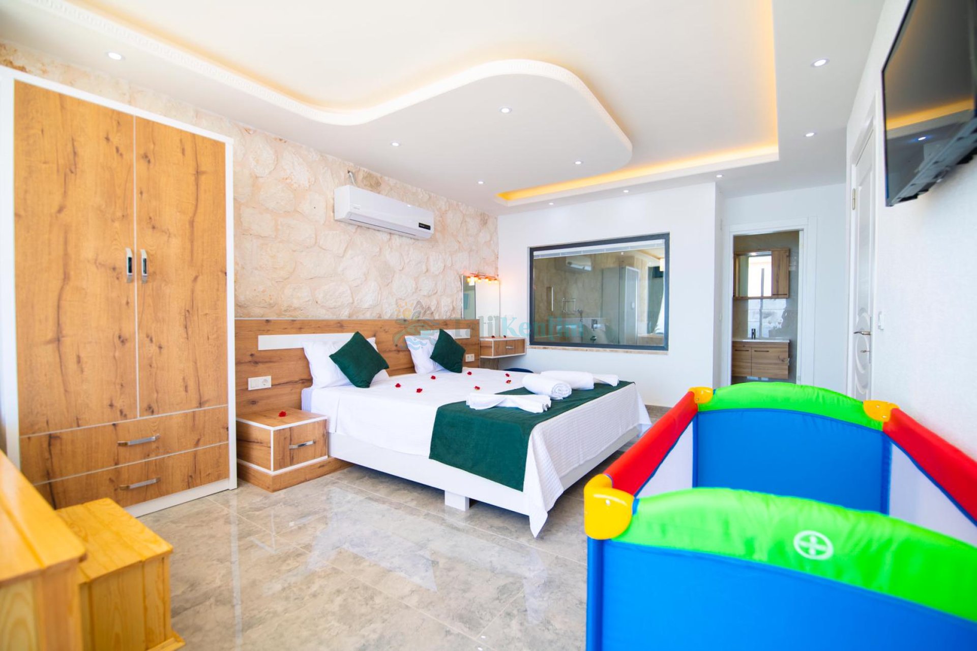 Kiralık villanın bu yatak odası içerisinde, 1 adet çift kişilik yatak, klima, elbise dolabı, komodin, makyaj masası, banyo ve tuvalet bulunmaktadır.