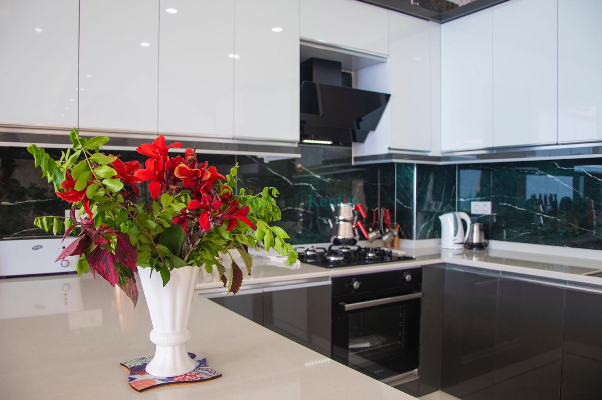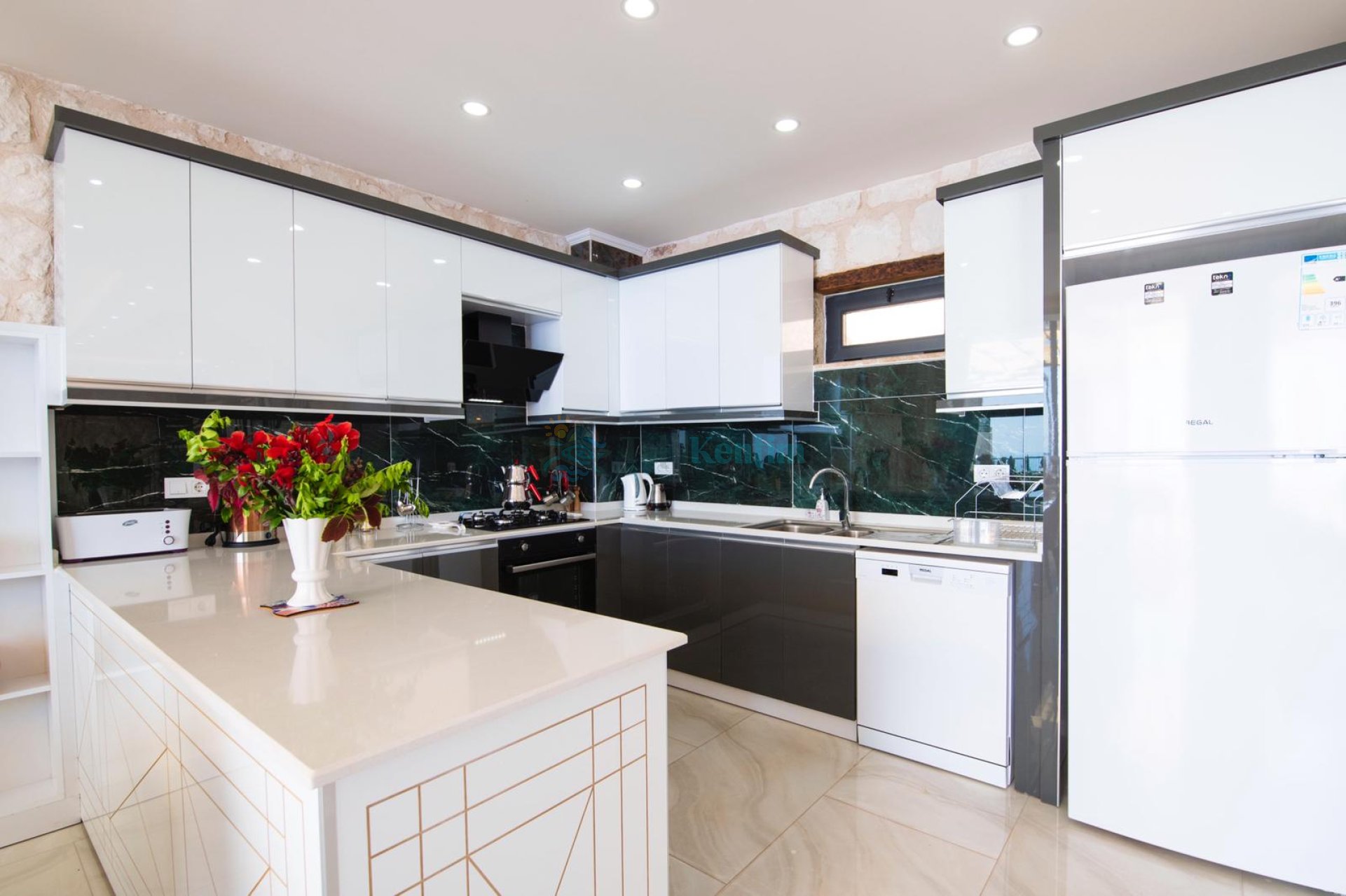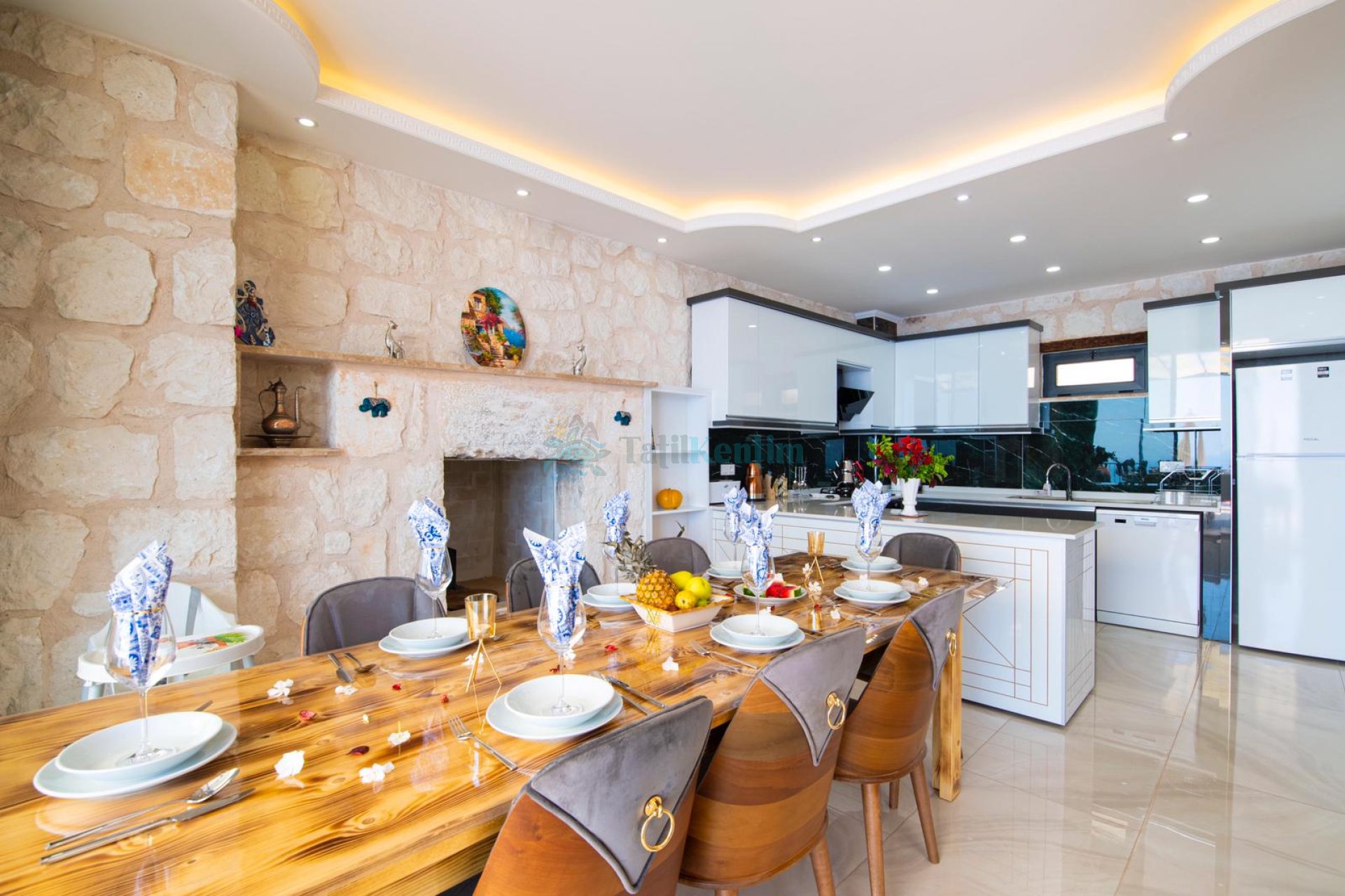 Yazlığımızın Amerikan mutfağı içerisinde, buzdolabı, bulaşık makinası, çamaşır makinası, yemek masası, yemek takımı, ankastre fırın, tost makinası, ankastre ocak, çaydanlık, su ısıtıcısı, çocuk masası, tava, tencere takımı ve gerekli olan tüm mutfak gereçleri yer almaktadır.
