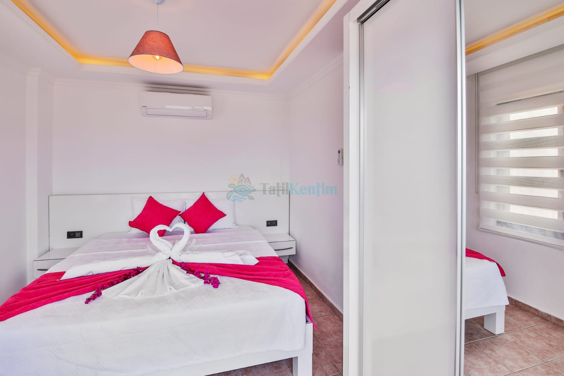 2.Yatak odası: Yatak odası içerisinde, 1 adet çift kişilik yatak, klima, elbise dolabı, komodin, makyaj masası, banyo ve tuvalet yer almaktadır.