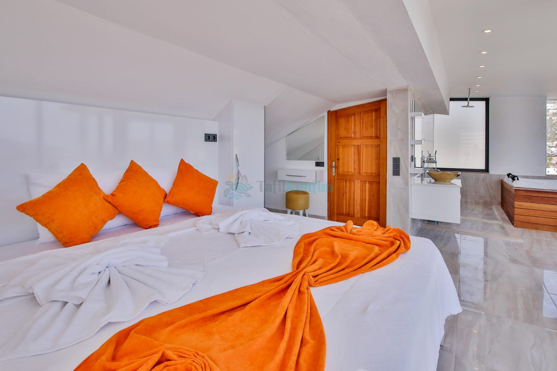 1.Yatak odası: Yatak odası içerisinde, 1 adet çift kişilik yatak, klima, elbise dolabı, komodin, makyaj masası, jakuzi, banyo ve tuvalet yer almaktadır.