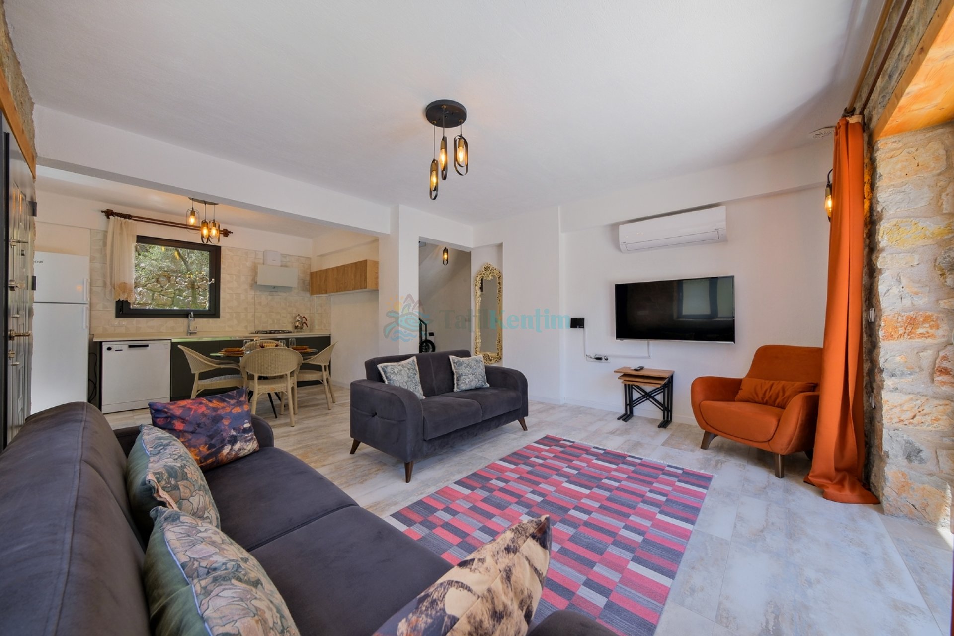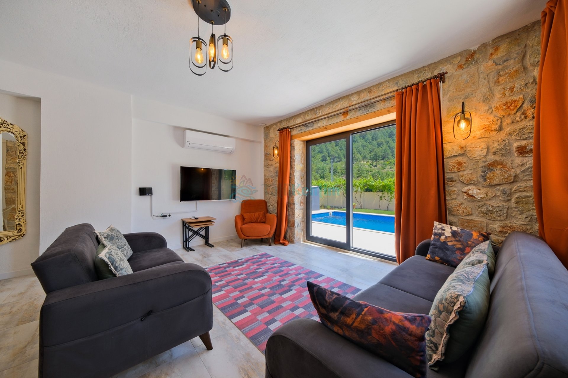 Doğa manzaralı salon içerisinde, koltuk takımı, orta sehpa, TV, TV ünitesi, klima, uydu alıcısı yer almaktadır.