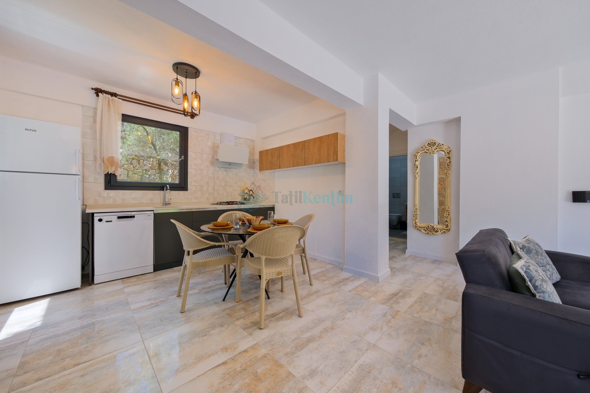 Amerikan mutfak içerisinde, buzdolabı, bulaşık makinası, çamaşır makinası, yemek masası, yemek takımı, ankastre fırın, tost makinası, ankastre ocak, çaydanlık, su ısıtıcısı, tava, tencere takımı ve gerekli olan tüm mutfak gereçleri yer almaktadır.
