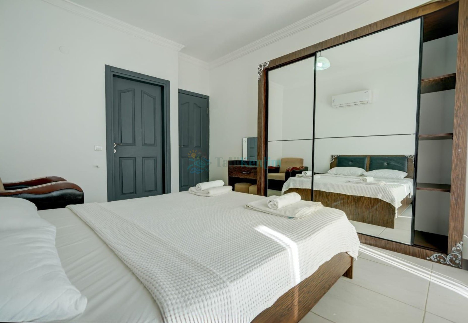 3.Yatak Odası: 1 adet çift kişilik yatak, klima, komodin, elbise dolabı , banyo ve tuvalet bulunmaktadır.