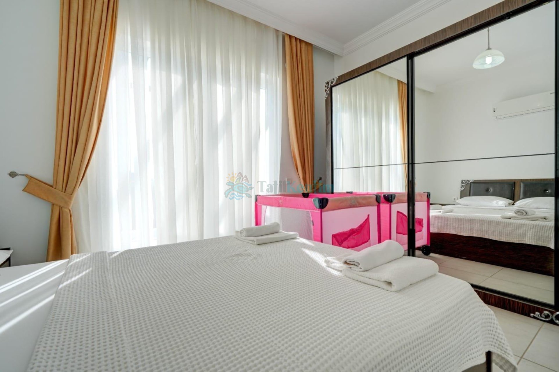 1.Yatak Odası: 1 adet çift kişilik yatak, klima, komodin, elbise dolabı, bebek yatağı, ortak kullanımda banyo ve tuvalet bulunmaktadır.