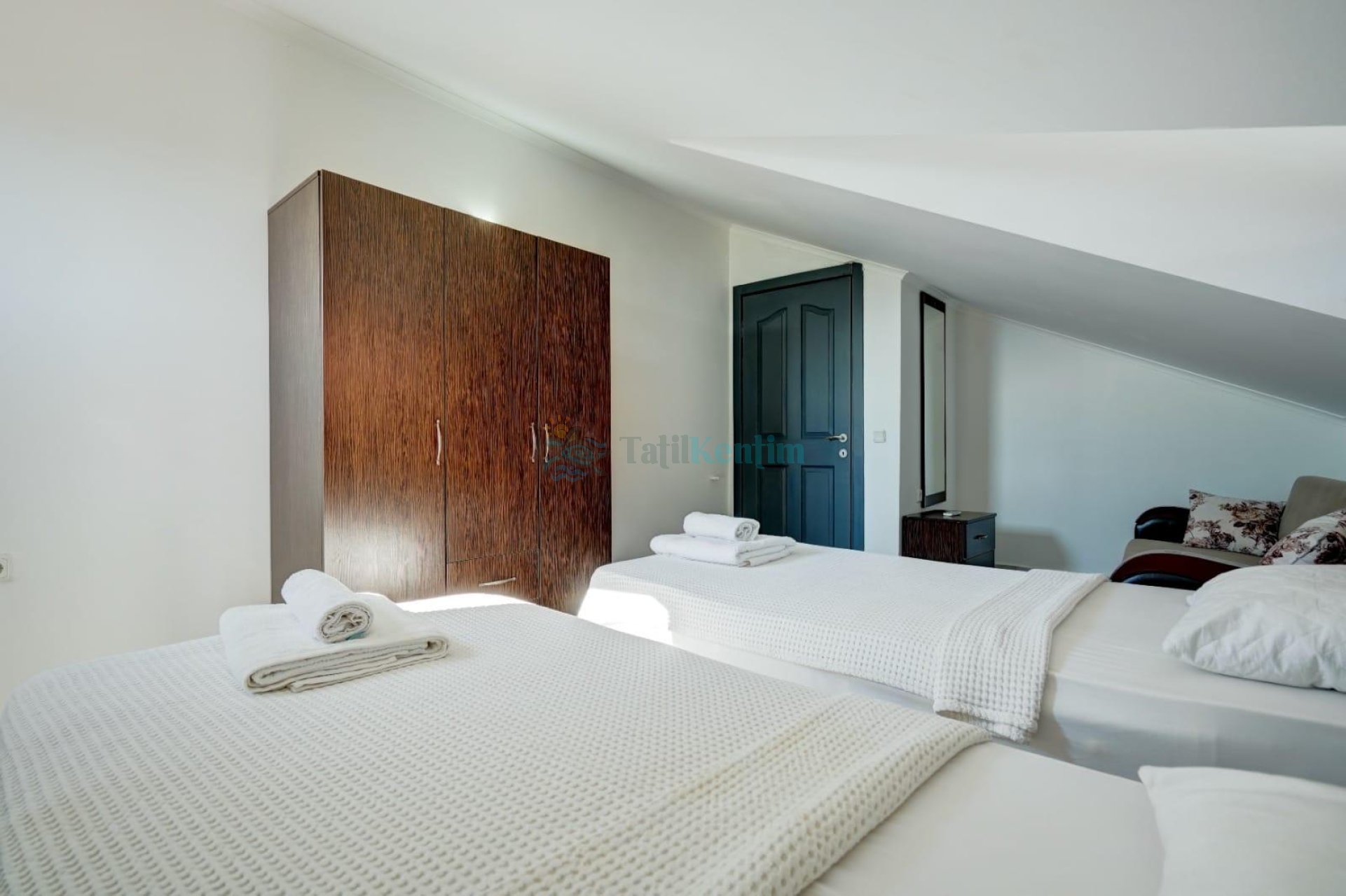 2.Yatak Odası: 2 adet tek kişilik yatak, klima, komodin, elbise dolabı, ortak kullanımda banyo ve tuvalet bulunmaktadır.