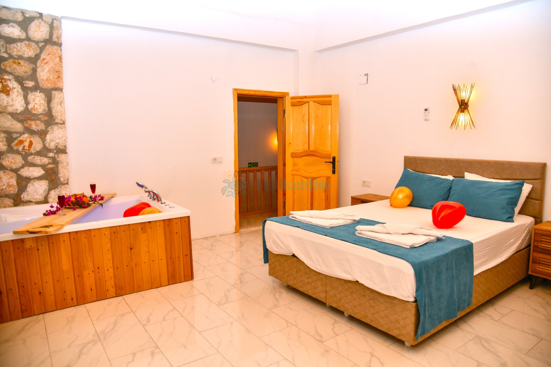 Yatak odası içerisinde, 1 adet çift kişilik yatak, klima, elbise dolabı, komodin, makyaj masası, jakuzi, bebek yatağı, banyo ve tuvalet yer almaktadır.