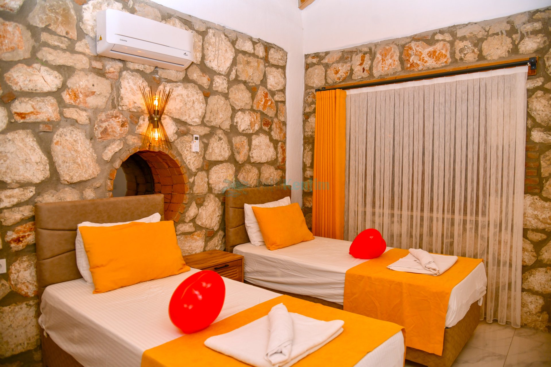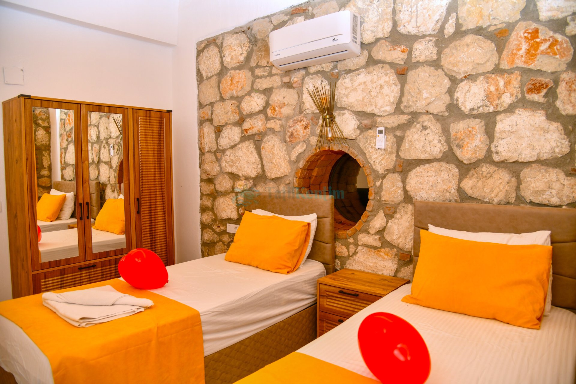 Yatak odası içerisinde, 2 adet tek kişilik yatak, klima, elbise dolabı, komodin, banyo ve tuvalet yer almaktadır.