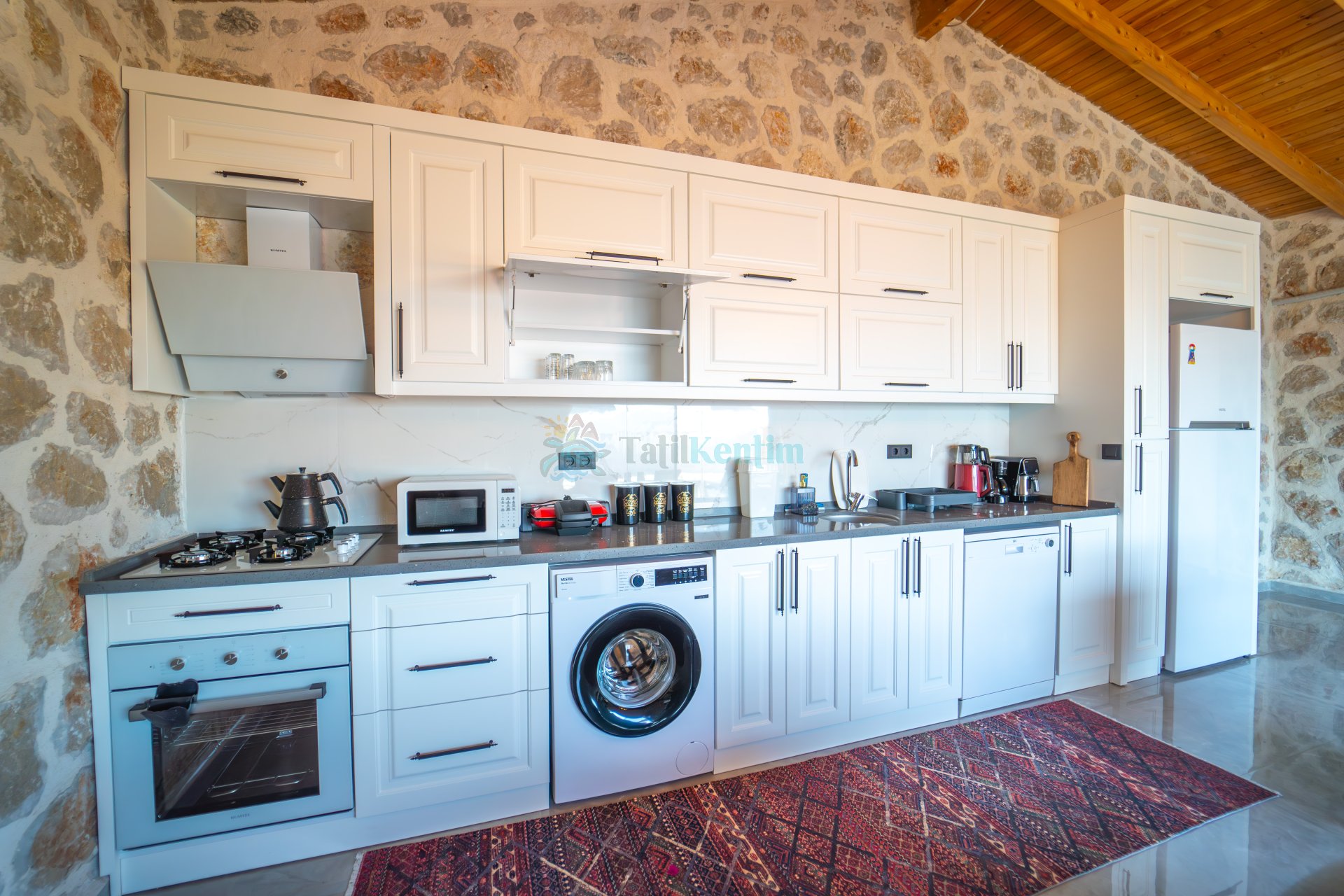 Amerikan mutfak içerisinde, buzdolabı, bulaşık makinası, çamaşır makinası, yemek masası, yemek takımı, ankastre fırın, mikrodalga fırın, tost makinası, ankastre ocak, çaydanlık, su ısıtıcısı, tava, tencere takımı ve gerekli olan tüm mutfak gereçleri yer almaktadır.