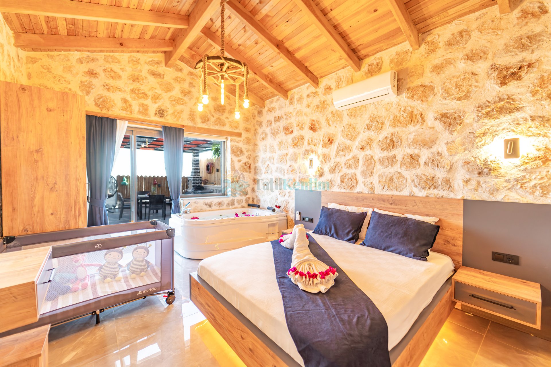 Yatak odası içerisinde, 1 adet çift kişilik yatak, klima, elbise dolabı, komodin, makyaj masası, jakuzi, banyo ve tuvalet yer almaktadır.