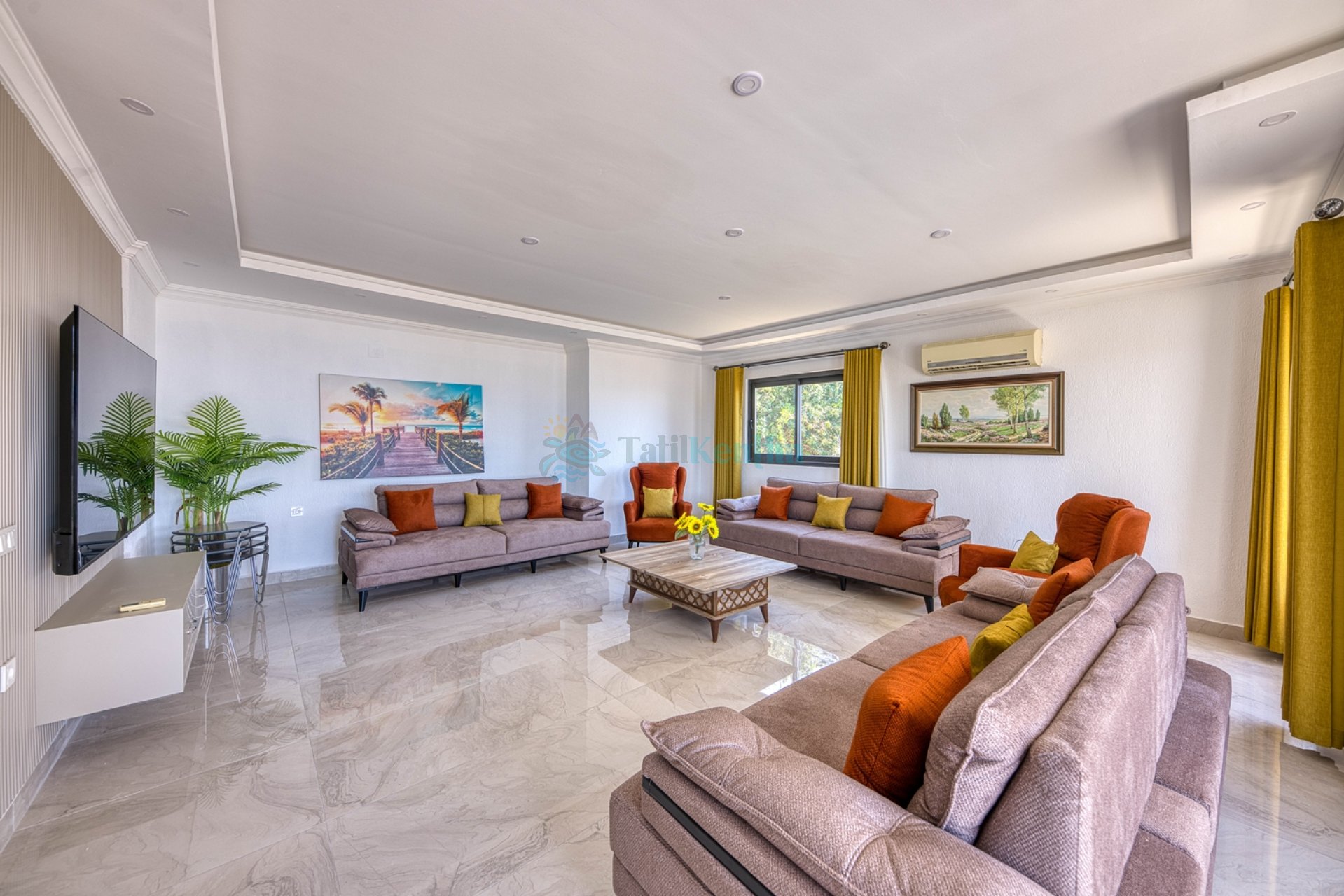 Salon: Villamızın salonunda; oturma grubu, klima, sehpa, TV, uydu alıcı ve kablosuz modem yer almaktadır.