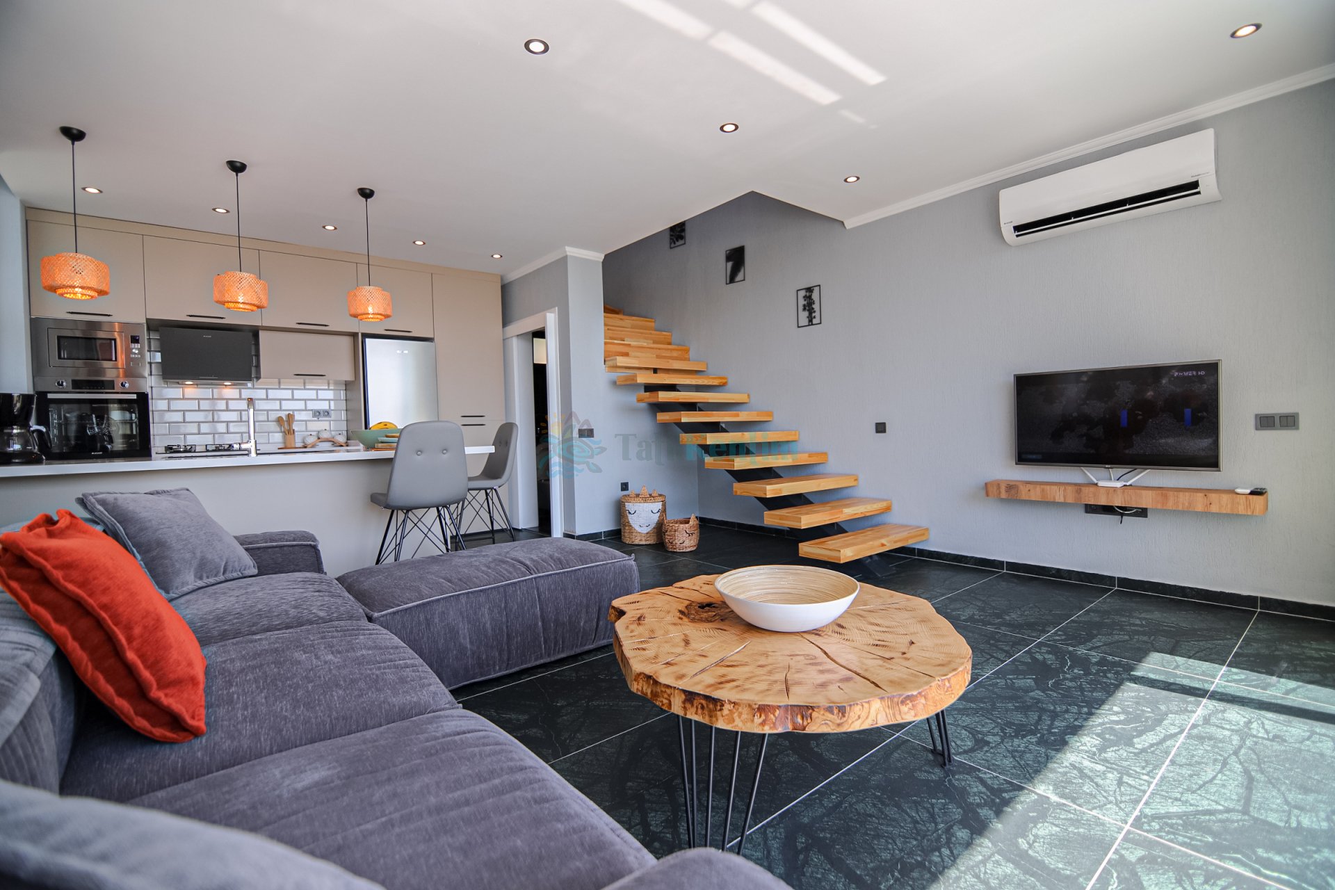 Salon : Salon içerisinde oturma grubu, TV, klima, sehpa bulunmaktadır. Havuz terasına çıkış yapılabilmektedir.