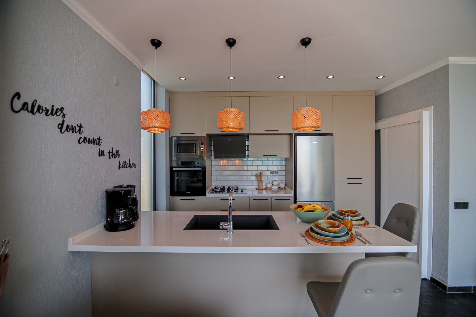 Mutfak : Modern Amerikan mutfak içerisinde 2 kişilik yemek masası, buzdolabı, bulaşık makinası, fırın, ocak, tost makinası, yemek masası, yemek takımları, çatal ve bıçak takımları, tencere ve tava takımları, bardaklar bulunmaktadır.