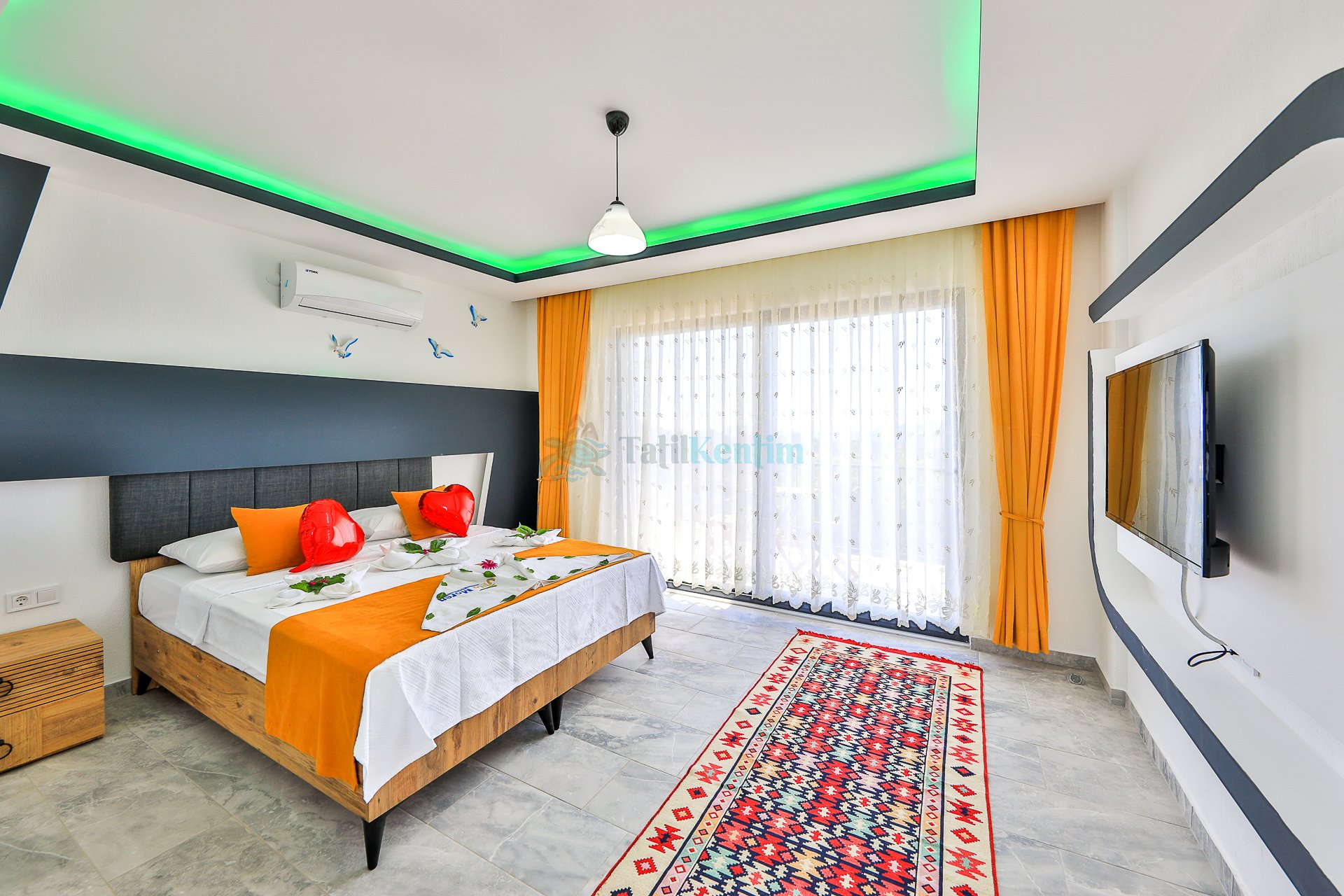1 Adet çift kişilik yatak, komodin, elbise dolabı, banyo ve klima bulunmaktadır.
