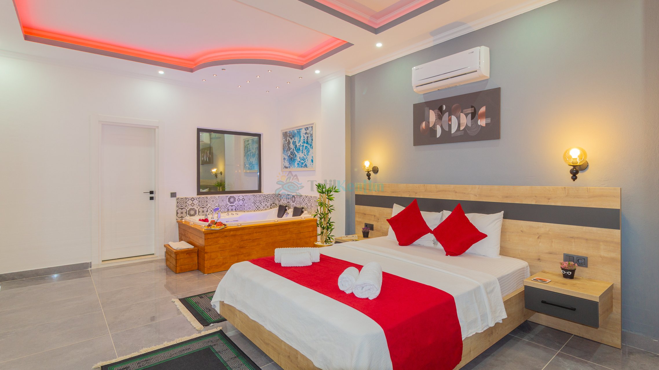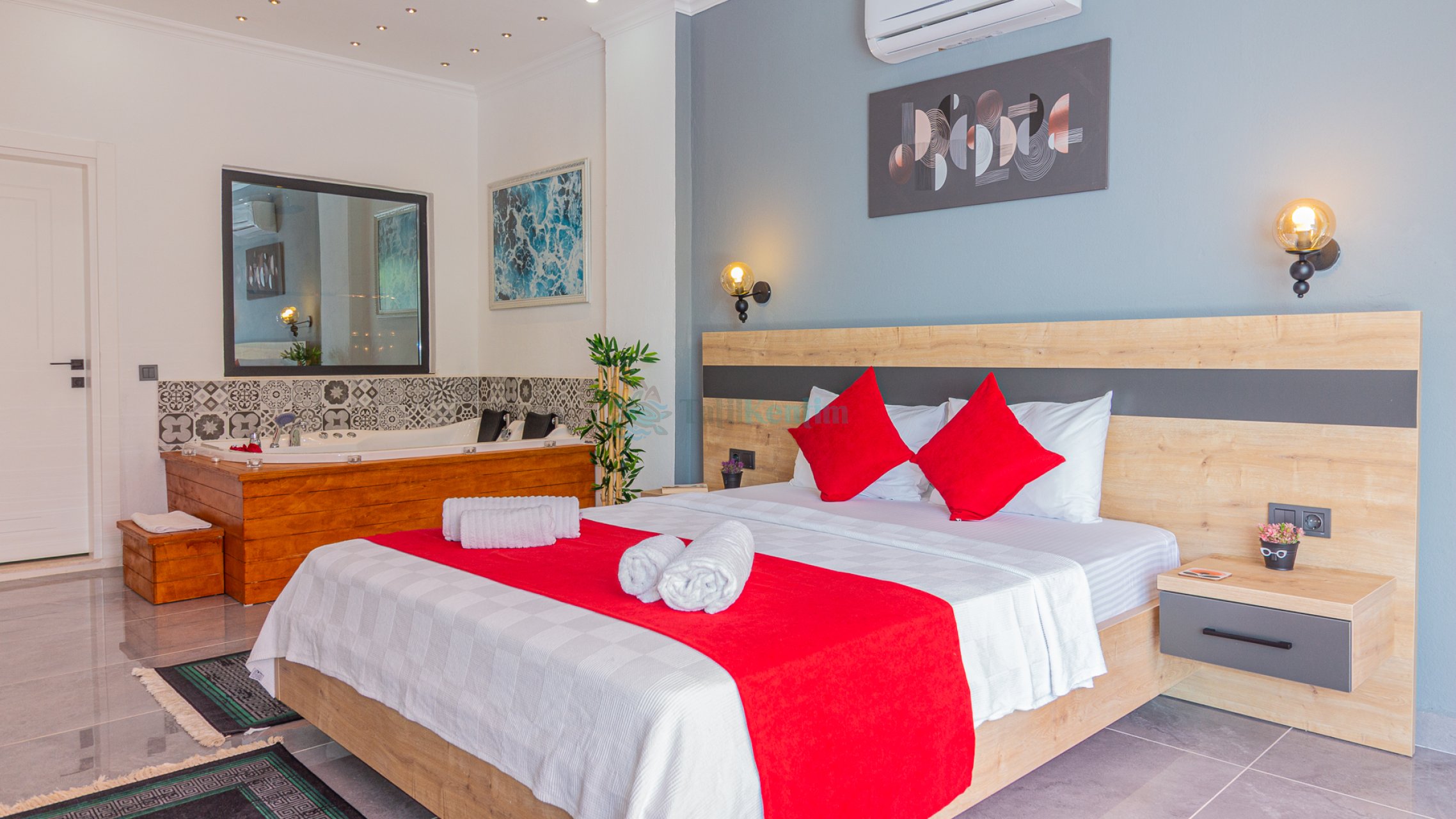 Tatil villamıza ait bu yatak odası içerisinde, 1 adet çift kişilik yatak, klima, elbise dolabı, TV, komodin, makyaj masası, jakuzi, banyo ve tuvalet alanları bulunmaktadır.