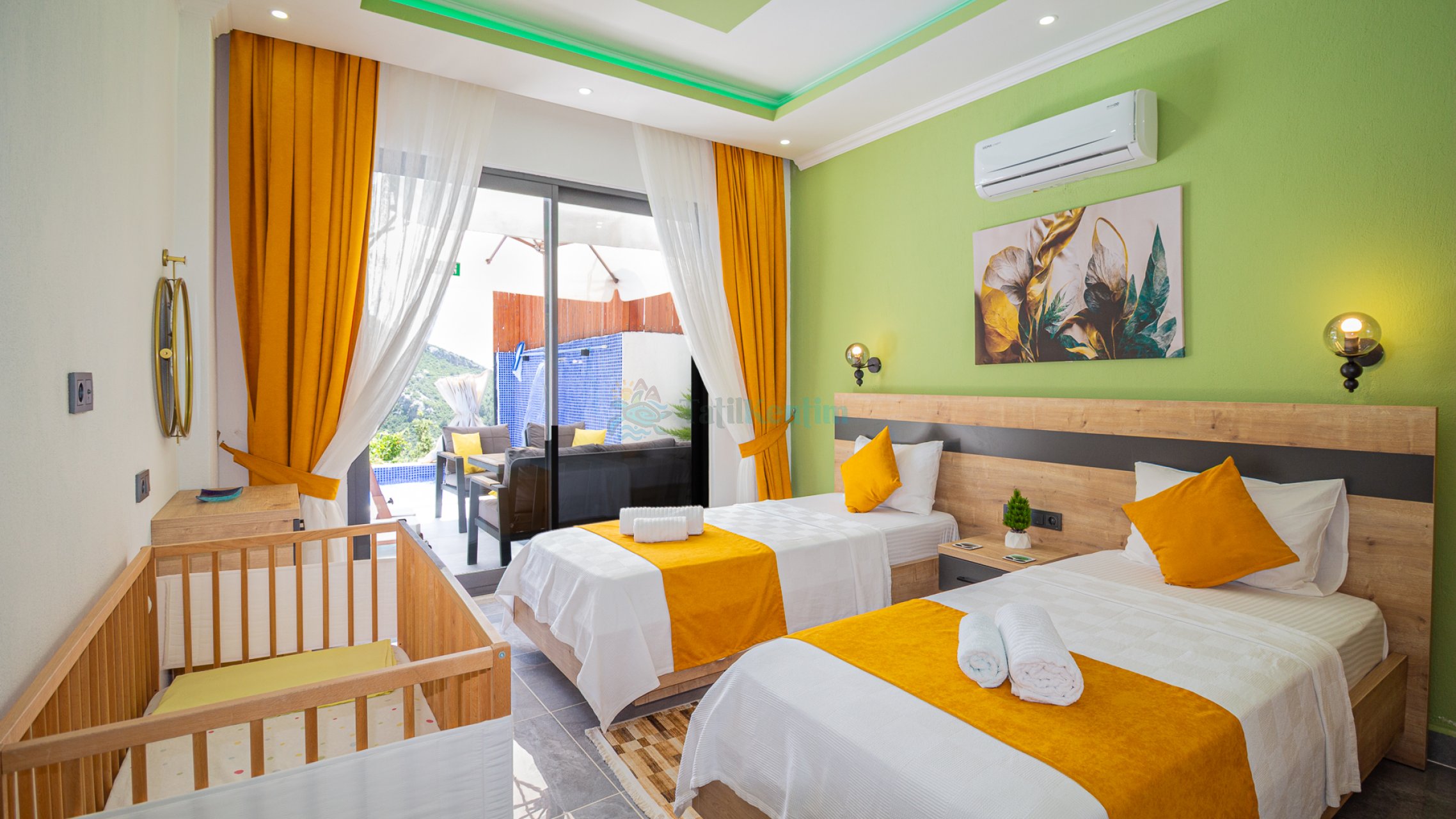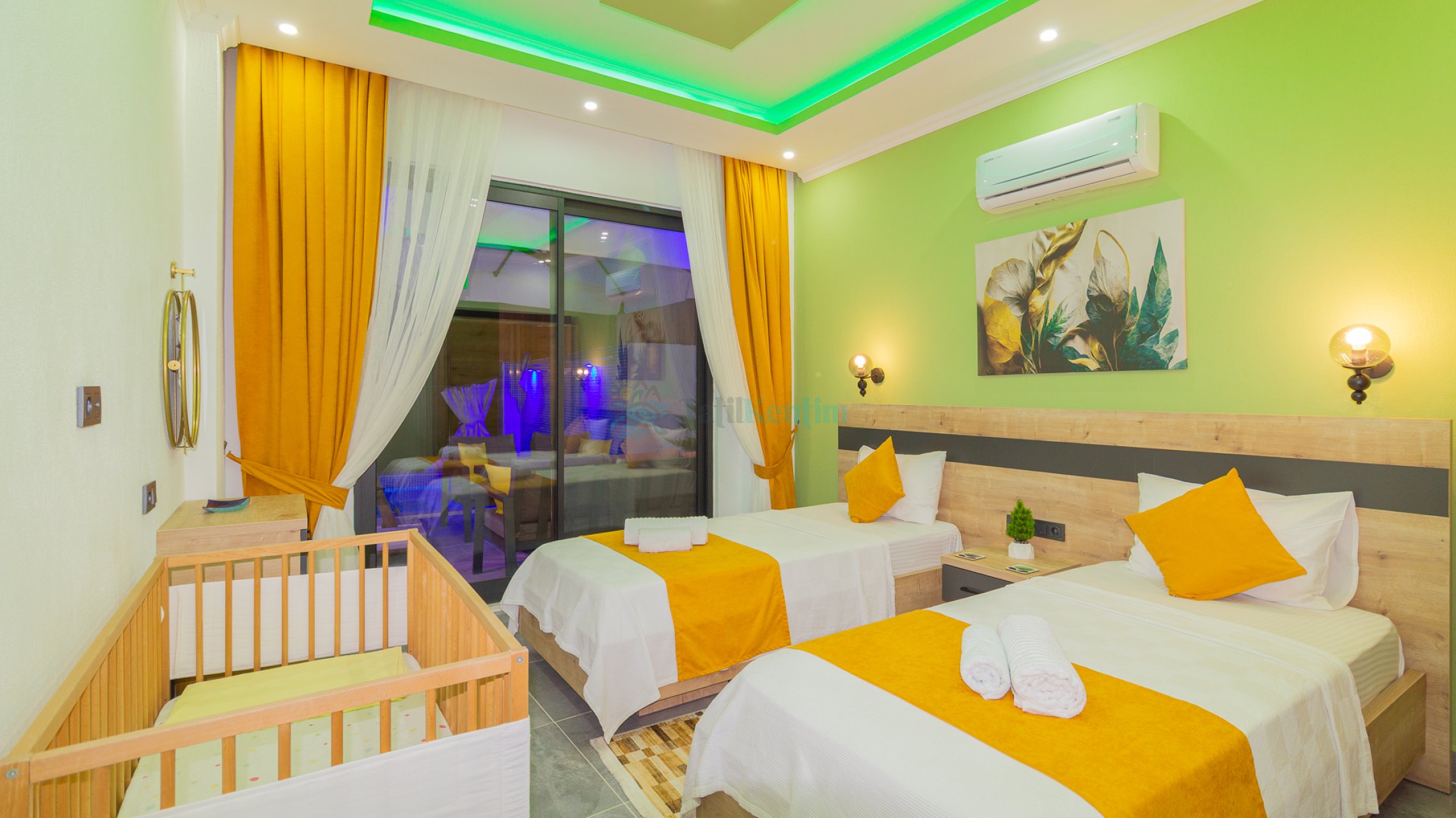 Kiralik villanın bu yatak odası içerisinde, 2 adet tek kişilik yatak, klima, elbise dolabı, komodin, makyaj masası, bebek yatağı, banyo ve tuvalet bulunmaktadır.