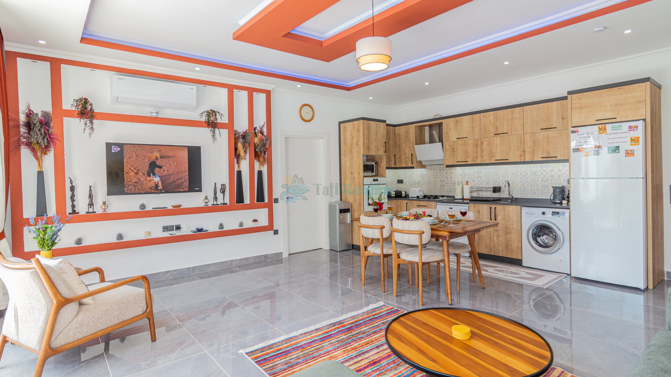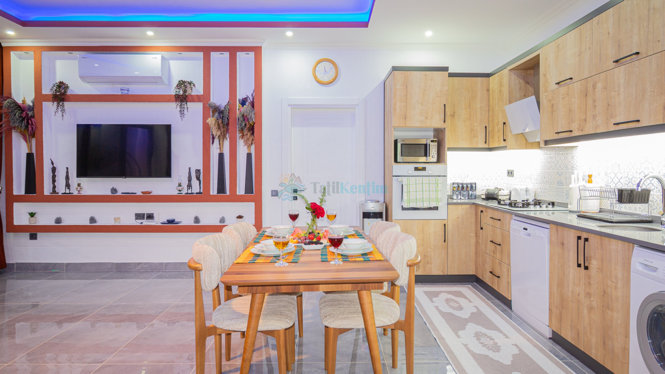 Yazlığımızın Amerikan mutfağı içerisinde, buzdolabı, bulaşık makinası, çamaşır makinası, yemek masası, yemek takımı, ankastre fırın, tost makinası, ankastre ocak, çaydanlık, su ısıtıcısı, çocuk masası, tava, tencere takımı ve gerekli olan tüm mutfak gereçleri yer almaktadır.
