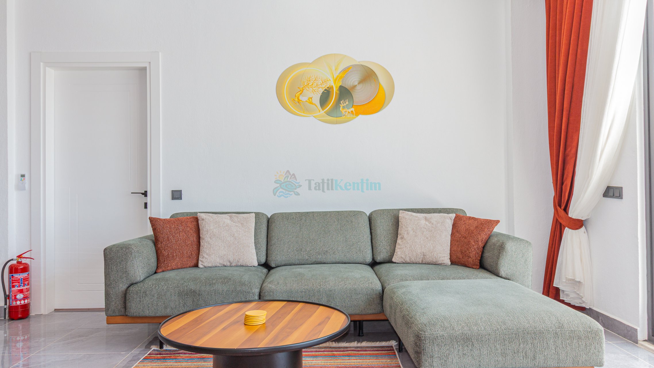 Villamızın doğa manzaralı salonu içerisinde, koltuk takımı, orta sehpa, TV, TV ünitesi, klima, uydu alıcısı yer almaktadır.