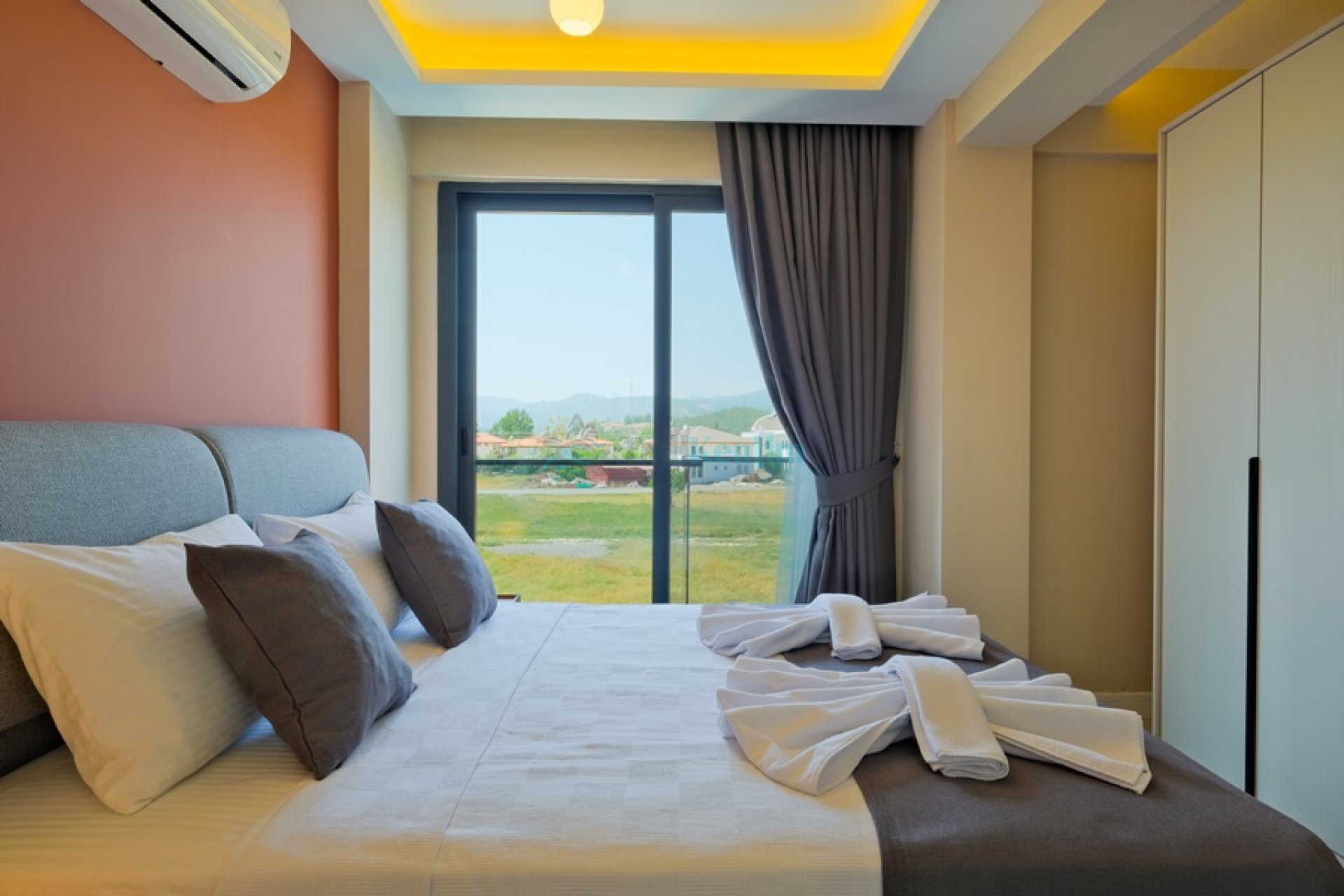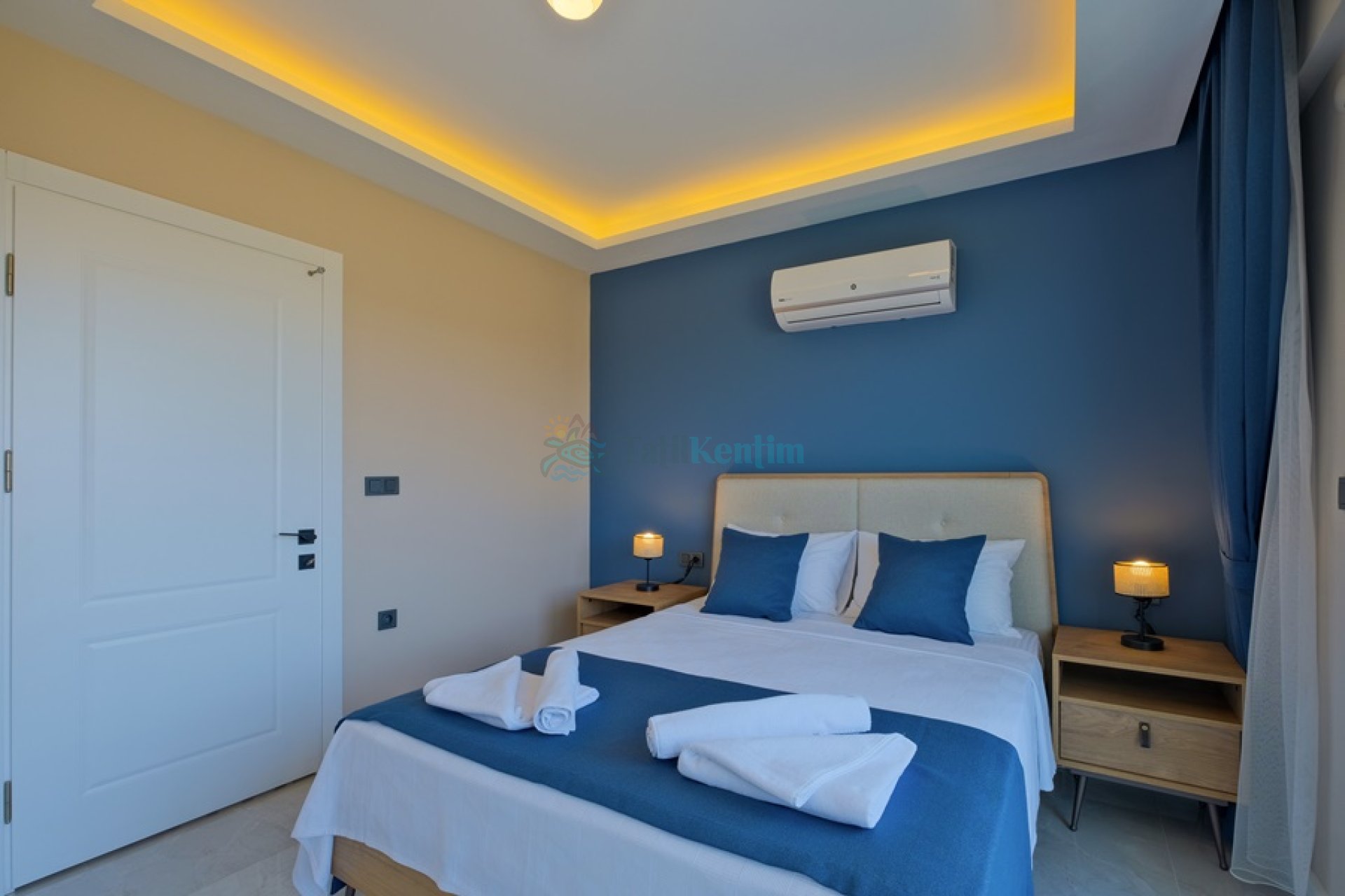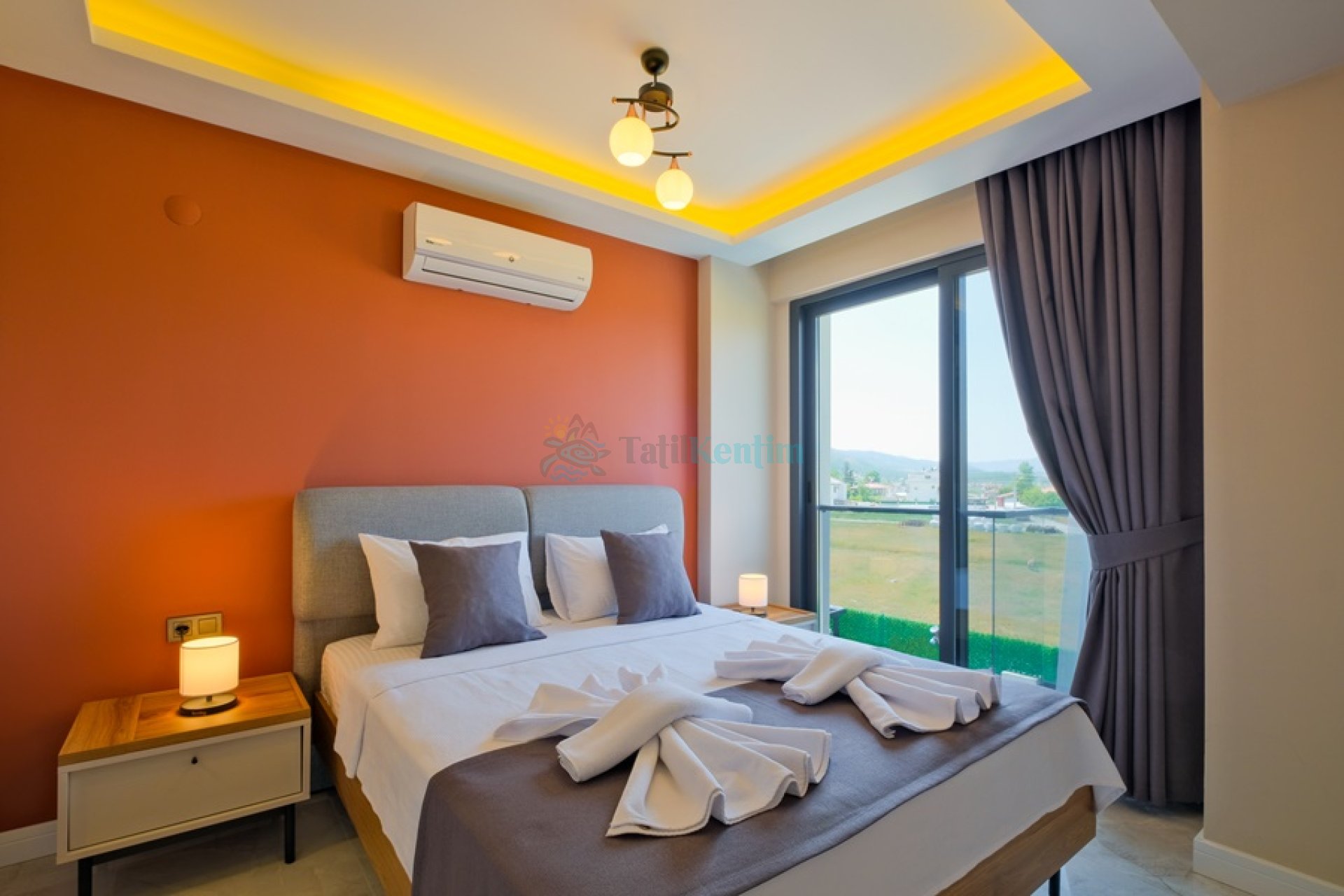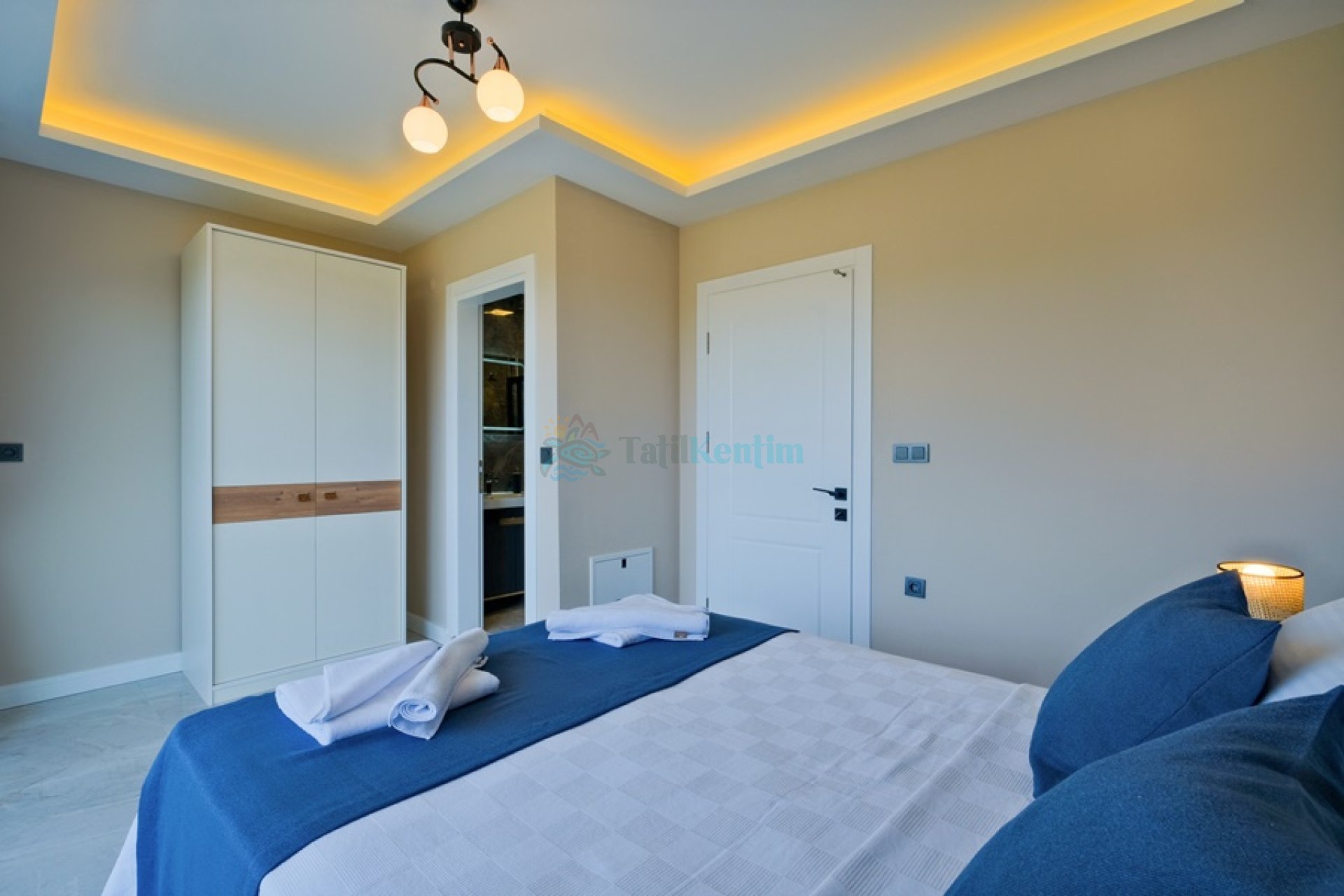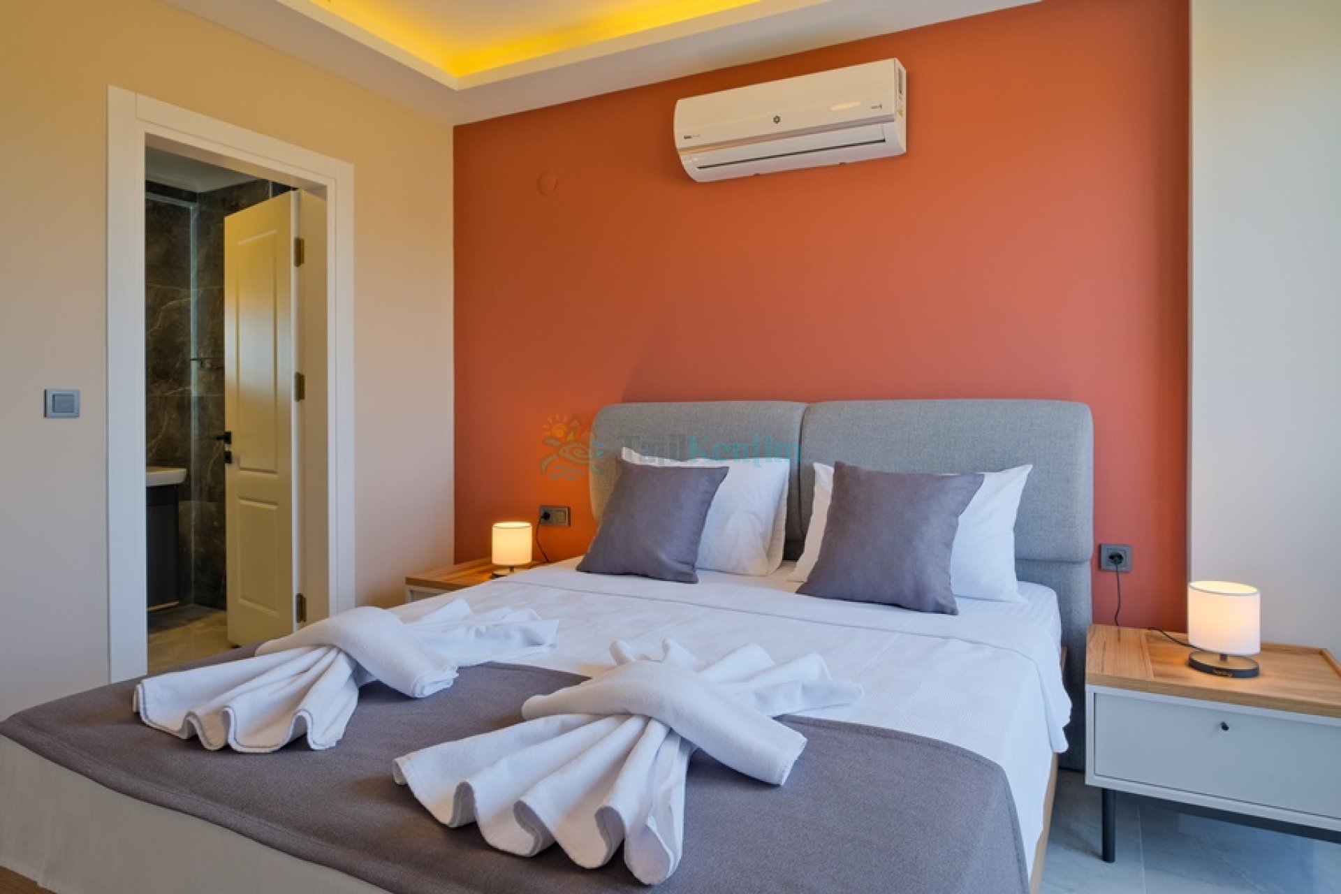 Yatak odası içerisinde, 1 adet çift kişilik yatak, klima, elbise dolabı, komodin, banyo ve tuvalet yer almaktadır.