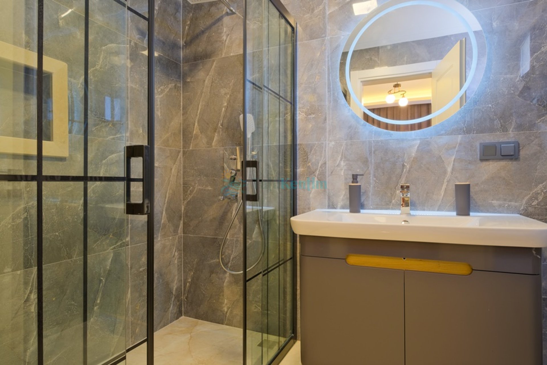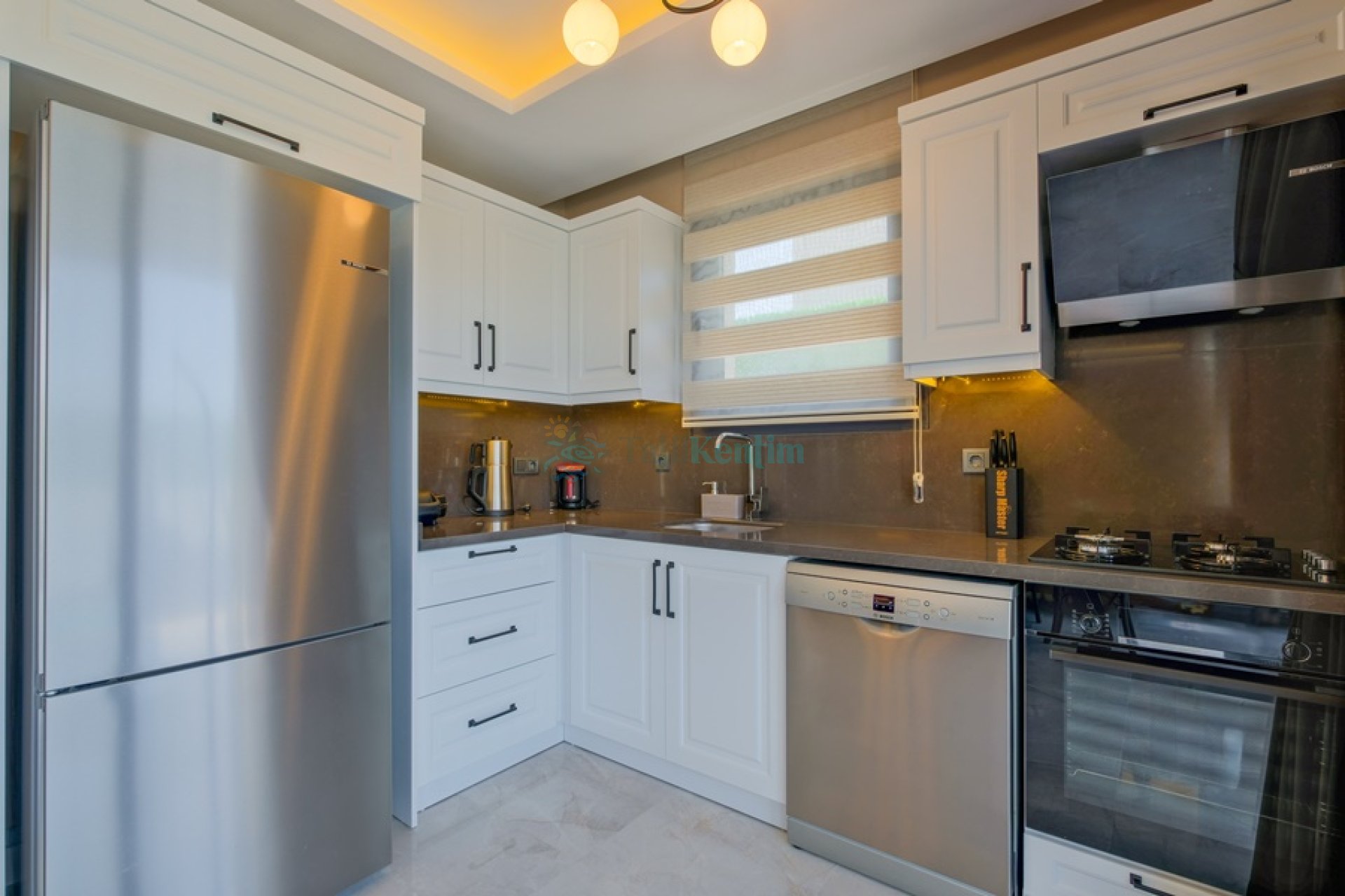 Amerikan mutfak içerisinde, buzdolabı, bulaşık makinası, çamaşır makinası, yemek masası, yemek takımı, ankastre fırın, tost makinası, ankastre ocak, çaydanlık, su ısıtıcısı, tava, tencere takımı ve gerekli olan tüm mutfak gereçleri yer almaktadır.