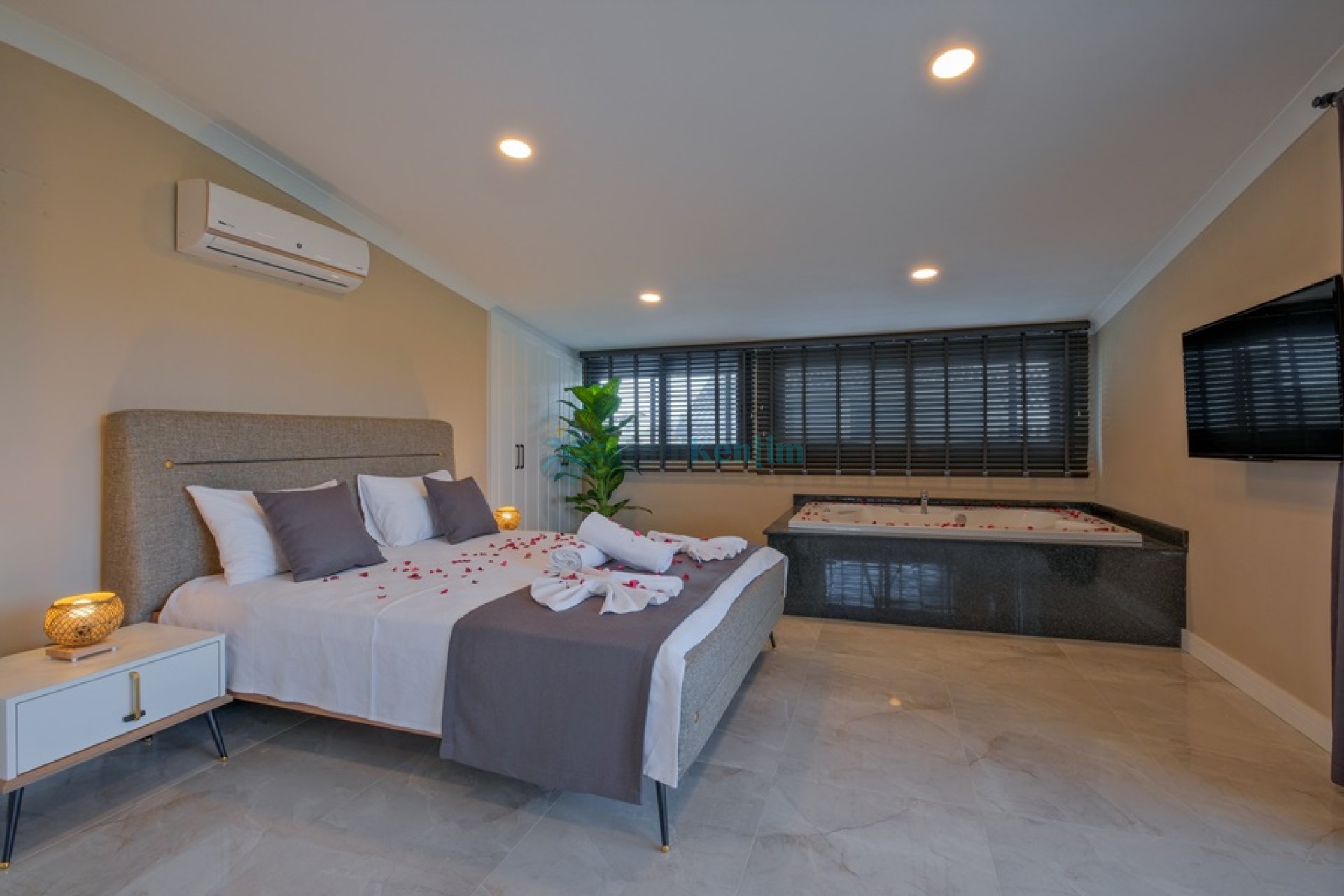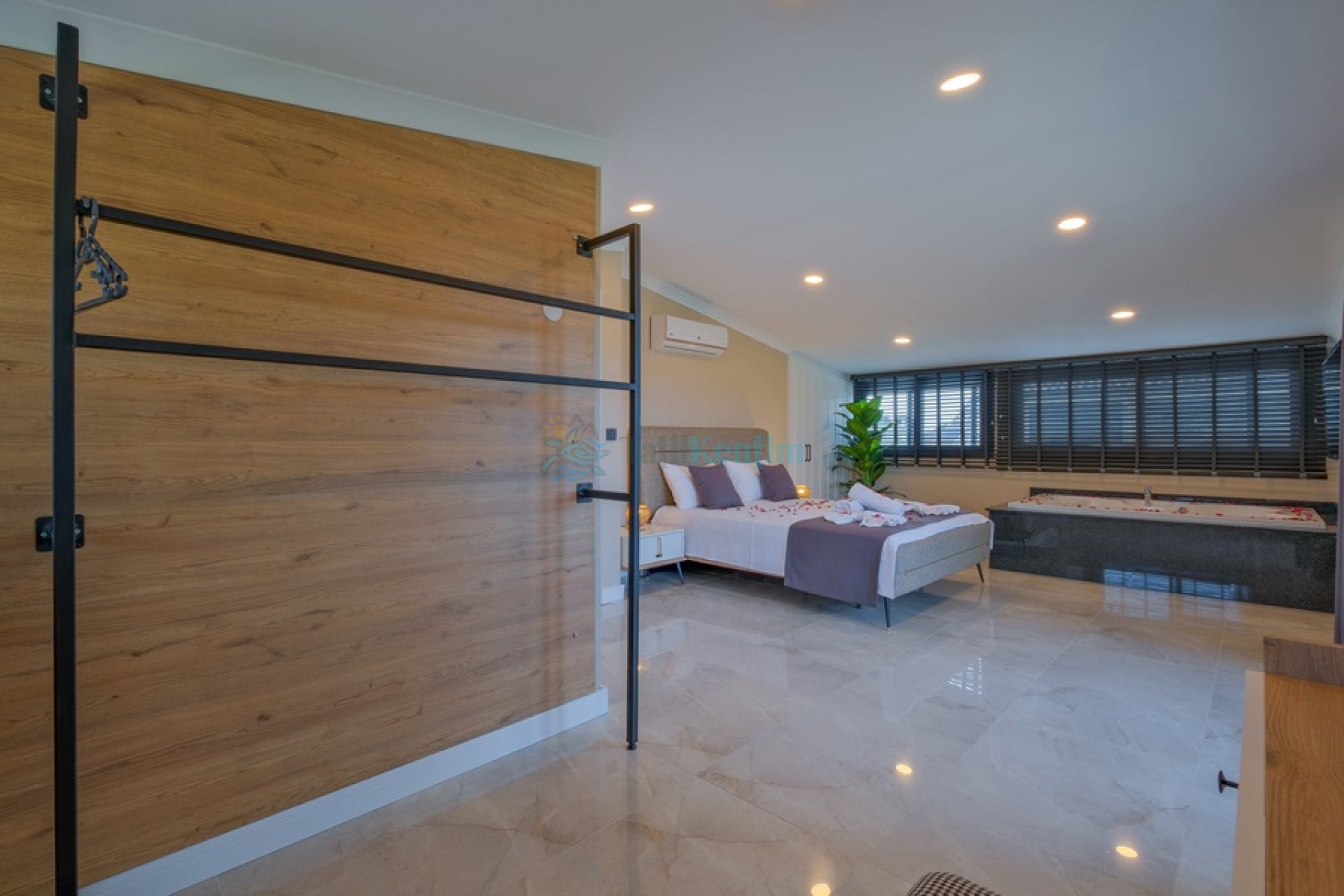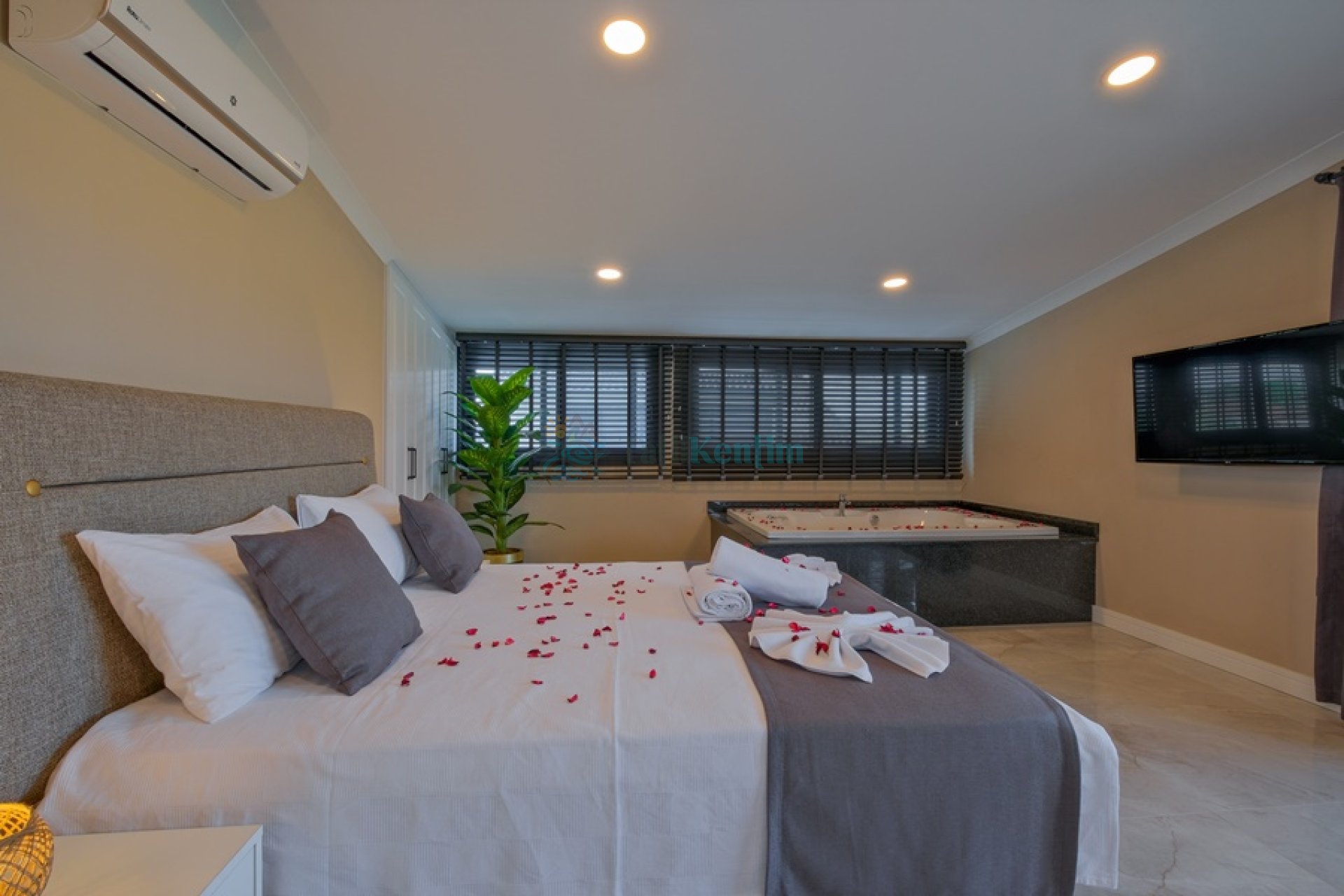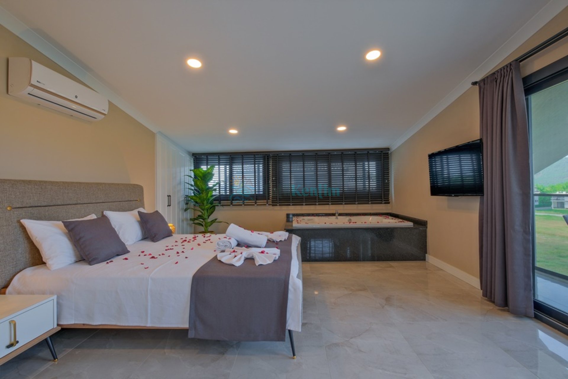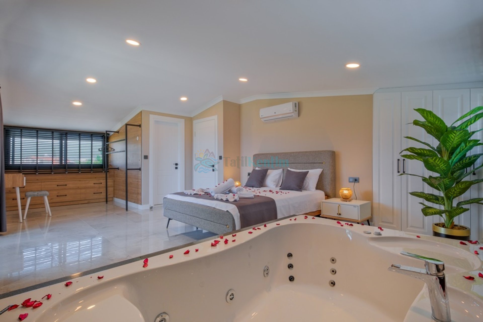 Yatak odası içerisinde, 1 adet çift kişilik yatak, klima, elbise dolabı, komodin, jakuzi, banyo ve tuvalet yer almaktadır.