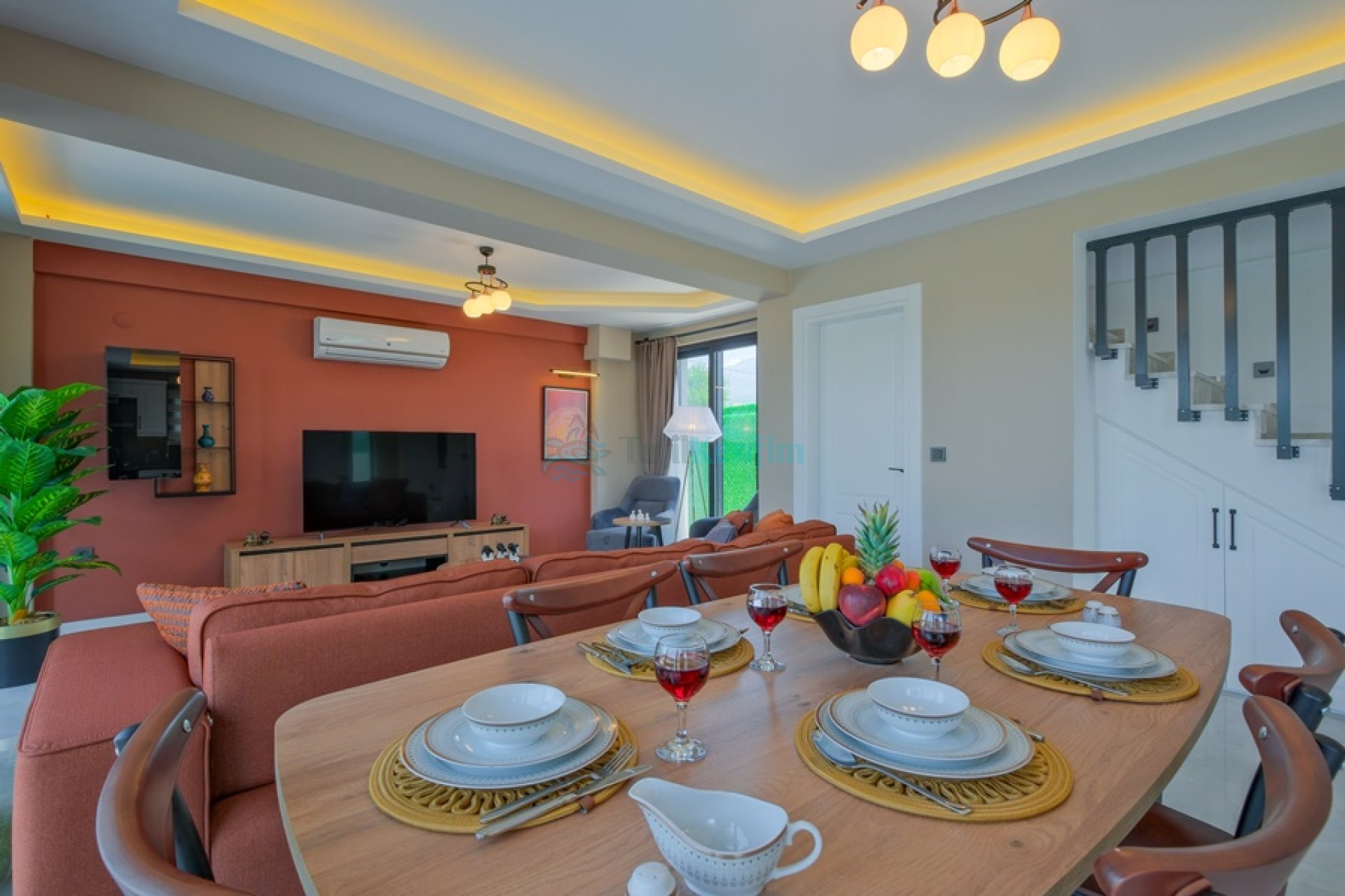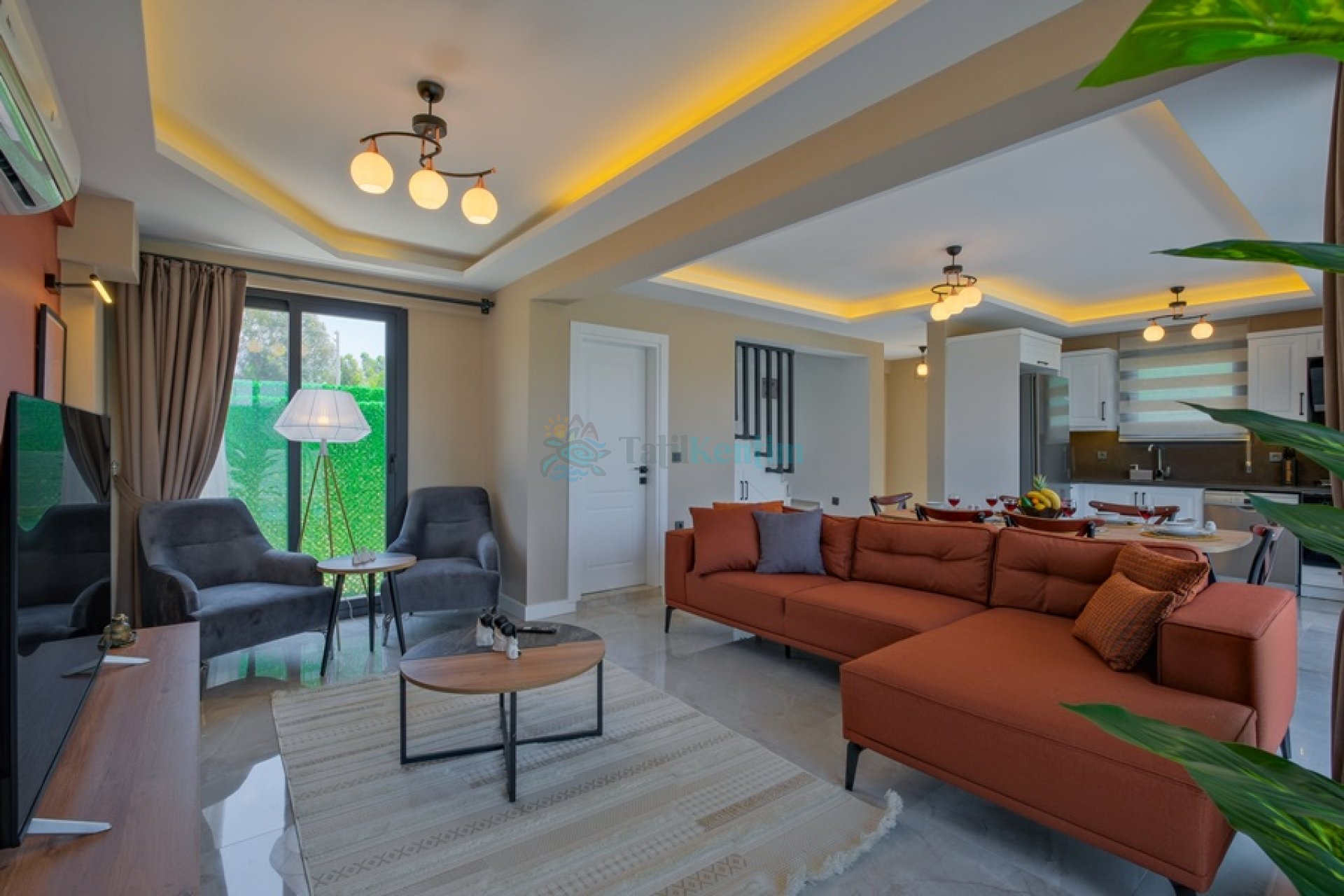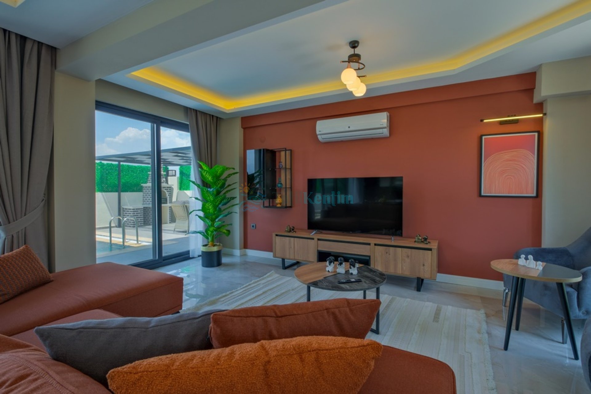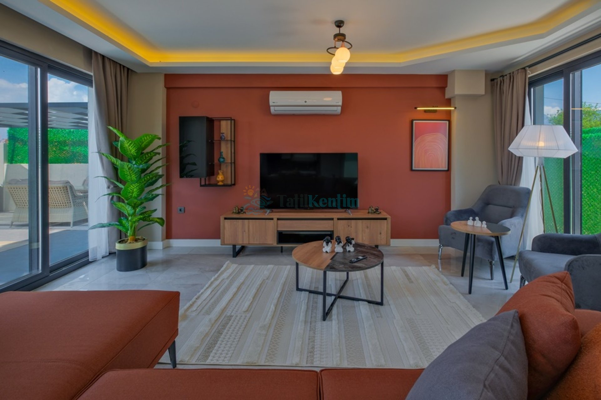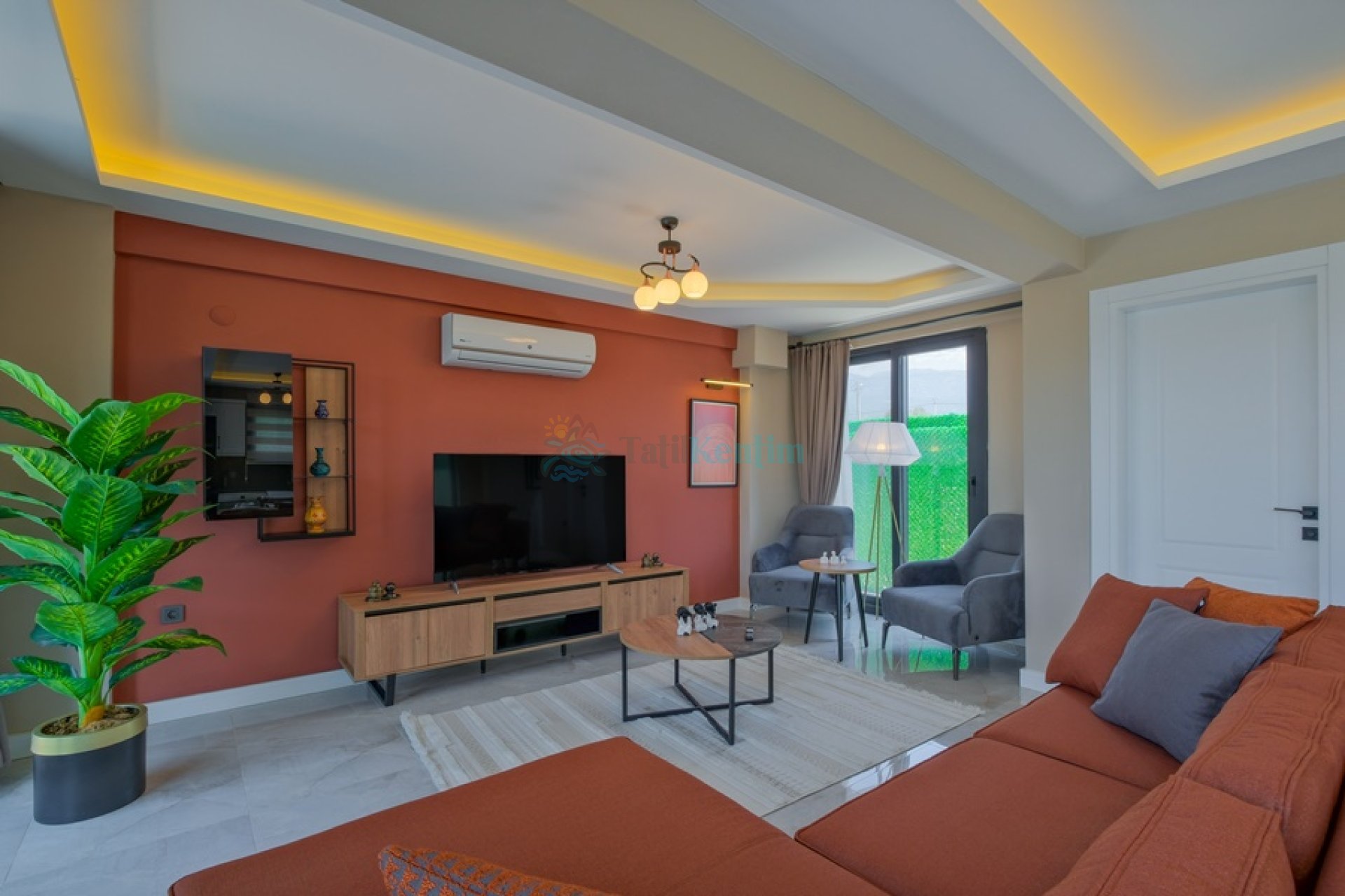 Doğa manzaralı salon içerisinde, koltuk takımı, orta sehpa, TV, TV ünitesi, klima, uydu alıcısı yer almaktadır.