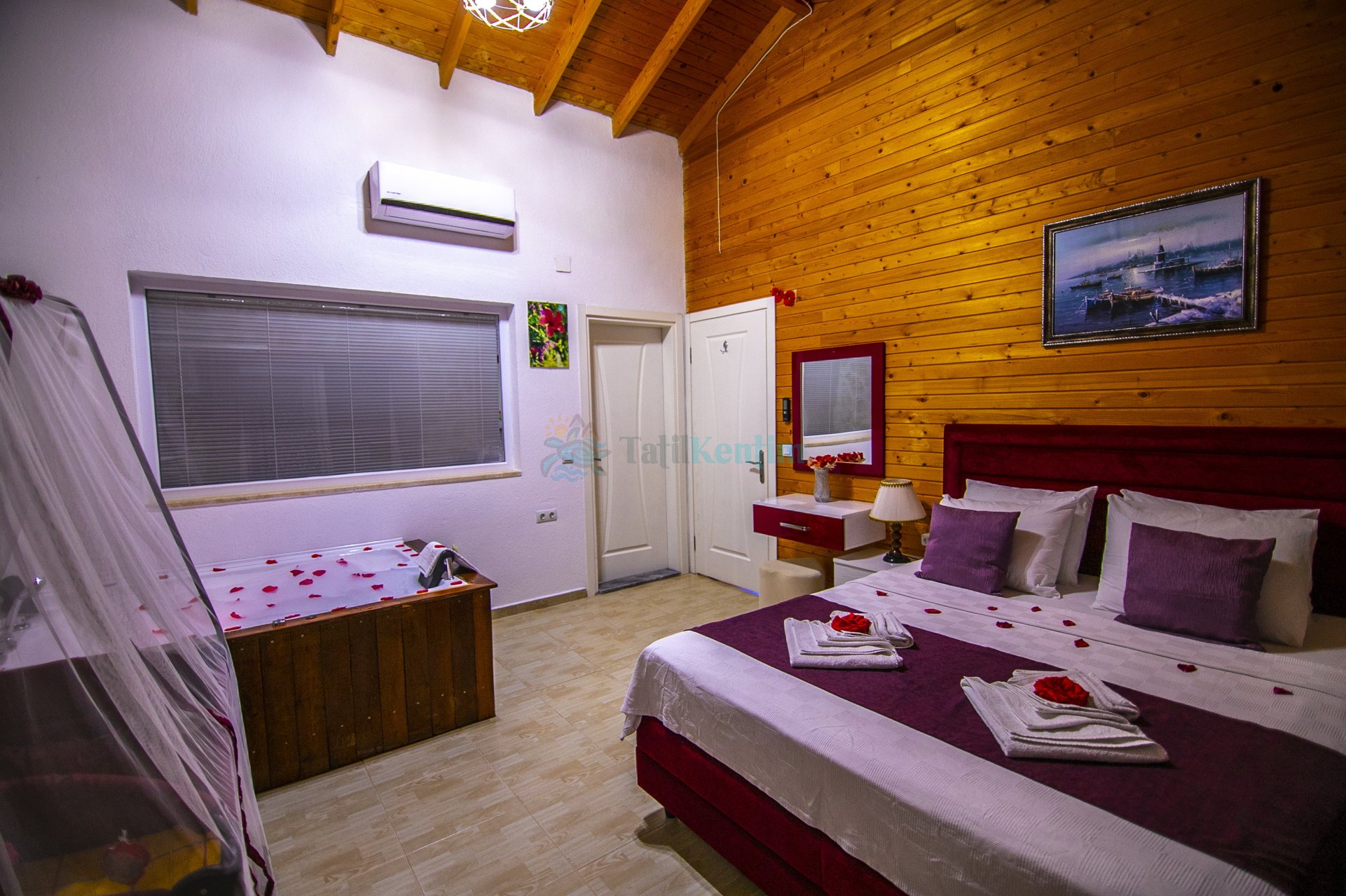 Yatak odası içerisinde, 1 adet çift kişilik yatak, klima, elbise dolabı, komodin, makyaj masası, jakuzi, banyo ve tuvalet yer almaktadır.