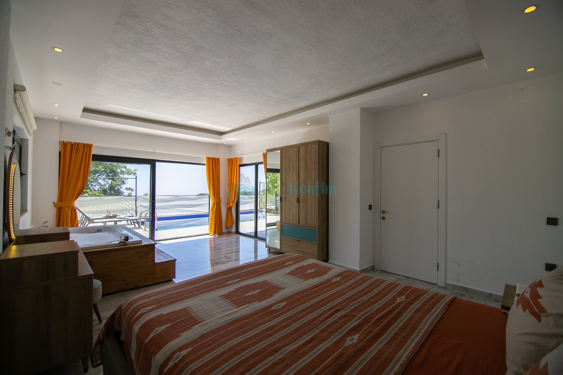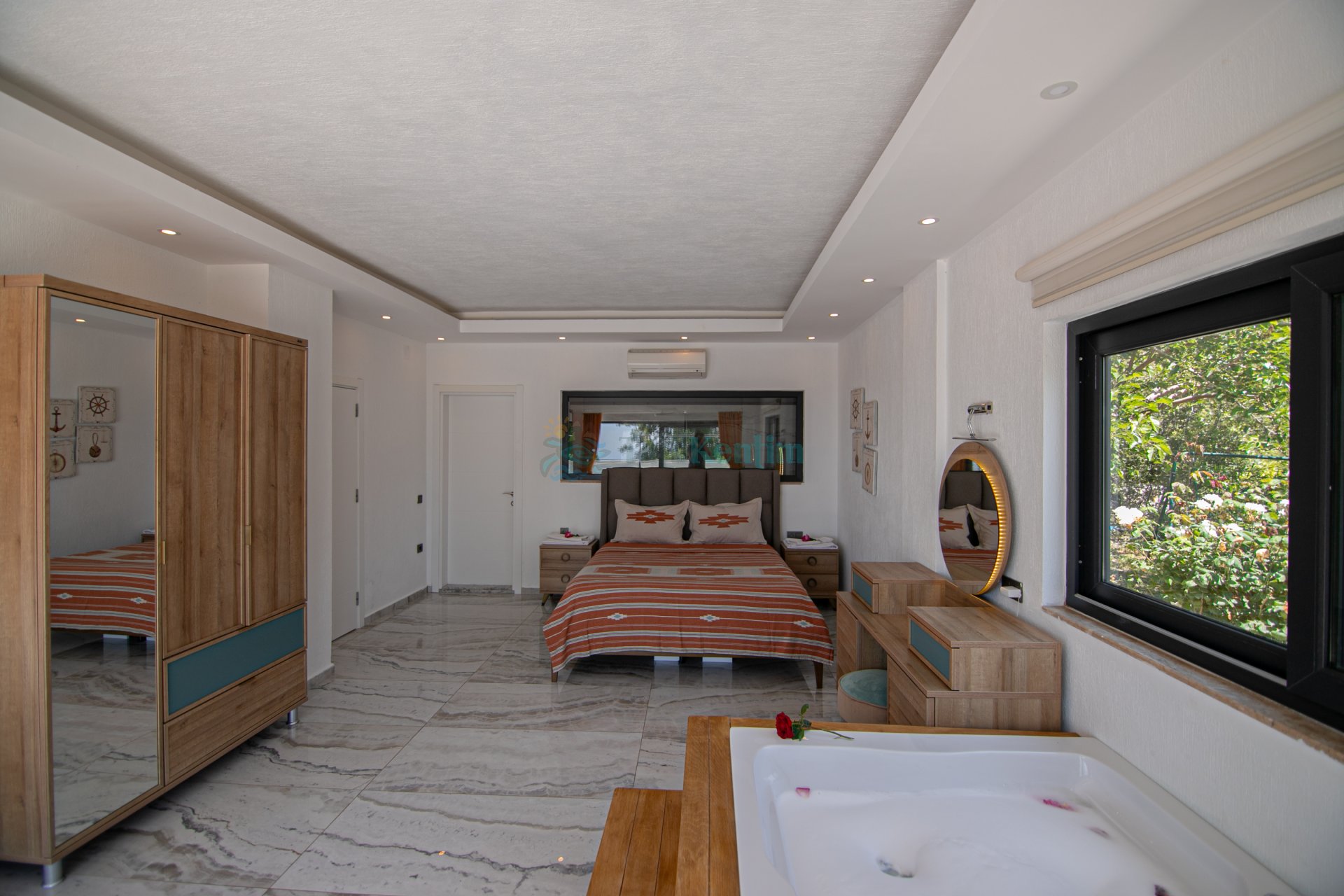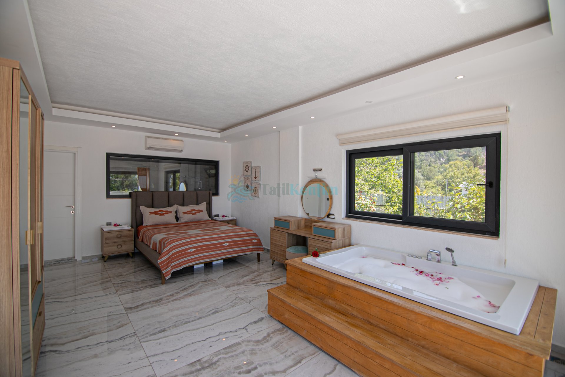 1.Yatak odası: 1 adet çift kişilik yatak, elbise dolabı, makyaj masası, komodin, klima, tv, jakuzi, banyo ve tuvalet, havuz terasına çıkış bulunmaktadır.