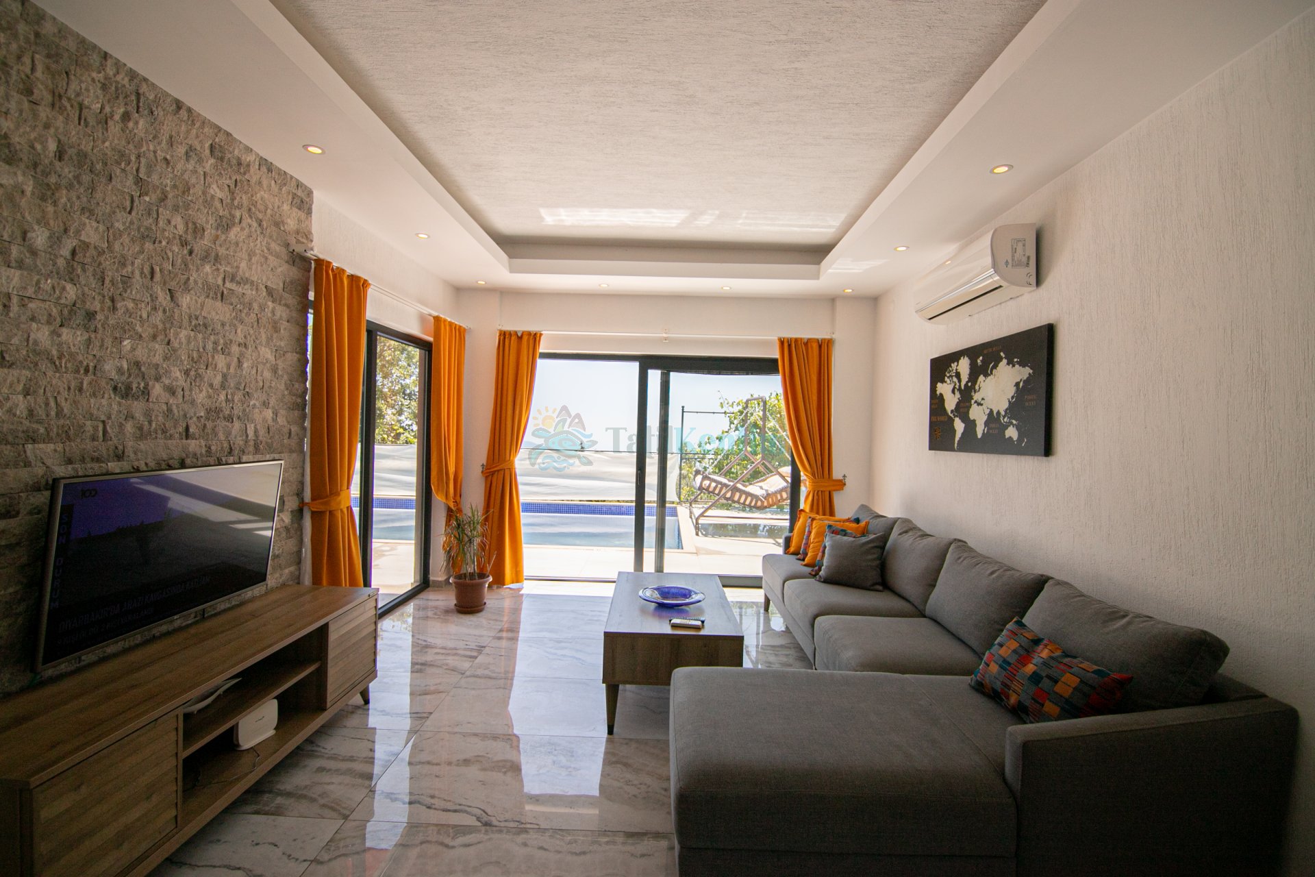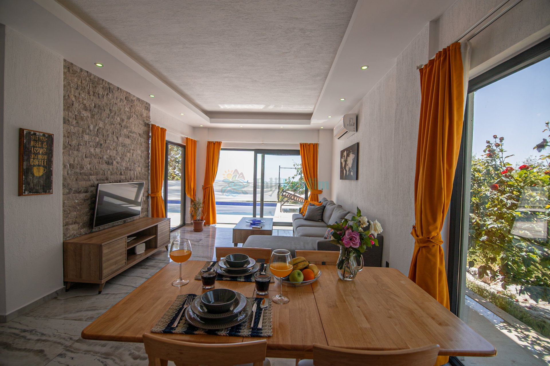 Salon: Oturma grubu, televizyon, uydu alıcısı, klima, yemek masası ve sandalyeler , havuz terasına çıkış bulunmaktadır.